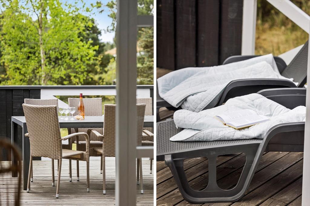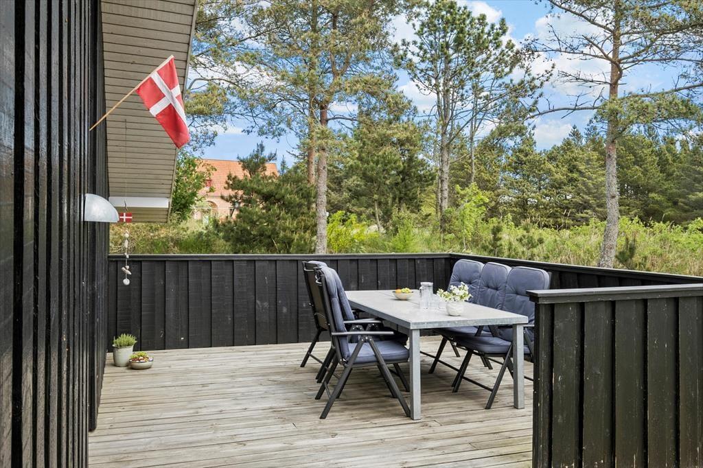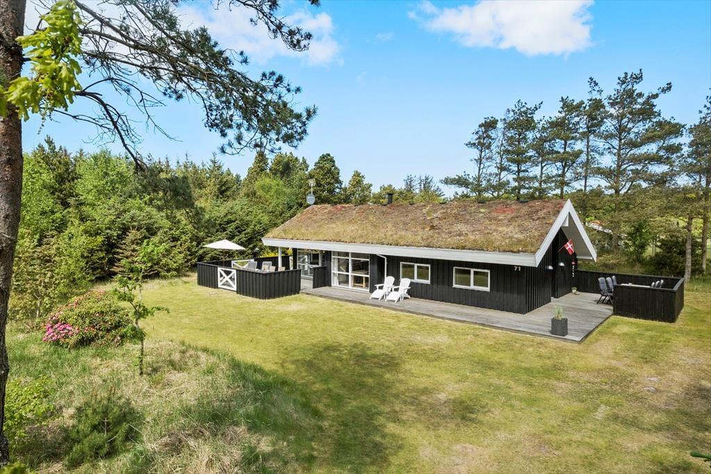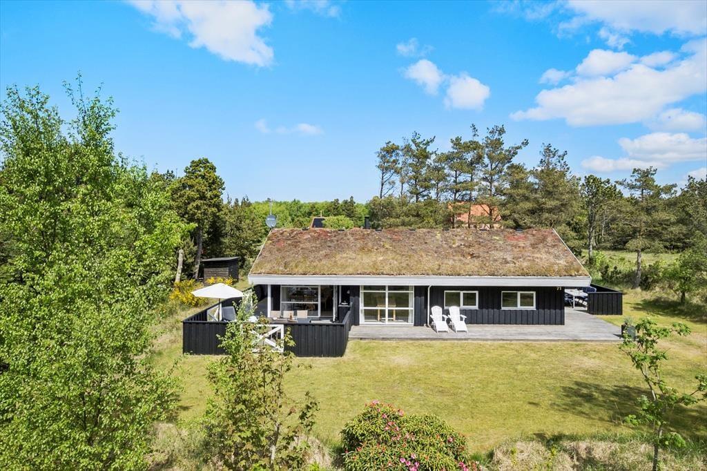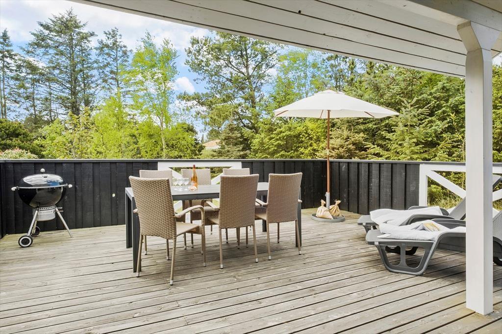 På den dejlige naturgrund har man god læ fra de høje fyrretræer, og der er rigeligt med plads til boldspil og fangeleg. Der er terrasser på tre sider af sommerhuset, så det er altid muligt at få en plads i solen. En lille del af terrassen er overdækket, her kan man nyde de lange sommeraftener, mens duggen falder. Der er derudover fri adgang til fællesareal med fodboldbane, sandkasse og gynge ca 400 meter fra huset