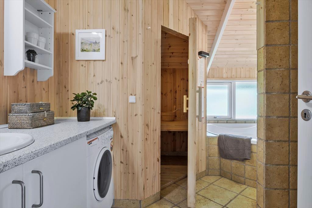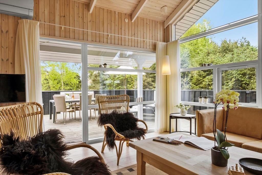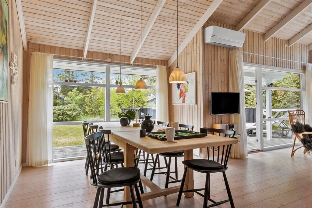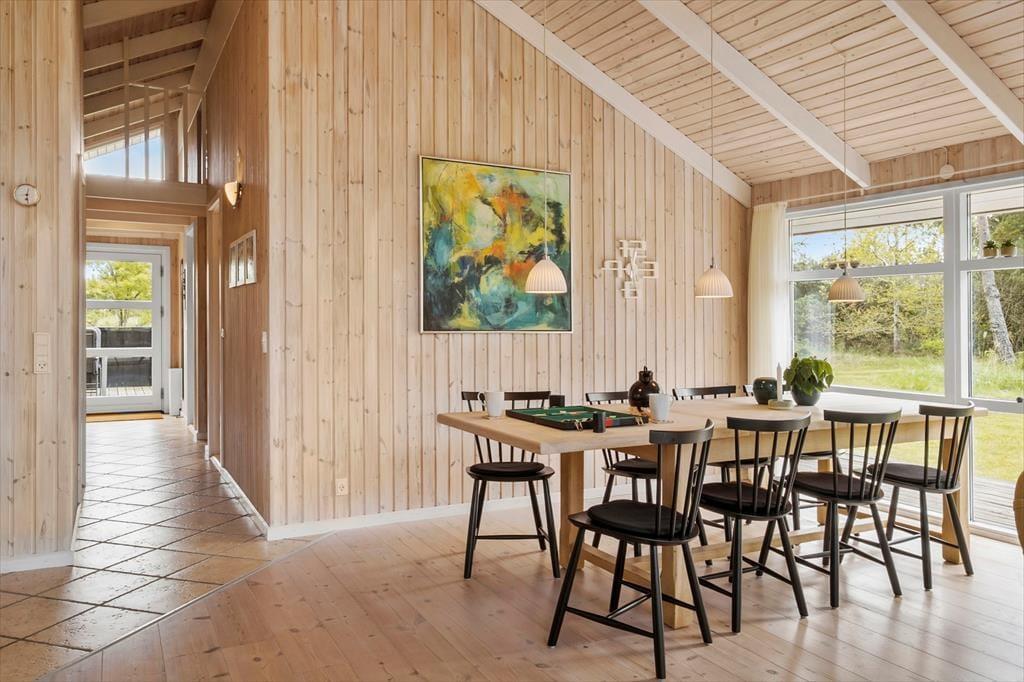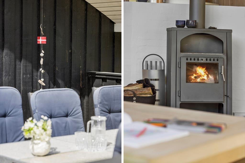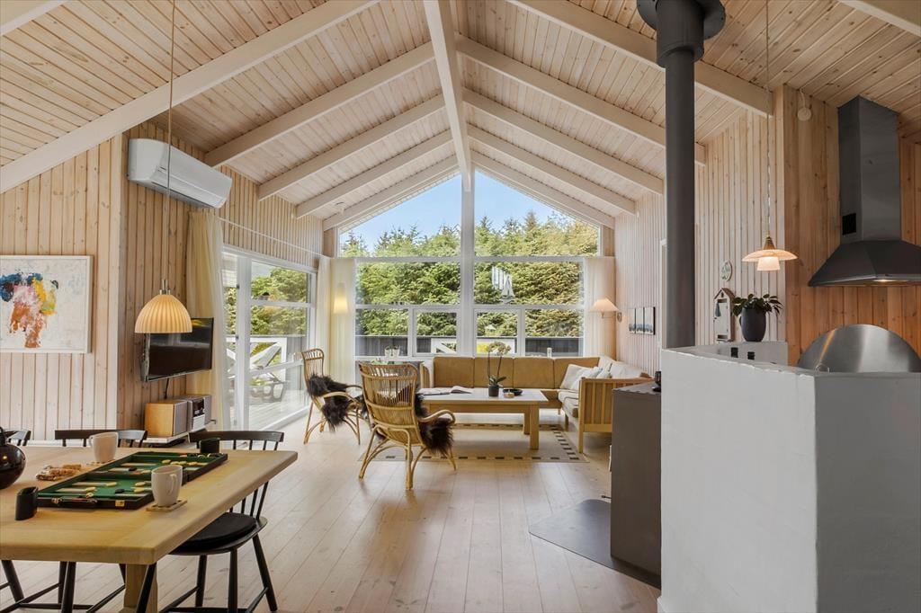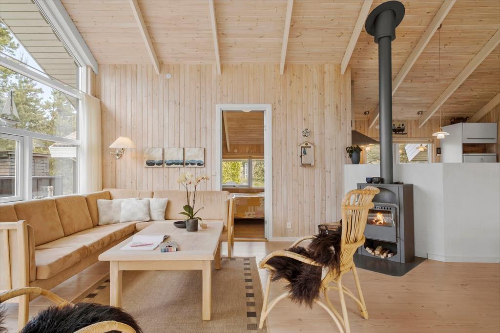 Sommerhuset er helt igennem smagfuldt indrettet med gode kvalitetsmøbler og sans for selv de mindste detaljer. Her er højt til loftet og store vinduer, som bringer lyset ind. Al tænkelig komfort i form af hårde hvidevarer, brændeovn, spabad og sauna er til stede, så man er sikret en rolig og afslappende ferie. Køkken, stue og spiseplads udgør sommerhusets naturlige samlingspunkt og med fire værelser og to badeværelser, kan man sagtens være to familier i sommerhuset. Alt i alt en skøn base for en dejlig ferie i det nordjyske.