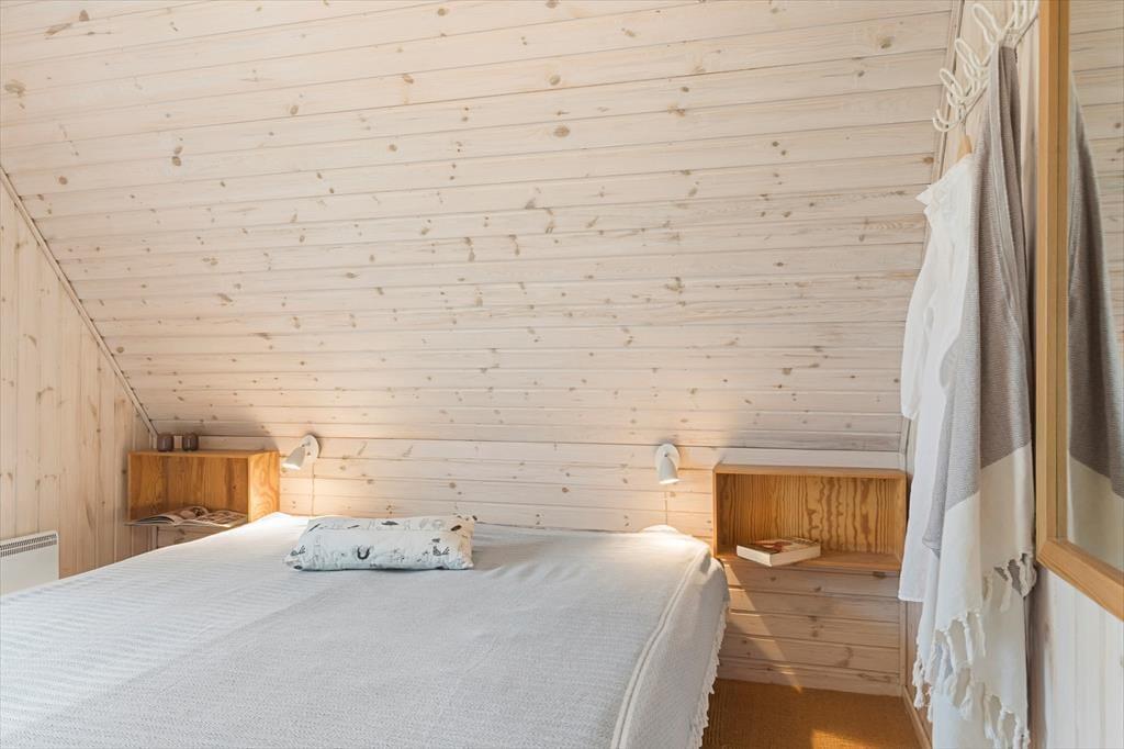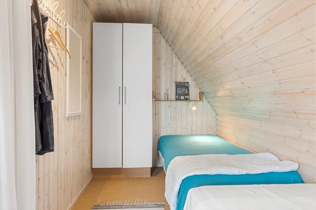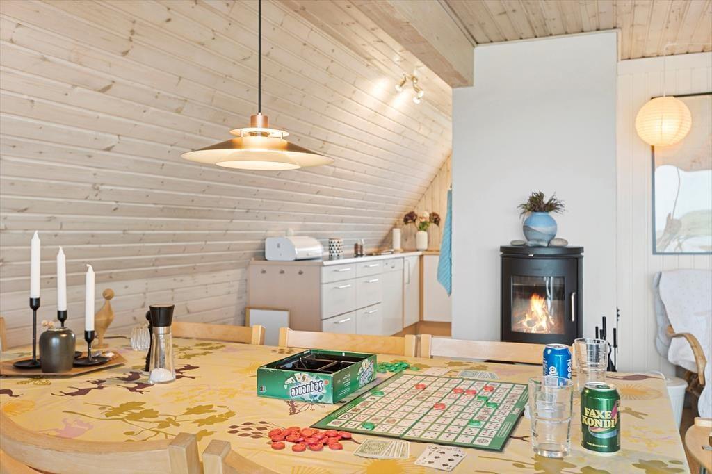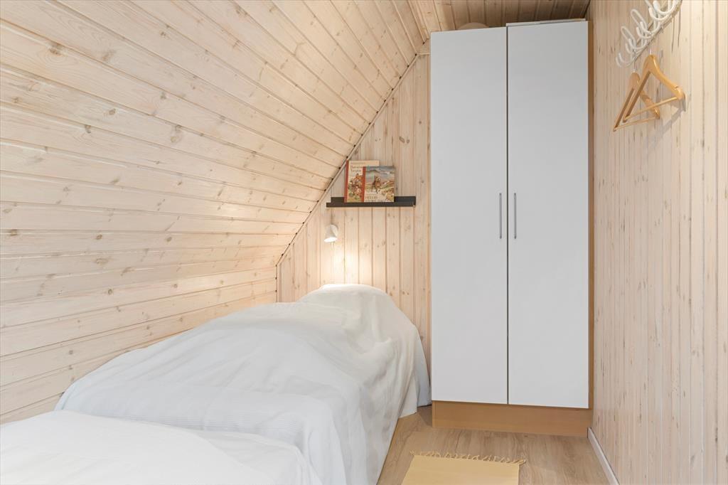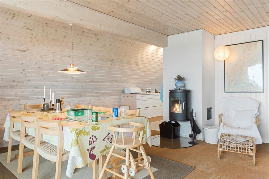 Indenfor mødes du af et lyst og indbydende opholdsrum med store vinduespartier, der trækker naturens grønne farver og lyset ind. Brændeovnen skaber en varm og hyggelig atmosfære, perfekt til stille stunder med en god bog eller en kop kaffe. Stuen er indrettet med komfortable møbler, der indbyder til afslapning og samvær. De tre soveværelser – to med enkeltsenge og ét med dobbeltseng – er holdt i rolige farver og enkle linjer, hvilket understøtter husets afslappede stemning. Det ene værelse har desuden en alkove, hvor børnene kan hygge sig med film eller spil.