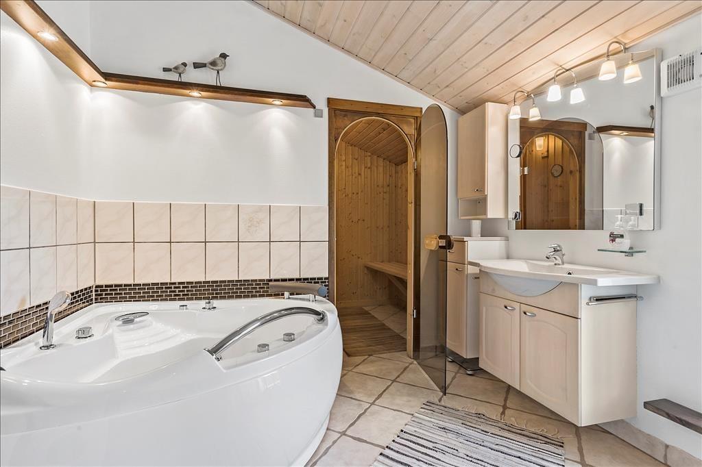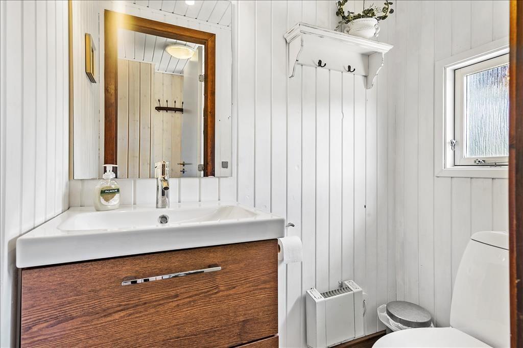 Indenfor mødes du af en lys og indbydende stue med brændeovn, hvor du kan slappe af efter en dag i naturen. Køkkenet er funktionelt og åbent mod spiseområdet, hvilket gør det nemt at tilberede måltider sammen. Huset har fire soveværelser, der giver plads til op til syv personer, og to badeværelser, hvoraf det ene er udstyret med både spabad og sauna – perfekt til afslapning efter en aktiv dag.