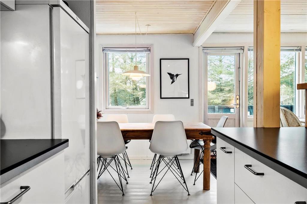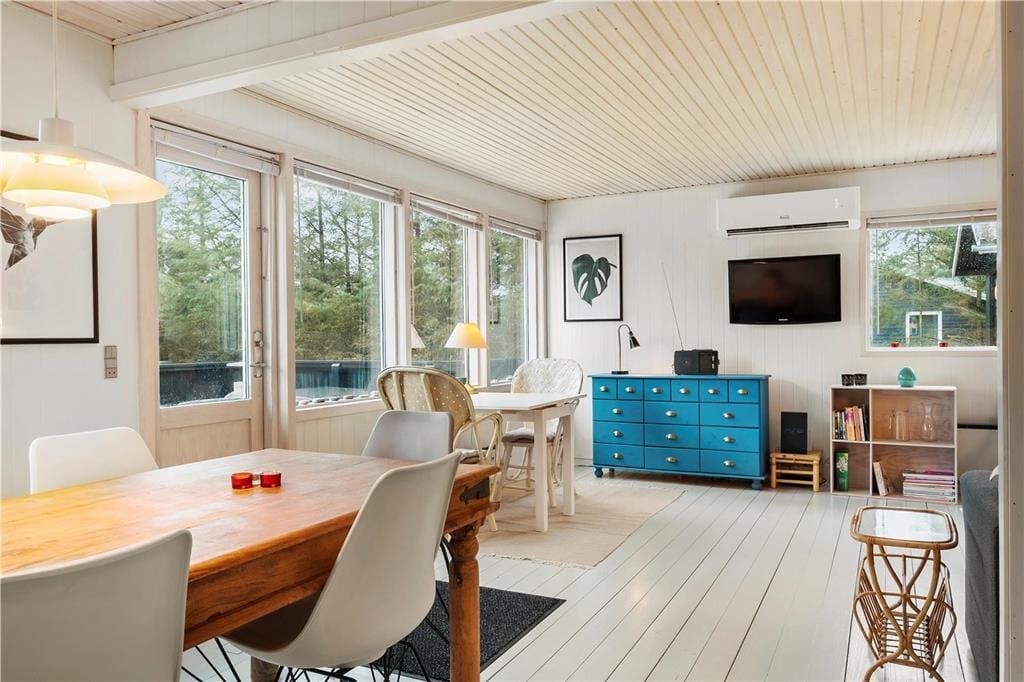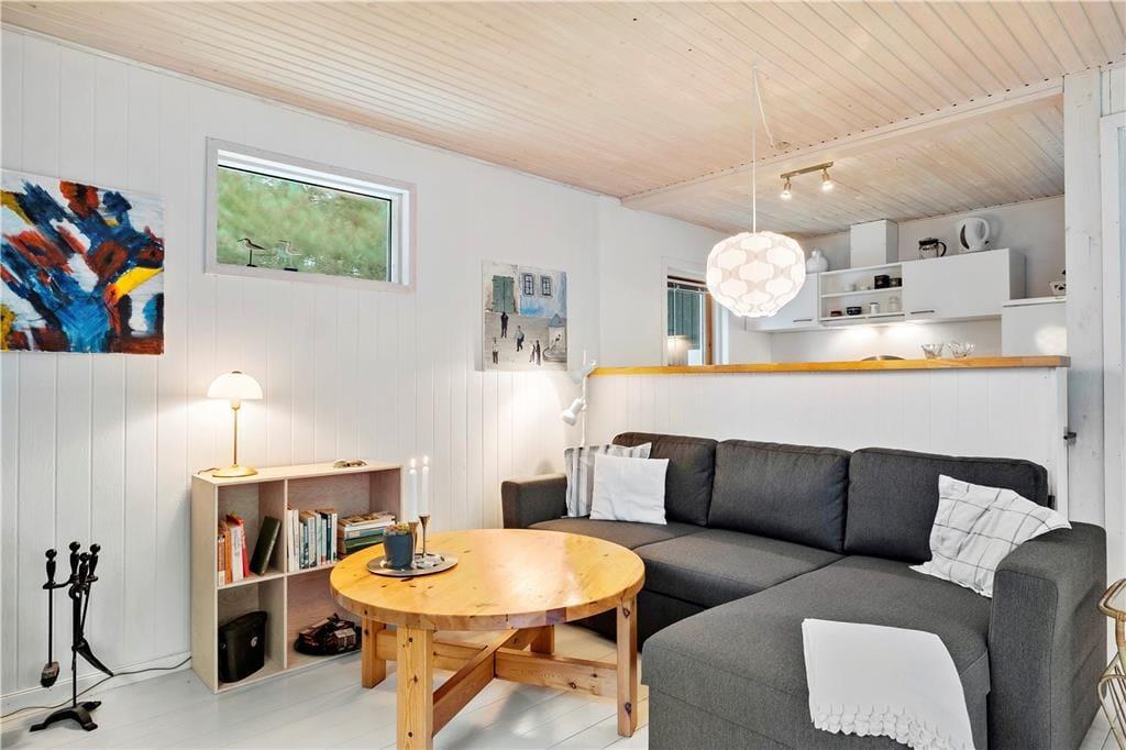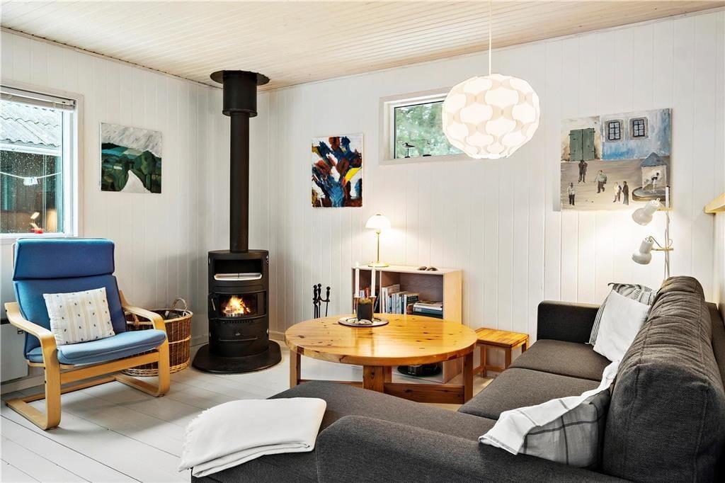Når I træder indenfor i sommerhuset, bliver I mødt af et åbent og lyst køkken-alrum, hvor I kan samles og tilberede feriens måltider. Den hyggelige stue med brændeovn skaber en varm og indbydende stemning, perfekt til de køligere aftener, hvor I kan slappe af med et godt brætspil eller en film. Sommerhuset emmer af en særlig feriefornemmelse, hvor alle kan finde deres egen lille hyggekrog. Den åbne planløsning gør, at alle kan være sammen, samtidig med at man stadig har mulighed for at trække sig tilbage og nyde et øjebliks ro.