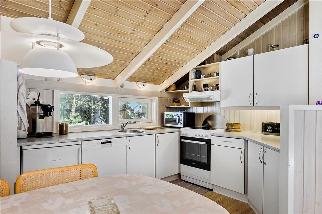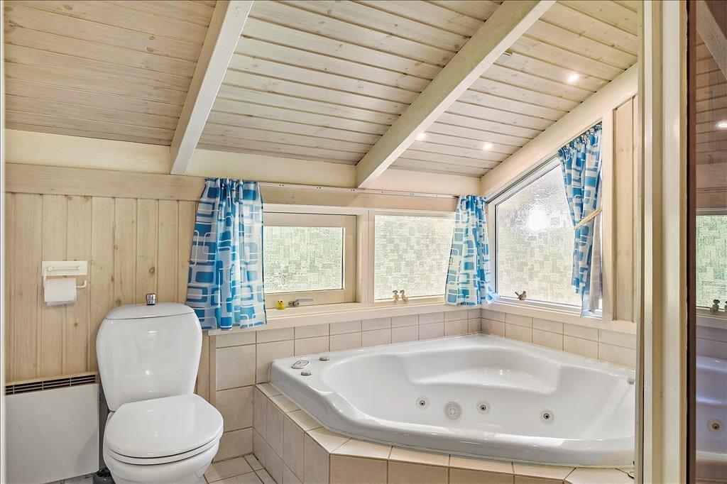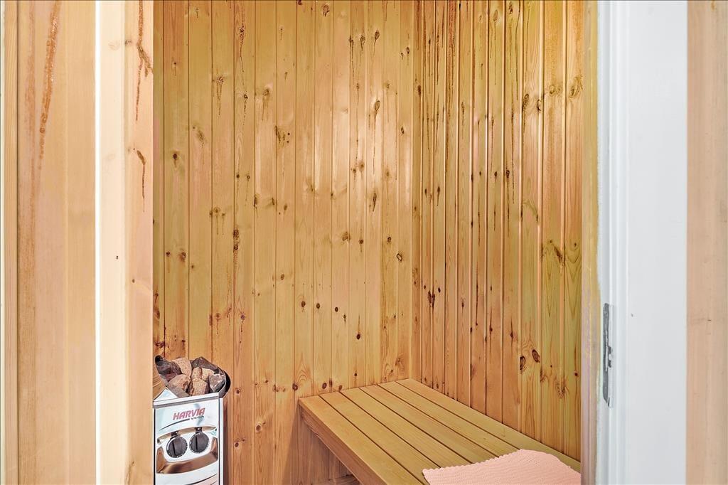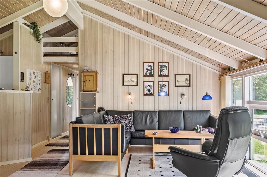 Indendørs byder sommerhuset på en hyggelig og rummelig stue, hvor hele familien kan samles omkring brændeovnen og nyde et spil brætspil eller en god film. Her er plads til både afslapning og fælles aktiviteter. De store vinduer giver et dejligt lysindfald og en skøn udsigt til naturen omkring huset. Køkkenet er praktisk indrettet, så I nemt kan lave måltider sammen. Når maden er klar, kan I samles om spisebordet, som er perfekt til familiens måltider. Sommerhusets badeværelse er også en oplevelse i sig selv, hvor I kan forkæle jer selv med en tur i saunaen eller slappe af i spabadet efter en aktiv dag ude i naturen.