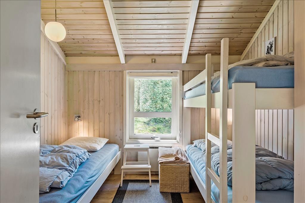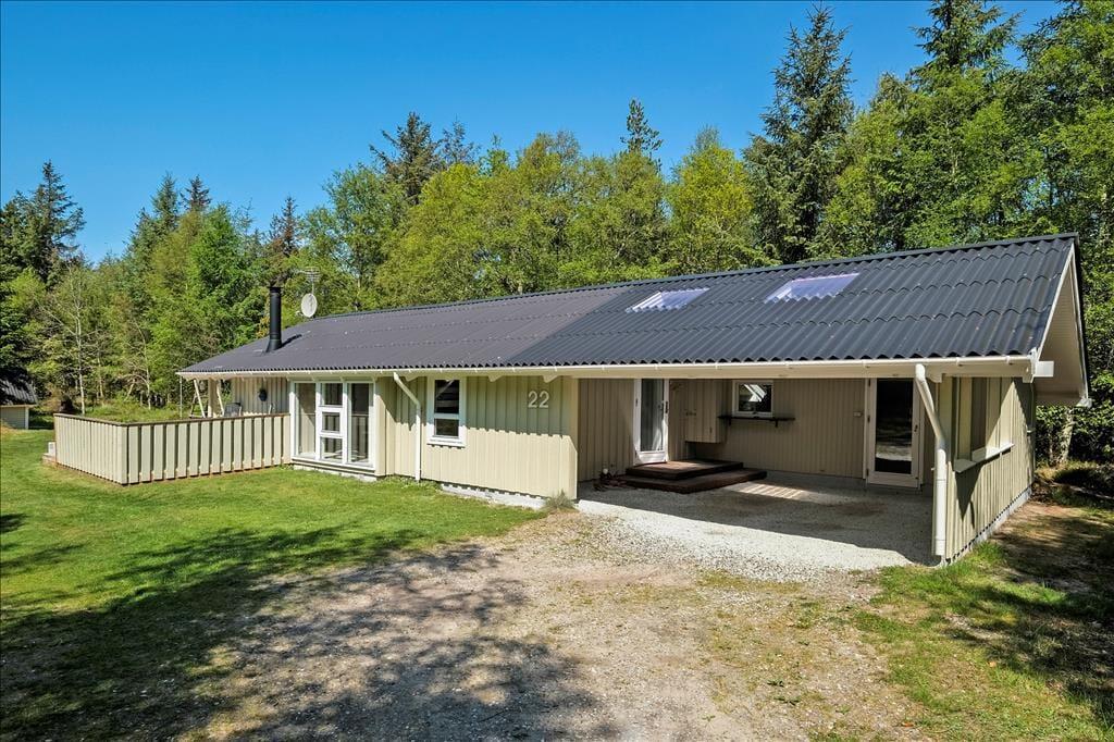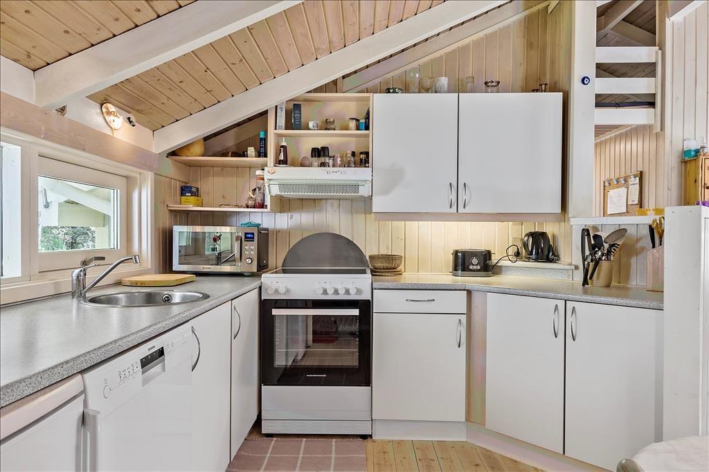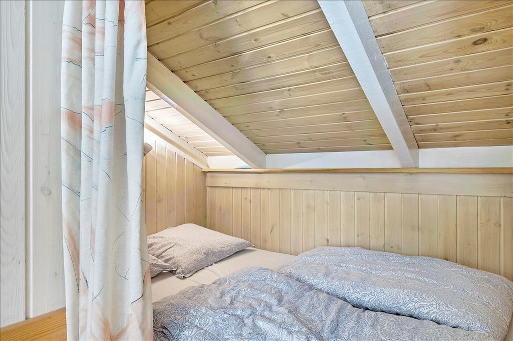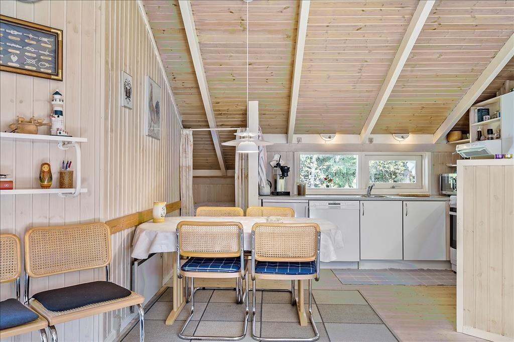 Indendørs byder sommerhuset på en hyggelig og rummelig stue, hvor hele familien kan samles omkring brændeovnen og nyde et spil brætspil eller en god film. Her er plads til både afslapning og fælles aktiviteter. De store vinduer giver et dejligt lysindfald og en skøn udsigt til naturen omkring huset. Køkkenet er praktisk indrettet, så I nemt kan lave måltider sammen. Når maden er klar, kan I samles om spisebordet, som er perfekt til familiens måltider. Sommerhusets badeværelse er også en oplevelse i sig selv, hvor I kan forkæle jer selv med en tur i saunaen eller slappe af i spabadet efter en aktiv dag ude i naturen.
