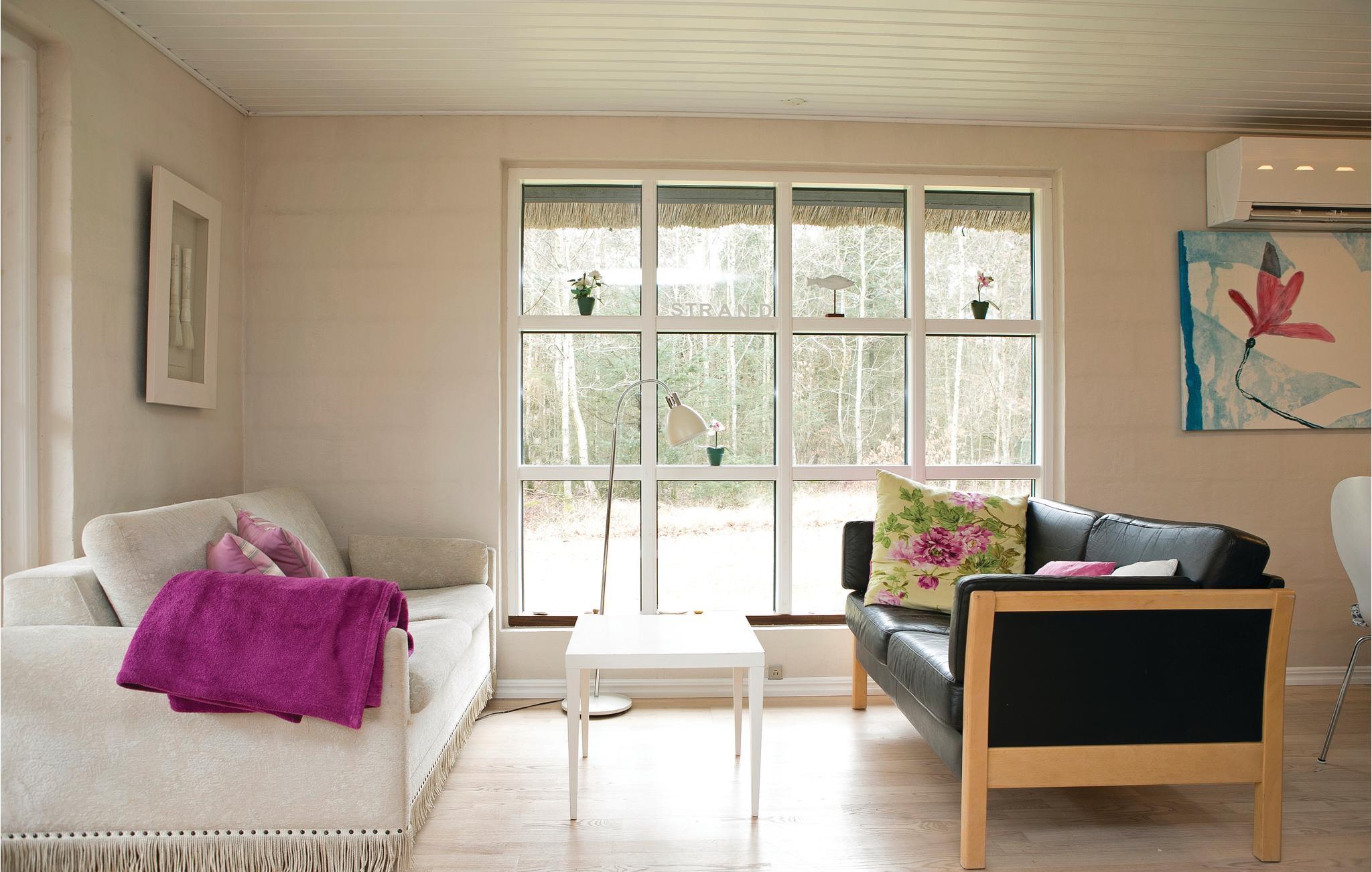 Hyggeligt sommerhus i Rødhus med lys stue, store vinduer og store terrasser på en stor naturgrund.