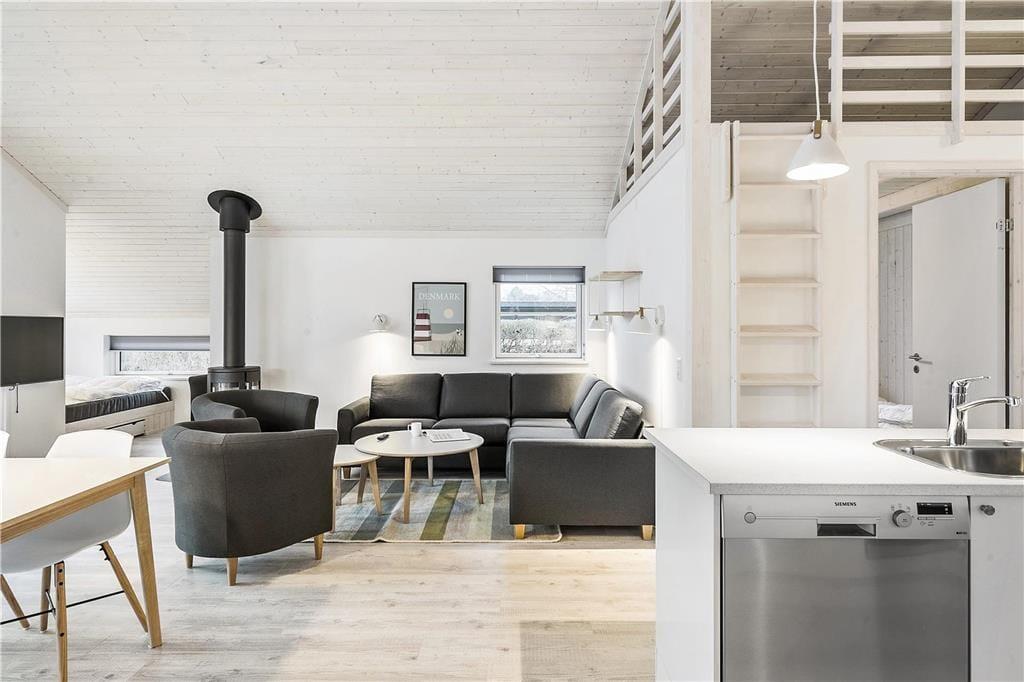 I stuen er der dejligt sofahjørne med hjørnesofa, sofaborde og lænestole. Spiseplads. TV og internet (Vær opmærksom på der kun er streaming). Fra stuen udgang til skøn, delvis over dækket vestvendt træterrasse med havemøbler. I forbindelse stuen er der en hyggelig alkove med 2 gode sovepladser. Brændeovn og varmepumpe i stuen.