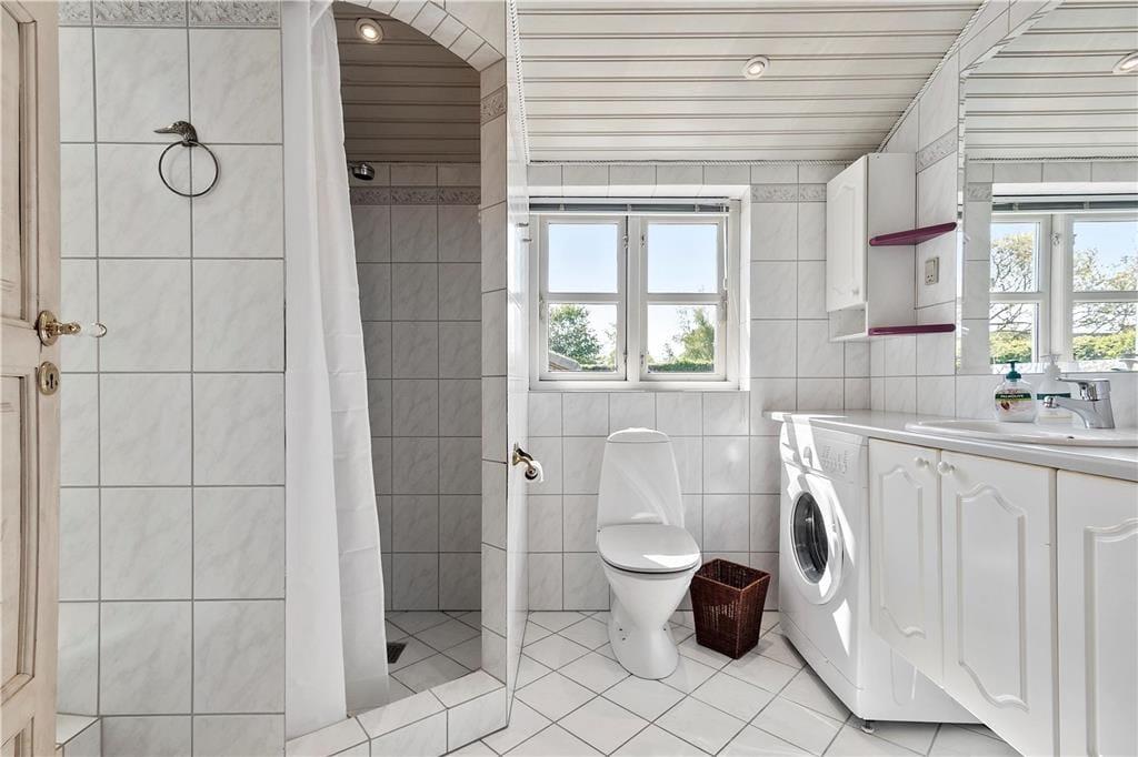 Indgang til pænt, lyst og rummeligt badeværelse med toilet, håndvask, bruseniche og vaskemaskine.