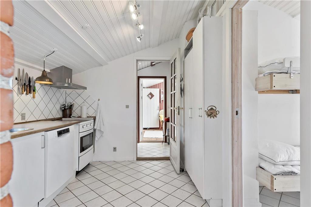 Pænt køkken med elkomfur med 4 kogeplader, mikroovn, elkedel, kaffemaskine, opvaskemaskine, køleskab samt alt øvrigt service og køkkengrej. Fryser i skur/udhus for enden af carporten.
