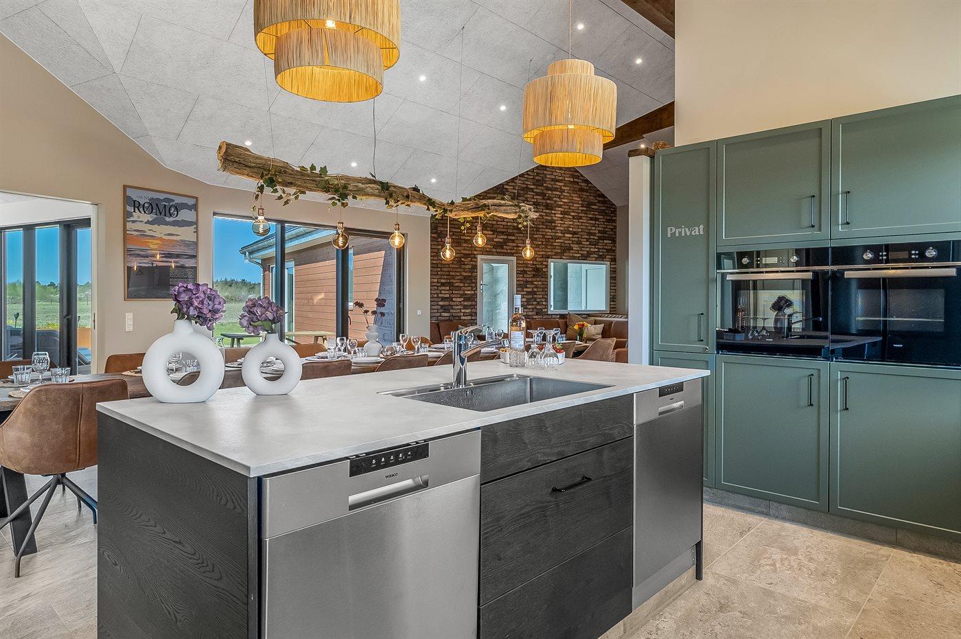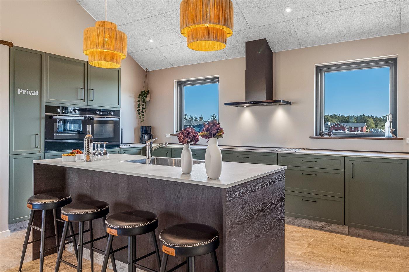 Sommerhuset byder på et åbent og rummeligt køkkenalrum, der er perfekt til samvær og madlavning. Her er højt til loftet og masser af plads til at tilberede lækre måltider sammen. Køkkenet er udstyret med moderne faciliteter, såsom 2 opvaskemaskiner, 2 køleskabe og 2 ovne og der er god plads til at samles omkring køkkenøen eller det store spisebord. Den åbne forbindelse til stuen skaber en lys og indbydende atmosfære og i stuen finder I en hyggelig alkove, hvor man kan trække sig tilbage og slappe af med en god bog eller en film.