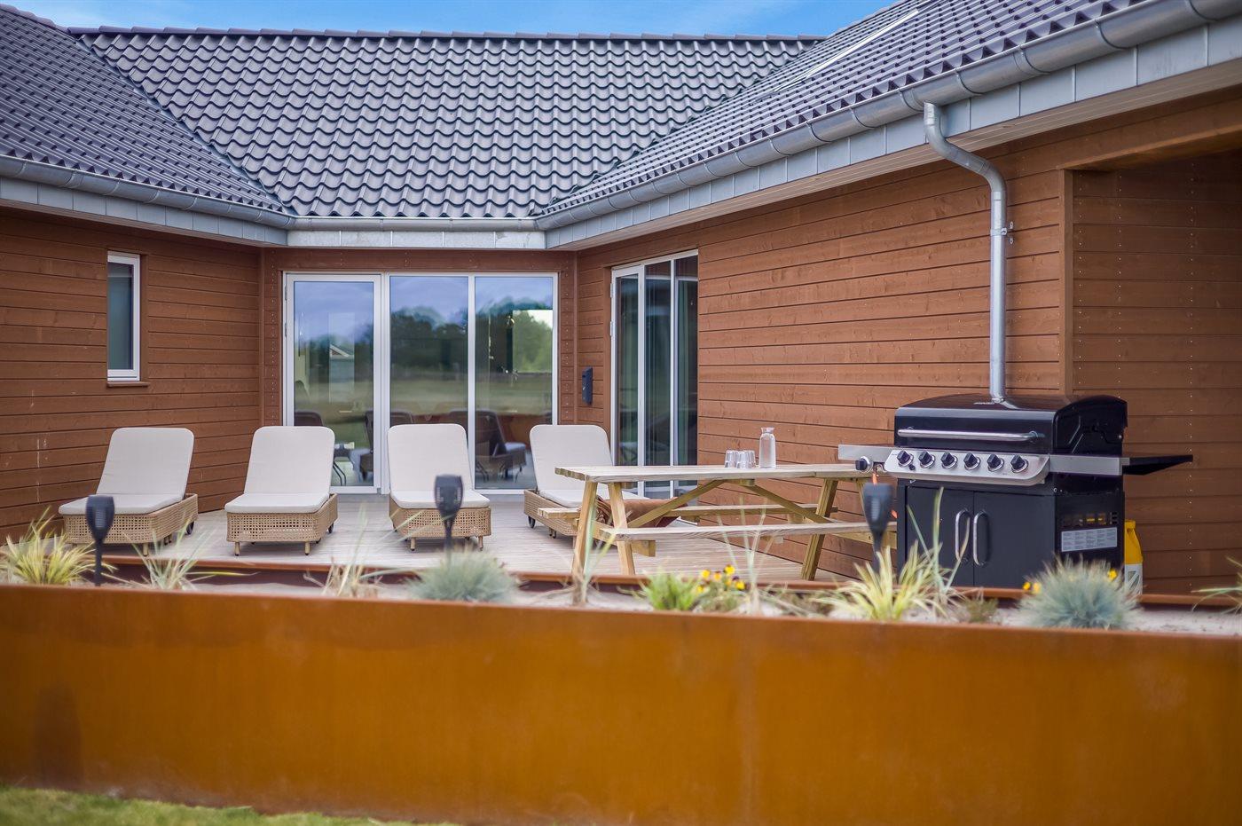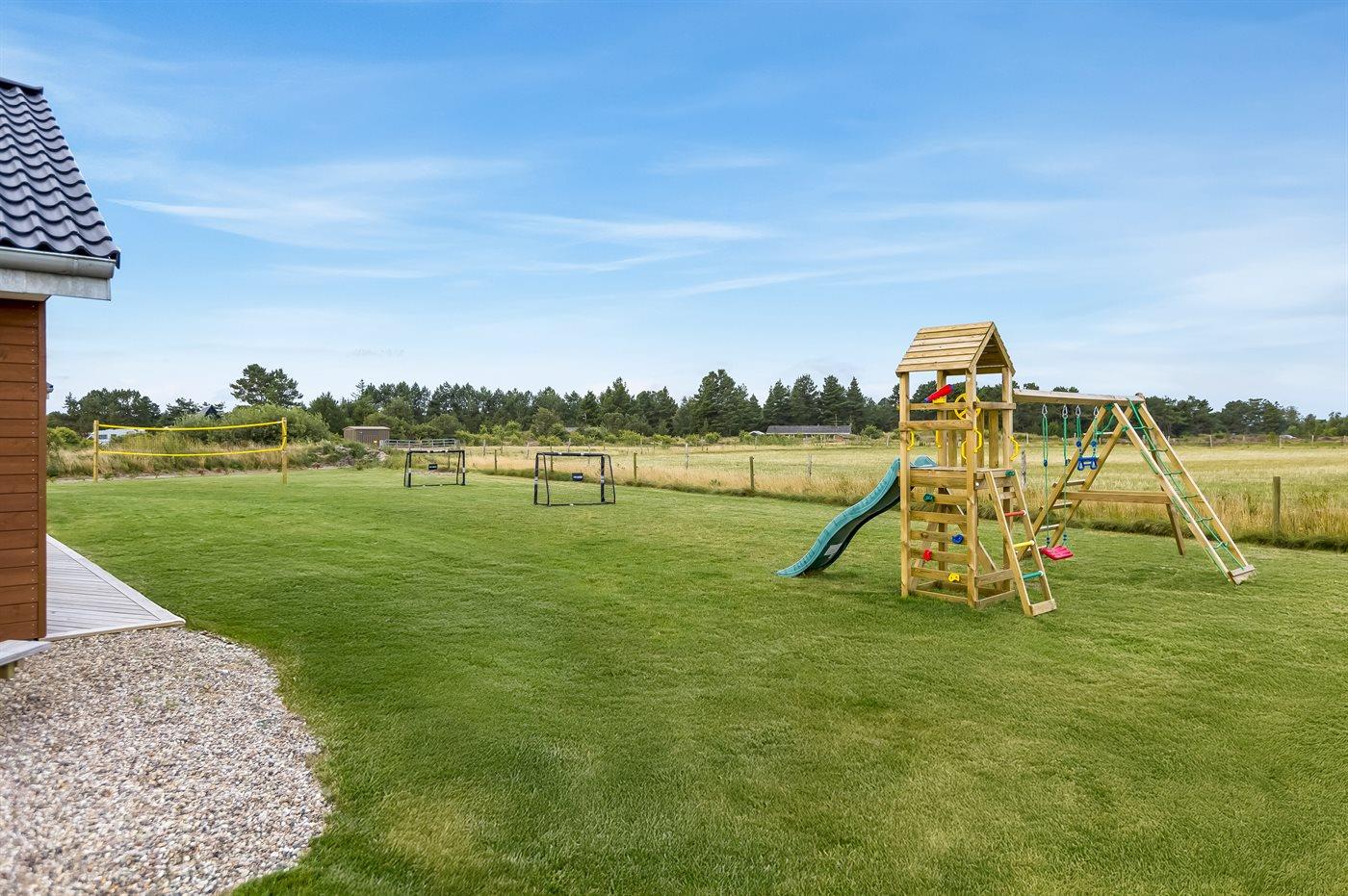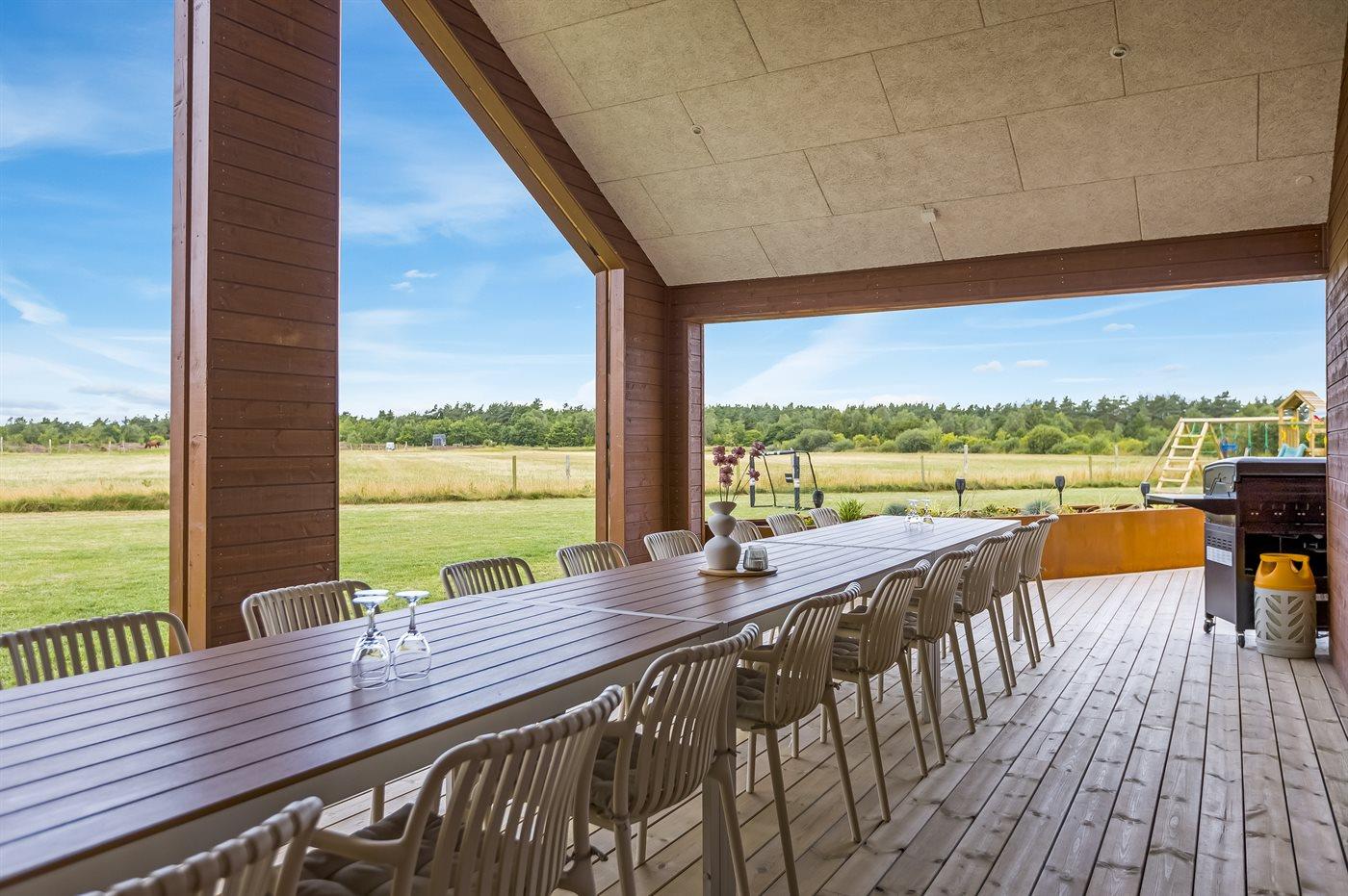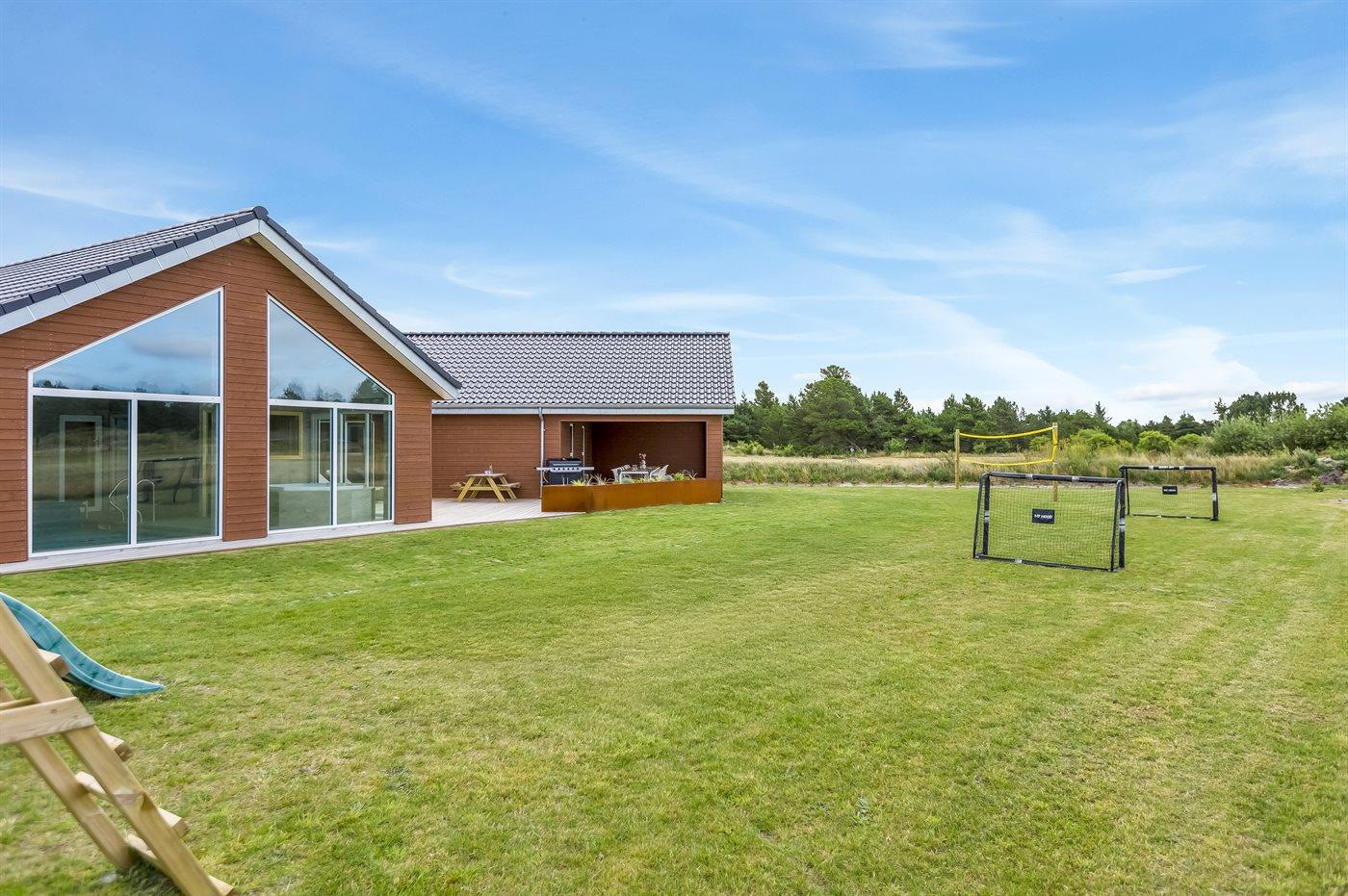 Udenfor er der masser af plads til leg og afslapning. Den store grund er perfekt til børnene og de firbenede i familien - her finder I både et legetårn, volleyballnet og fodboldmål, hvor man kan udfolde sig og have det sjovt – hvad enten man er til det ene eller det andet. Mellem pool-området og aktivitetsrummet ligger en stor sydvendt terrasse med mulighed for komme ud fra både aktivitetsrum, køkken-alrum samt pool-område. Den overdækkede terrasse giver mulighed for at sidde i læ og nyde middagen eller en god samtale, selv når vejret ikke er helt med os. Derudover står der en gasgrill på terrassen, så der kan blive grillet. På den store gårdsplads er der god plads til parkering af flere biler, her er der installeret type 2 stik til opladning af elbil.