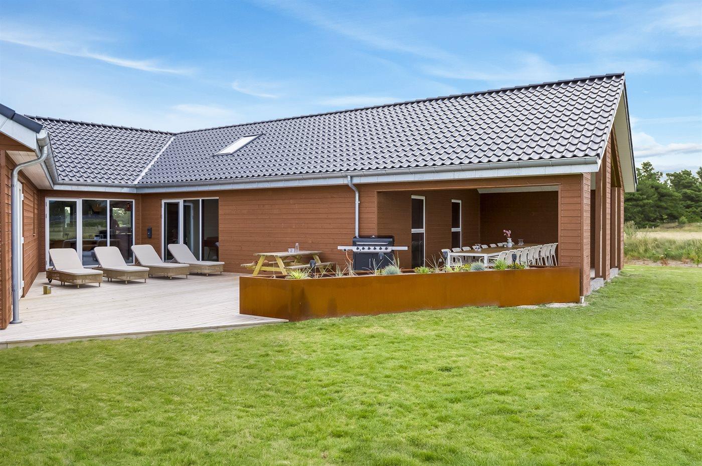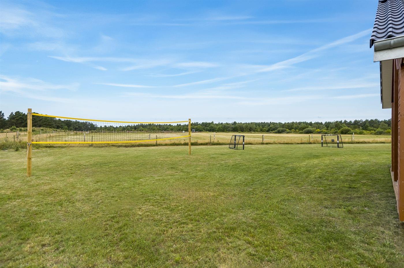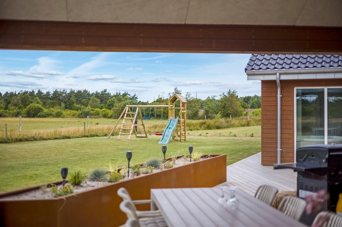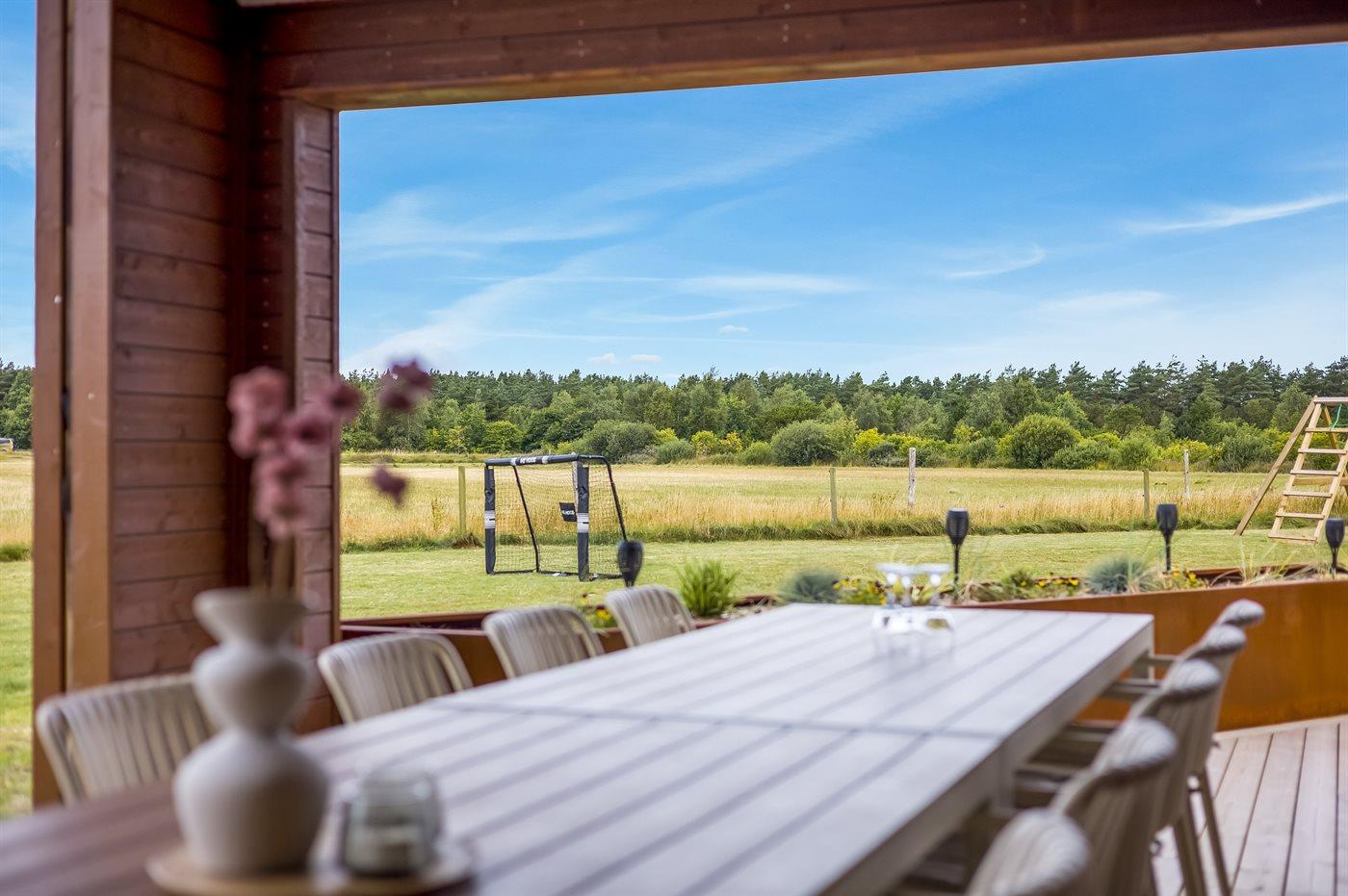 Udenfor er der masser af plads til leg og afslapning. Den store grund er perfekt til børnene og de firbenede i familien - her finder I både et legetårn, volleyballnet og fodboldmål, hvor man kan udfolde sig og have det sjovt – hvad enten man er til det ene eller det andet. Mellem pool-området og aktivitetsrummet ligger en stor sydvendt terrasse med mulighed for komme ud fra både aktivitetsrum, køkken-alrum samt pool-område. Den overdækkede terrasse giver mulighed for at sidde i læ og nyde middagen eller en god samtale, selv når vejret ikke er helt med os. Derudover står der en gasgrill på terrassen, så der kan blive grillet. På den store gårdsplads er der god plads til parkering af flere biler, her er der installeret type 2 stik til opladning af elbil.