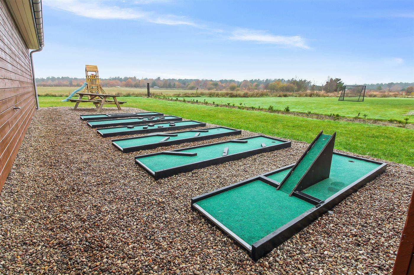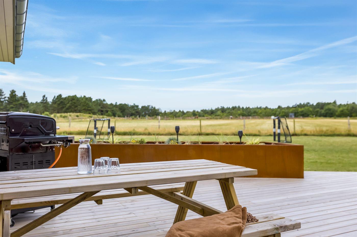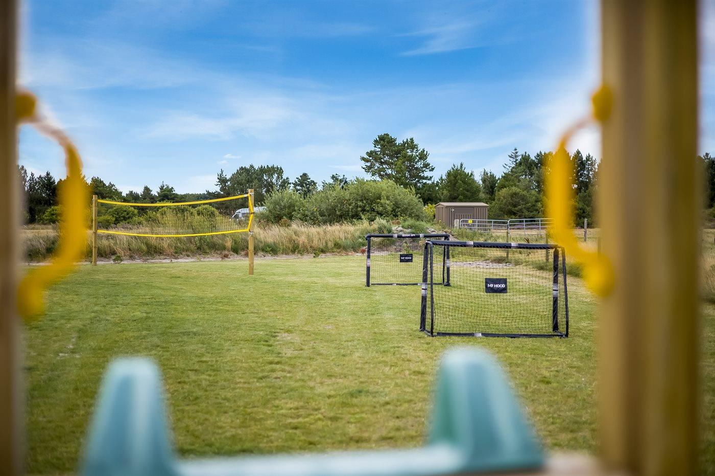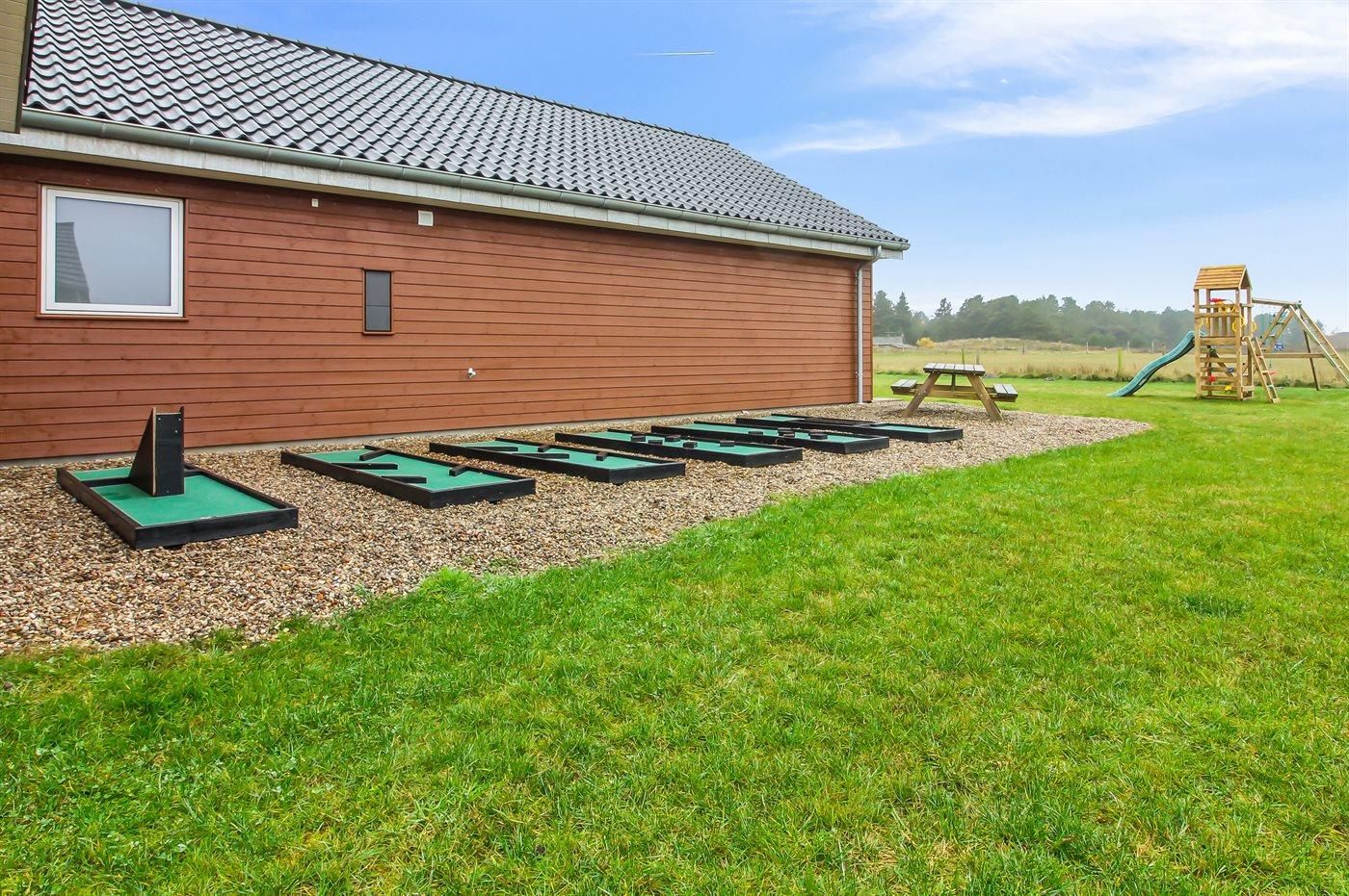 Udenfor er der masser af plads til leg og afslapning. Den store grund er perfekt til børnene og de firbenede i familien - her finder I både et legetårn, volleyballnet og fodboldmål, hvor man kan udfolde sig og have det sjovt – hvad enten man er til det ene eller det andet. Mellem pool-området og aktivitetsrummet ligger en stor sydvendt terrasse med mulighed for komme ud fra både aktivitetsrum, køkken-alrum samt pool-område. Den overdækkede terrasse giver mulighed for at sidde i læ og nyde middagen eller en god samtale, selv når vejret ikke er helt med os. Derudover står der en gasgrill på terrassen, så der kan blive grillet. På den store gårdsplads er der god plads til parkering af flere biler, her er der installeret type 2 stik til opladning af elbil.