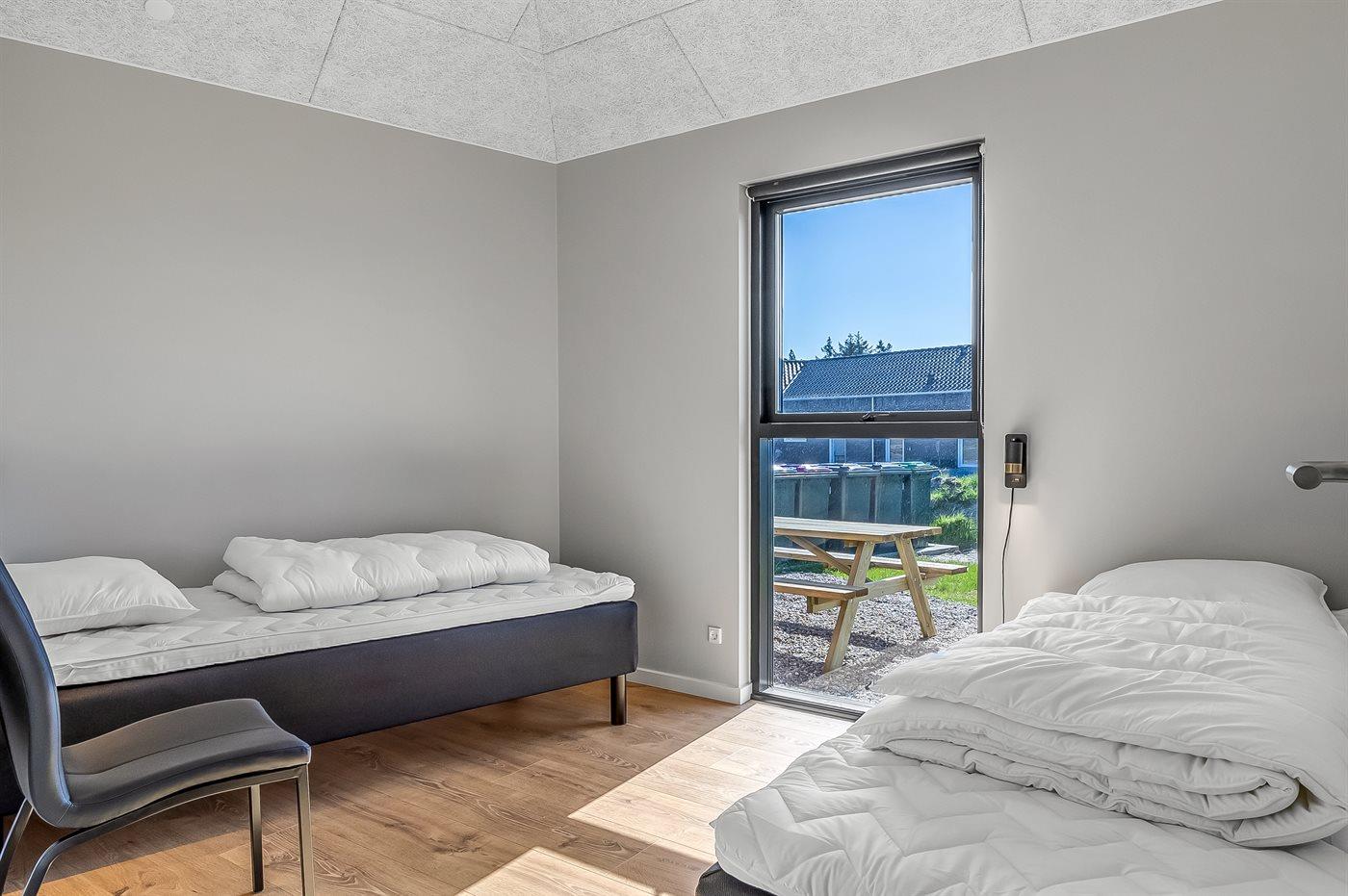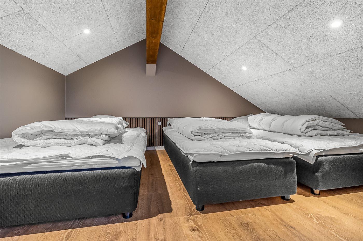 Huset har 7 rummelige værelser, hvoraf 5 af værelserne er indrettet med komfortable dobbeltsenge, og de sidste 2 værelser er med komfortable enkeltsenge. Derudover er der 2 hyggelige hemse – den ene med plads til 3 personer og den anden med plads til 2 personer. Her er masser af plads til at nyde hinandens selskab, mens I slapper af i de hyggelige, lyse og moderne omgivelser.