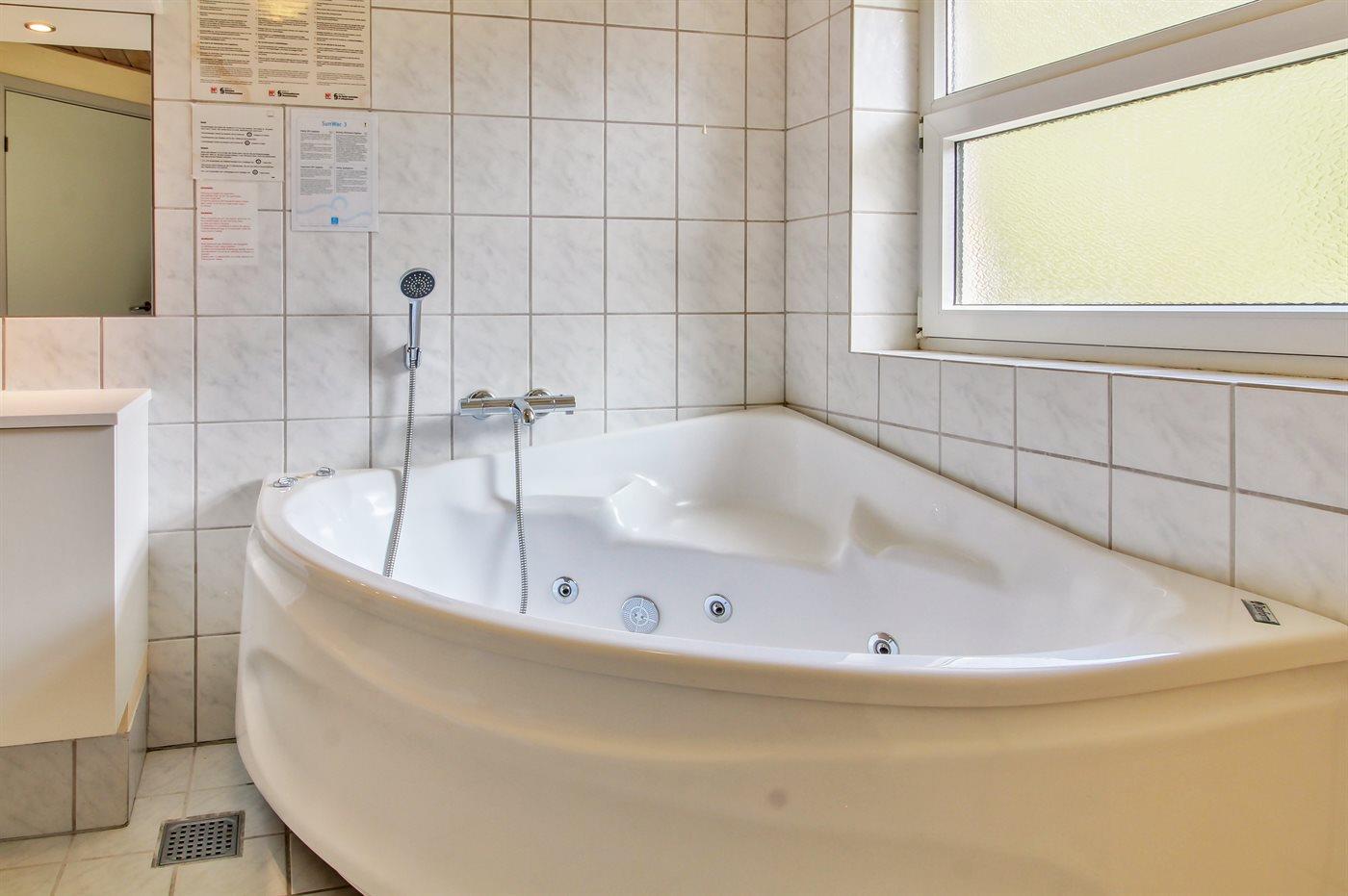 Der er 2 badeværelser med bruseniche og 2 toiletter. Der er gulvvarme på 2 badeværelser. I saunaen er der mulighed for afslapning.