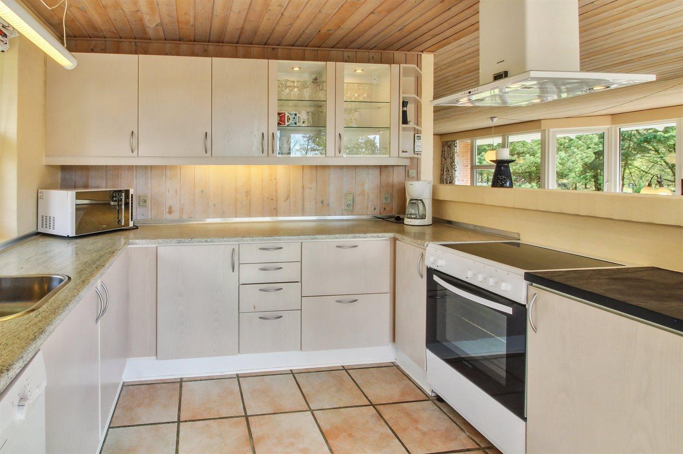 Køkkenet er udstyret med 1 køleskab. Der er 4 keramiske kogeplader, varmluftovn, mikrobølgeovn samt opvaskemaskine.