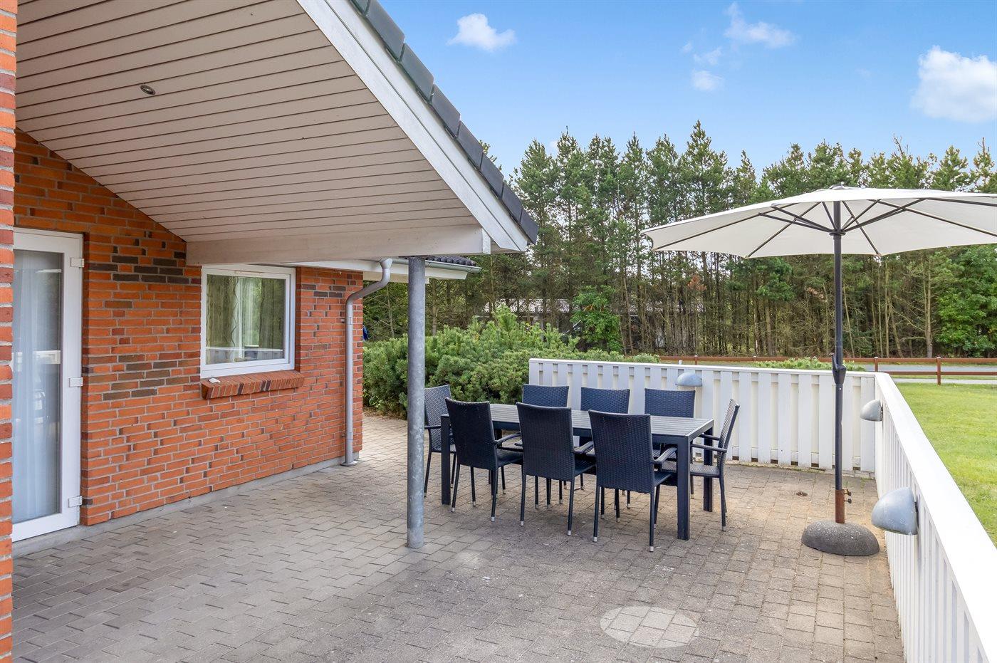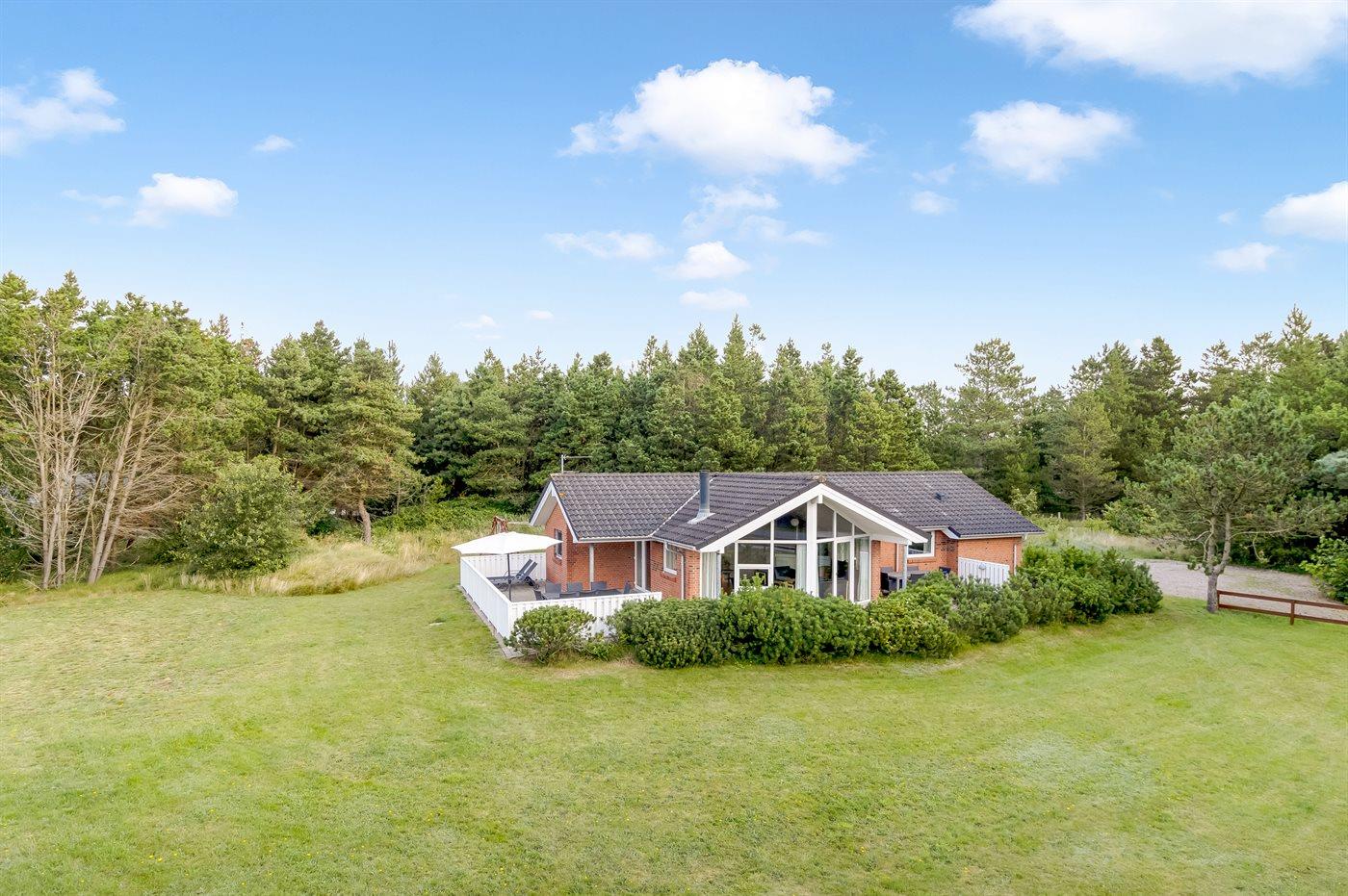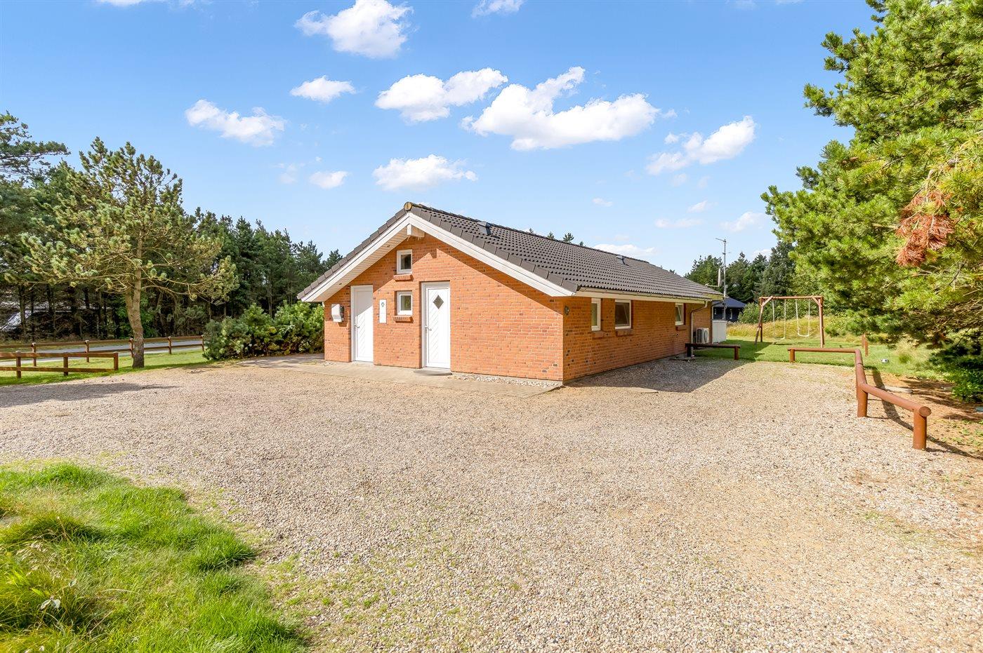 Ferieboligen er beliggende på en 2602 m² stor naturgrund. Der er 1800 m til havet. Nærmeste forretning er beliggende i en afstand af 1300 m. Der er en golfbane i en afstand af 50 m. Til ferieboligen hører åbent terrasseareal. Desuden er der overdækket terrasse. Der er redskabsrum. Gynge. Der er installeret stik til opladning af elbil. Parkering ved ferieboligen.