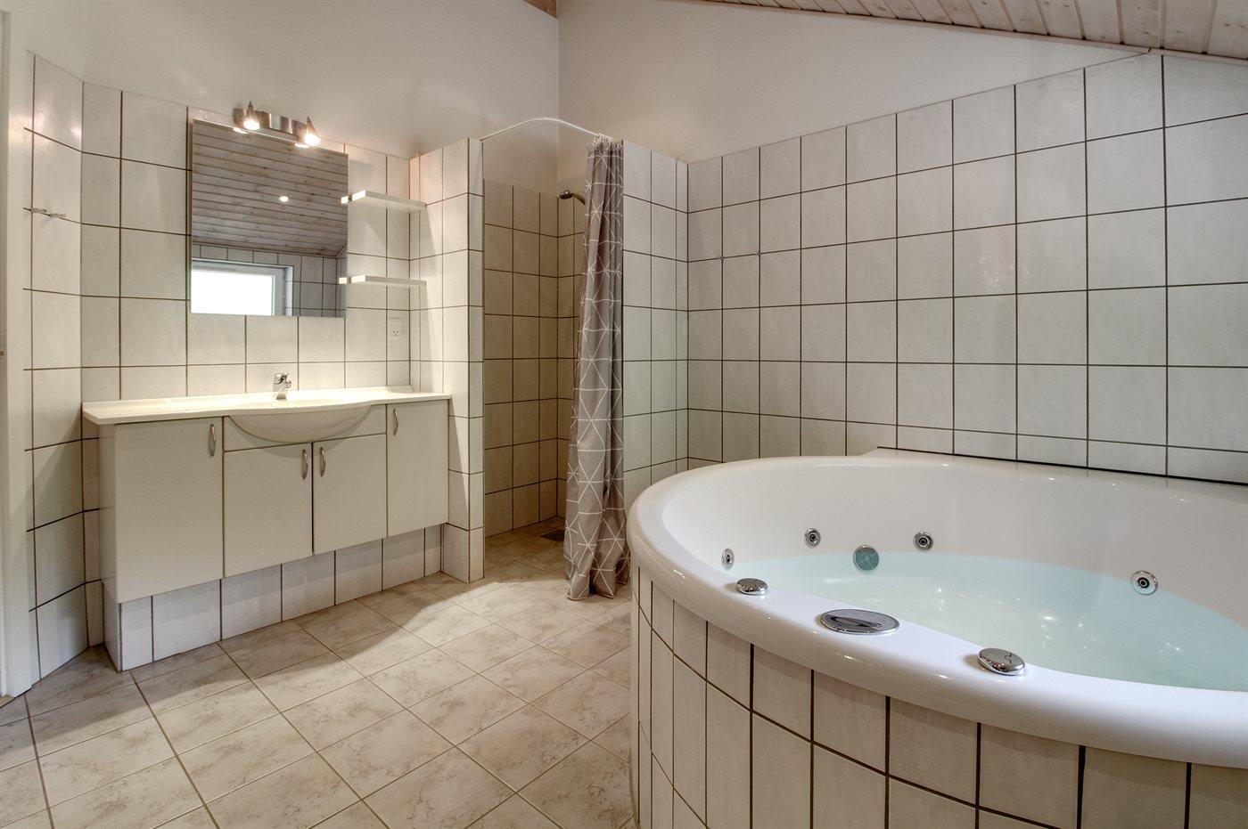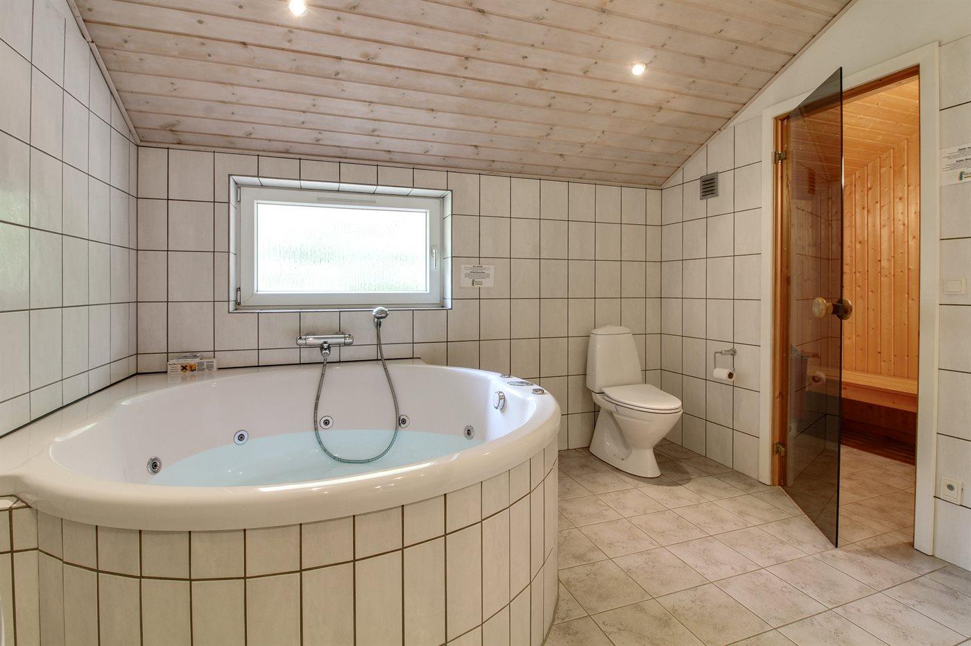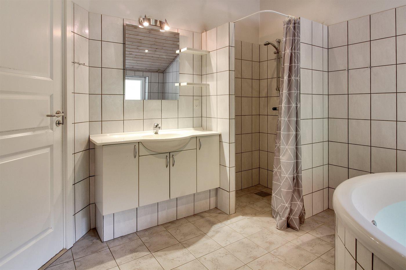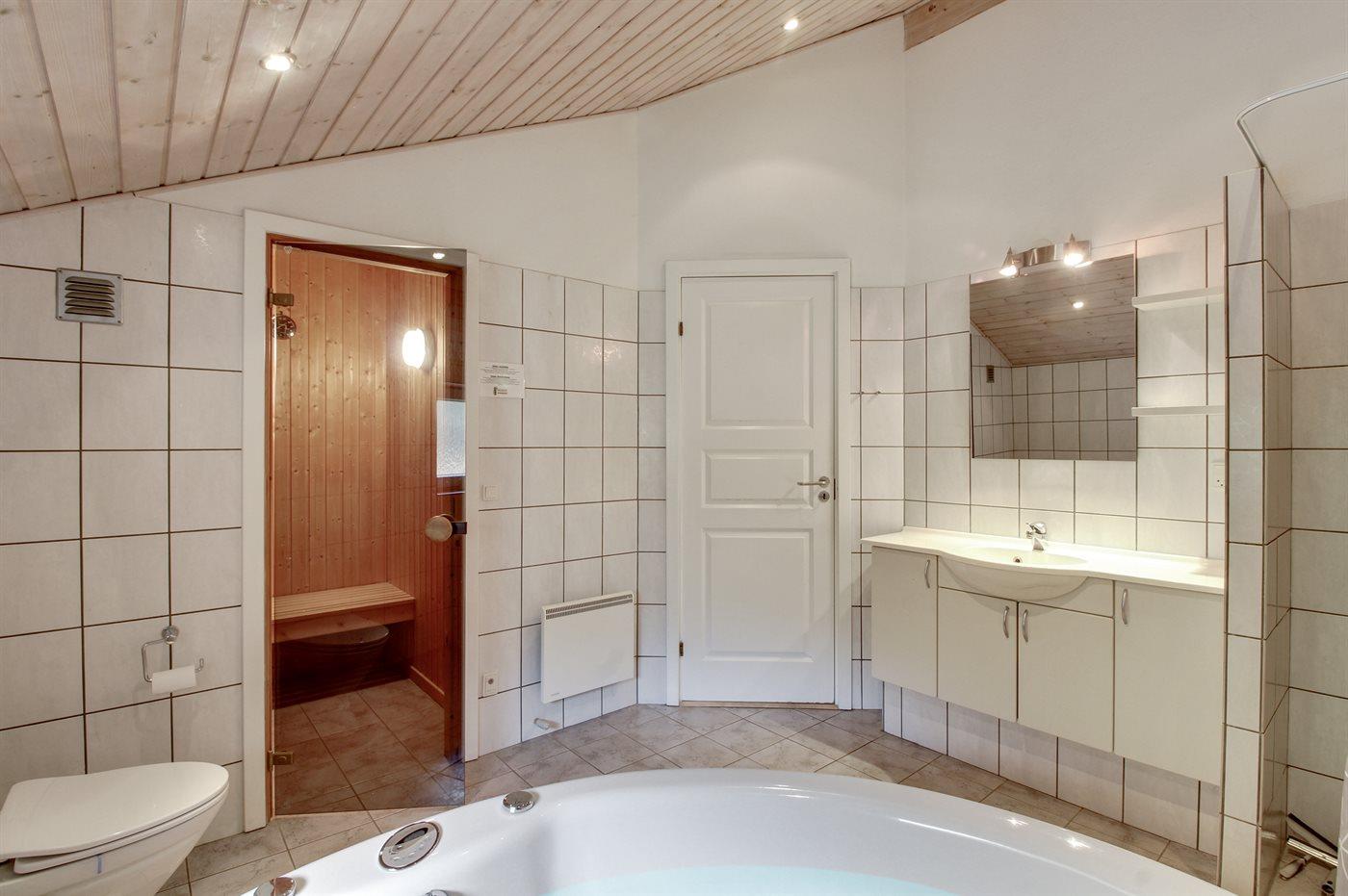 Der er 2 badeværelser med bruser og 2 toiletter. Der er gulvvarme på 1 badeværelse. I saunaen er der mulighed for afslapning.