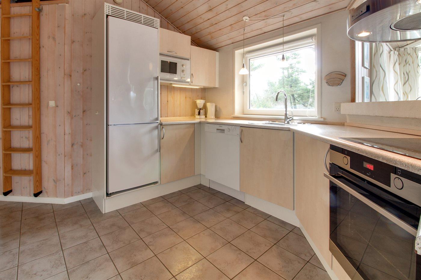 Køkkenet er udstyret med 1 køleskab. Der er 4 elkogeplader, bageovn, mikrobølgeovn samt opvaskemaskine.