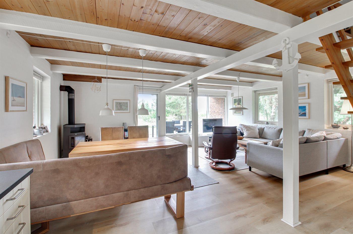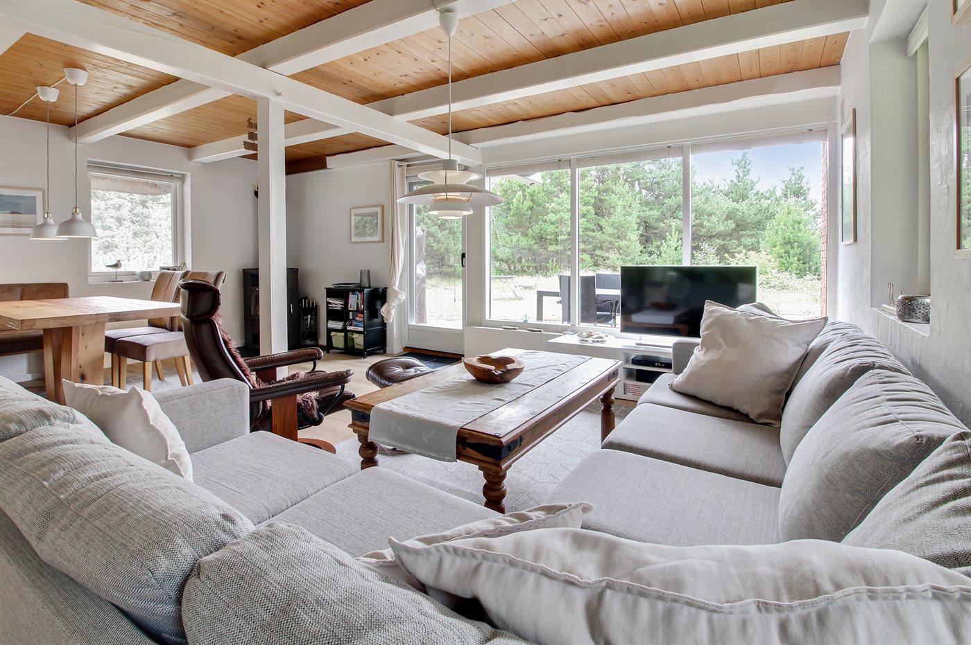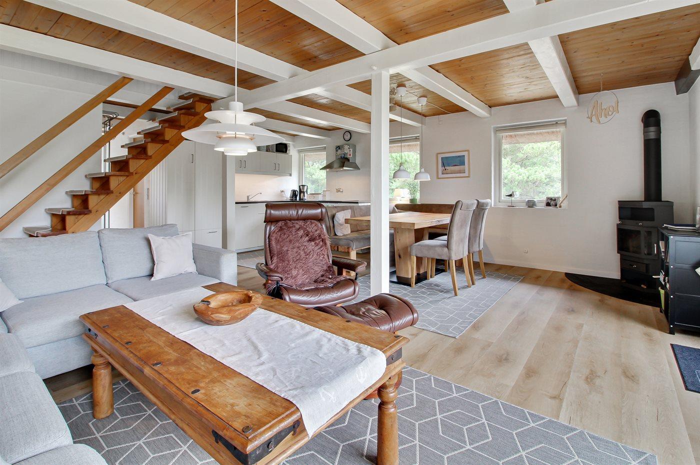 Sommerhus i sten i 2 etager, bygget i 1974 og senest renoveret i 2016, beliggende på en dejlig naturgrund. Til huset hører afskærmet terrasse med havemøbler samt balkon på husets 1. sal. Pænt badeværelse med gulvvarme og bruseniche. Køkkenet er kombineret med opholdsstuen og bl.a. udstyret med opvaskemaskine og mikrobølgeovn. Opholdsstuen indeholder brændeovn, DVD-afspiller og radio. Huset er indrettet med 3 soveværelser; 2 med dobbeltseng på 1. sal og 1 med køjeseng i stueetagen. Fra det ene soveværelse er der adgang til balkon, hvorfra der er pragtfuld udsigt over området. Barneseng og høj barnestol til rådighed. Der er installeret energibesparende varmepumpe og der findes fryser samt vaskemaskine og tørretumbler (i redskabsrum). Bemærk: Vandafgift. Huset ligger kun 375 m fra golfbane.