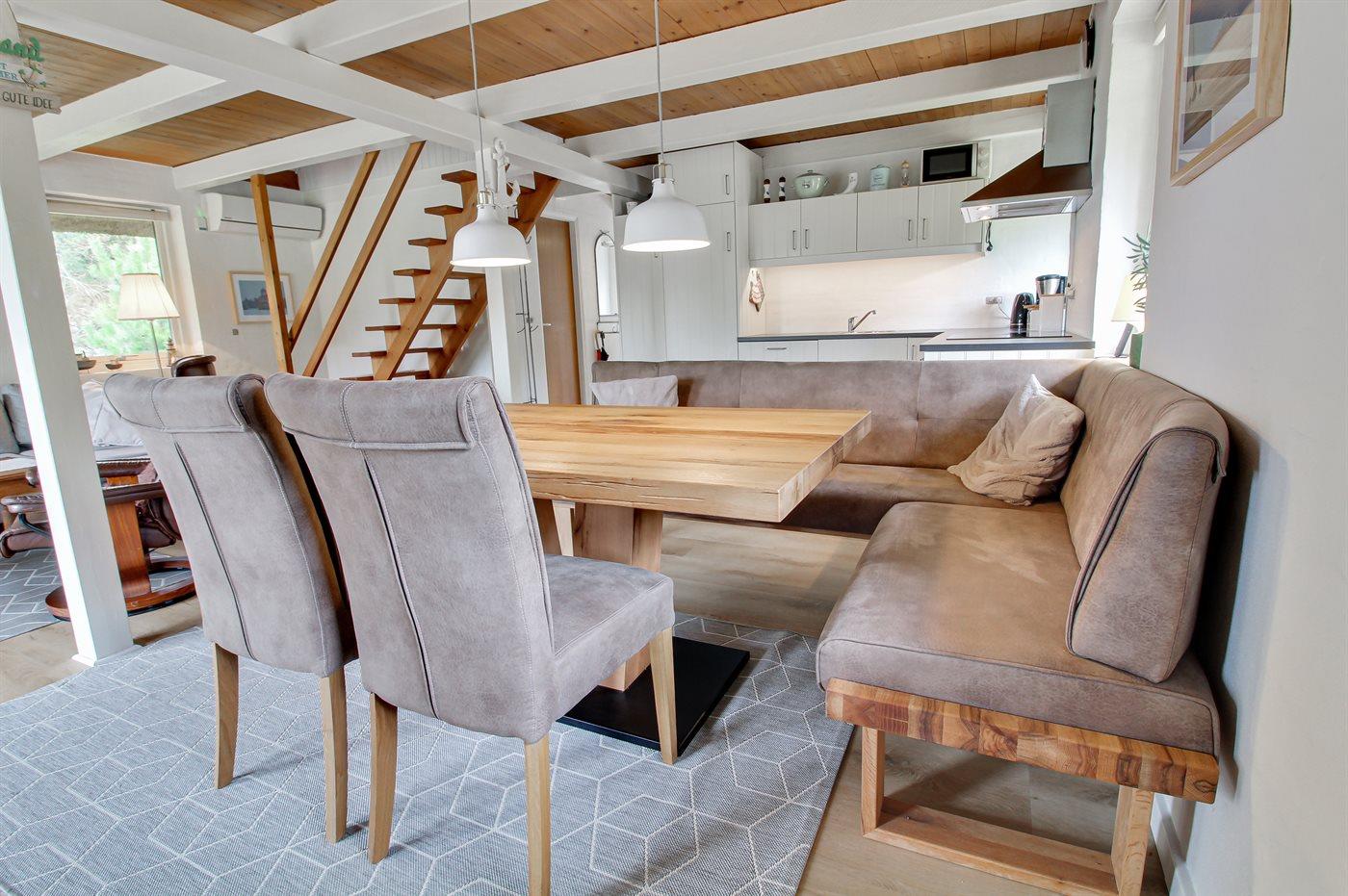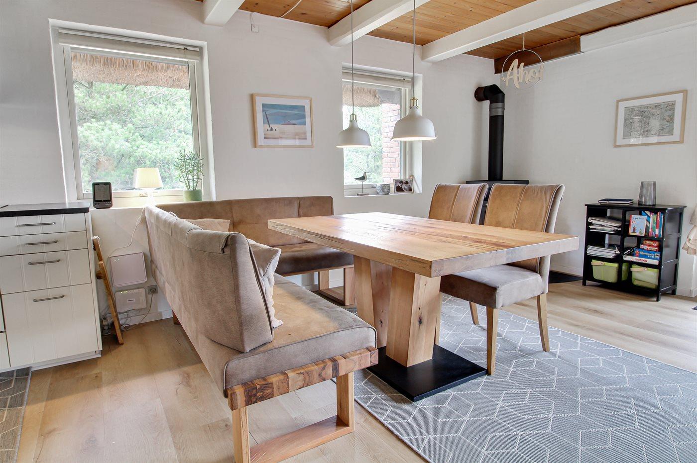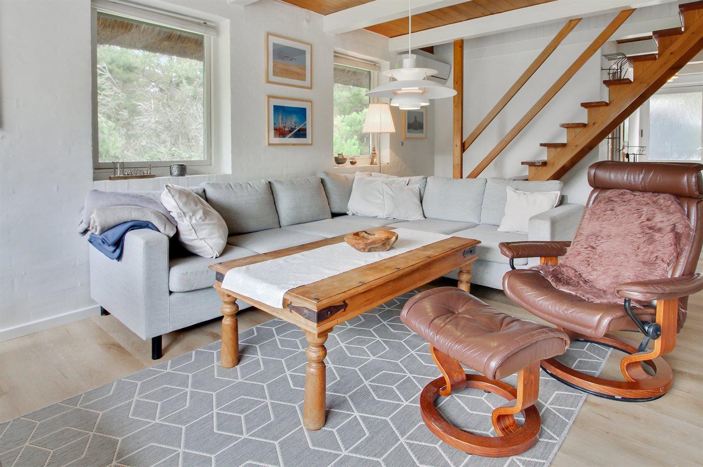Sommerhus i sten i 2 etager, bygget i 1974 og senest renoveret i 2016, beliggende på en dejlig naturgrund. Til huset hører afskærmet terrasse med havemøbler samt balkon på husets 1. sal. Pænt badeværelse med gulvvarme og bruseniche. Køkkenet er kombineret med opholdsstuen og bl.a. udstyret med opvaskemaskine og mikrobølgeovn. Opholdsstuen indeholder brændeovn, DVD-afspiller og radio. Huset er indrettet med 3 soveværelser; 2 med dobbeltseng på 1. sal og 1 med køjeseng i stueetagen. Fra det ene soveværelse er der adgang til balkon, hvorfra der er pragtfuld udsigt over området. Barneseng og høj barnestol til rådighed. Der er installeret energibesparende varmepumpe og der findes fryser samt vaskemaskine og tørretumbler (i redskabsrum). Bemærk: Vandafgift. Huset ligger kun 375 m fra golfbane.
