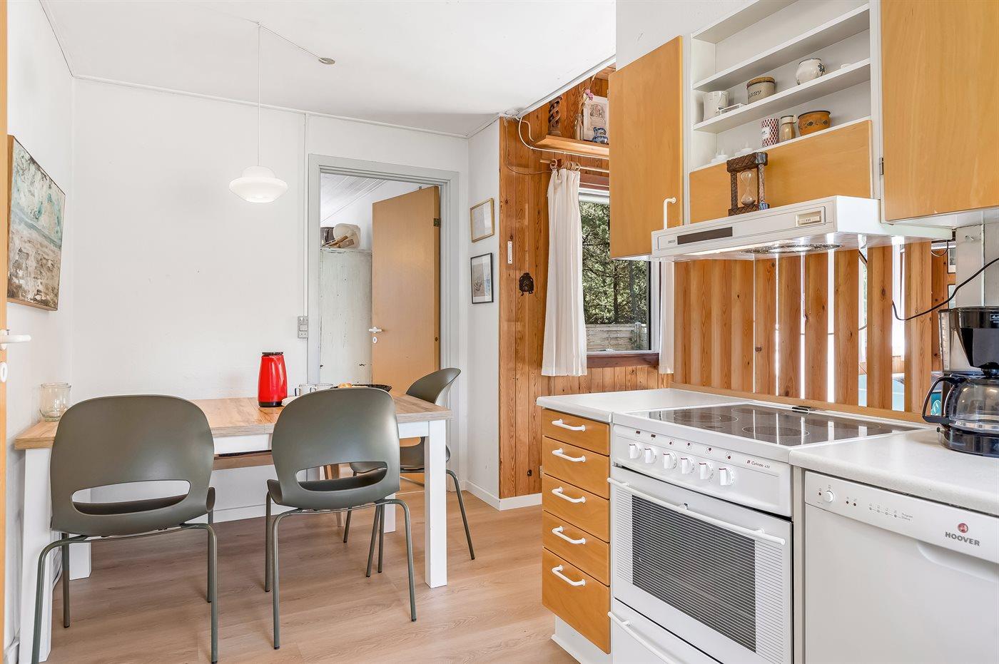 Køkkenet er udstyret med 1 køleskab. Der er 4 keramiske kogeplader, varmluftovn samt opvaskemaskine.