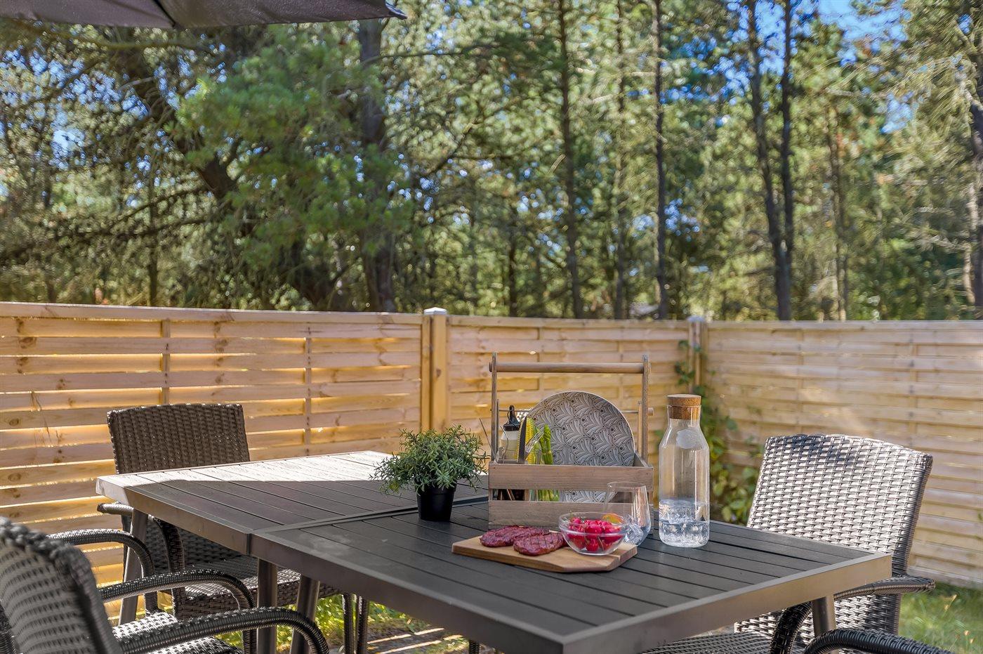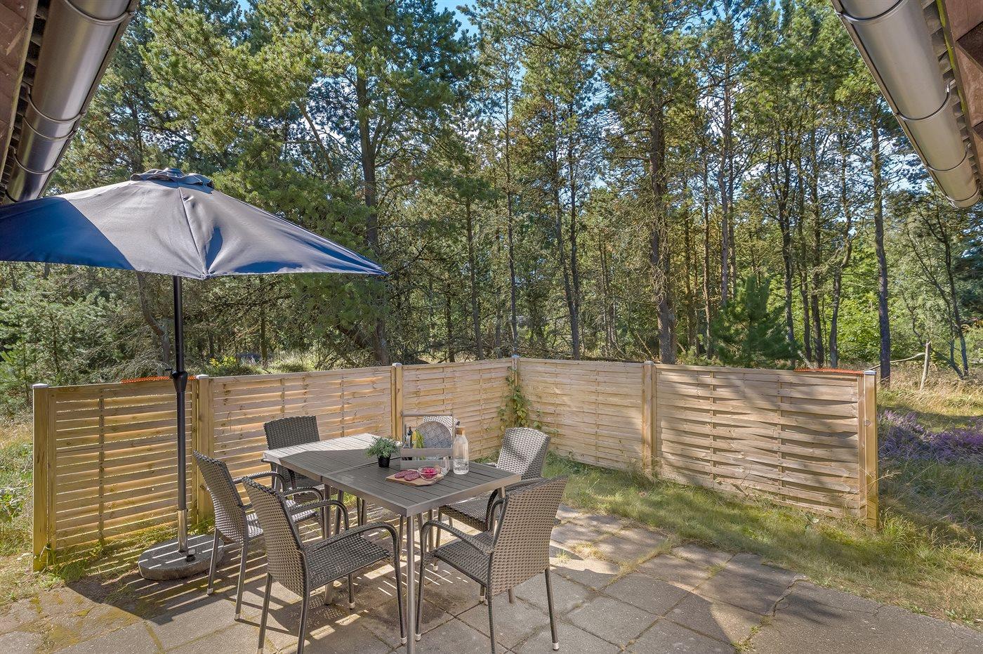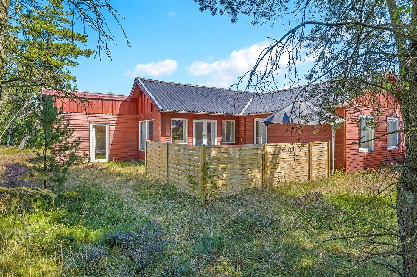 Dejligt sommerhus beliggende kun 800 m fra havet på en stor naturgrund med lyng. Grunden er omkranset af træer og ligger ugeneret.