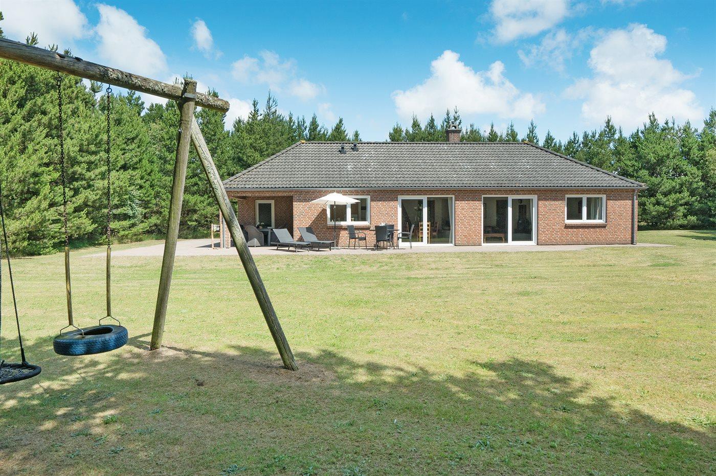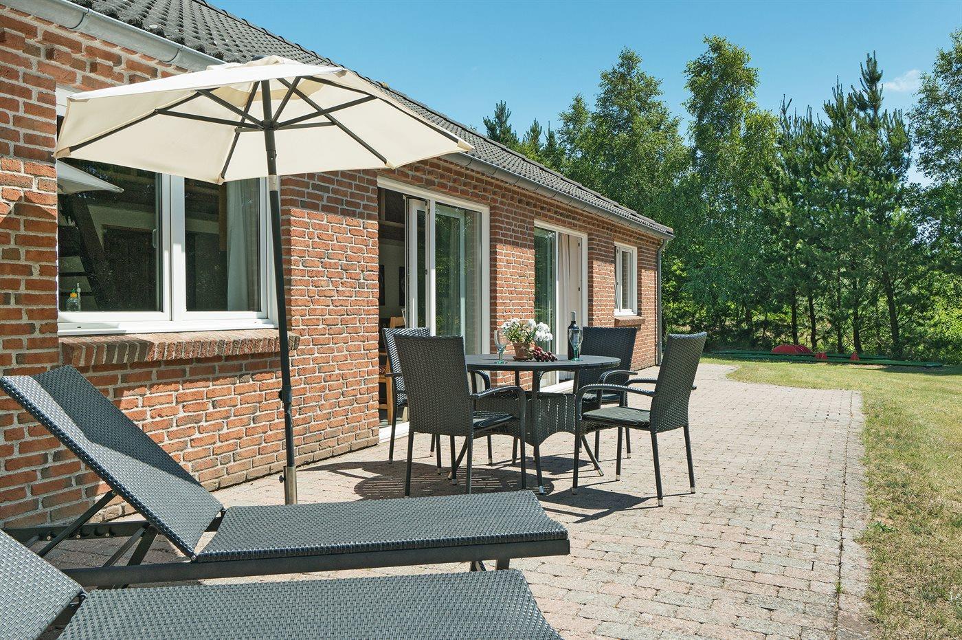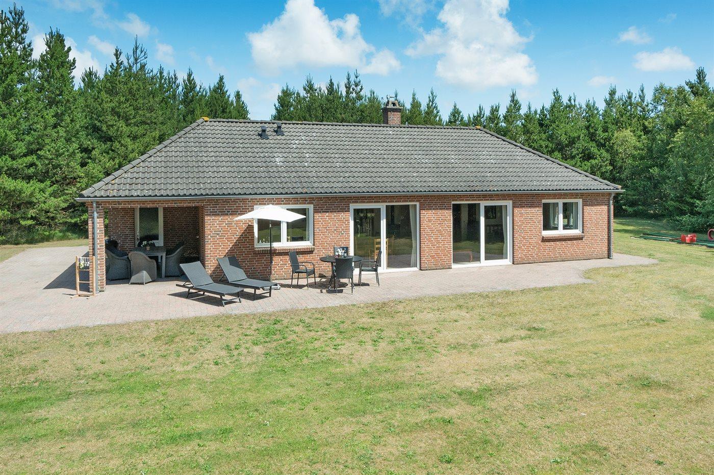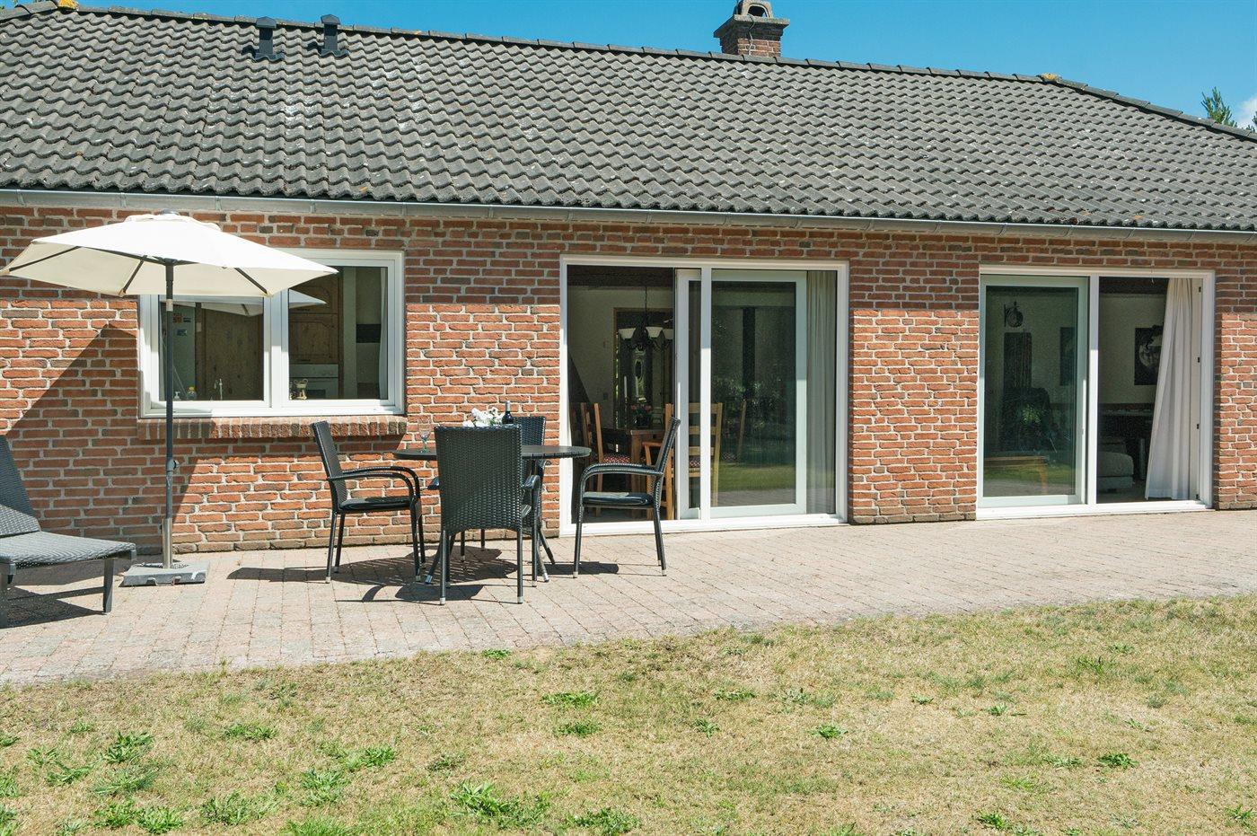 Nær Sønderstrand ligger dette flotte sommerhus i sten, bygget i 1998, beliggende på en stor naturgrund langt fra vejen. Til huset hører såvel åben som overdækket terrasse med havemøbler. Indvendig er vægge og lofter holdt i lyse farver. Flot badeværelse med gulvvarme, bruseniche og skabsarrangement. Det pæne køkken er kombineret med opholdsstuen og bl.a. udstyret med opvaskemaskine, mikrobølgeovn og fryser. Den smagfuldt indrettede og særdeles rummelige opholdstue indeholder brændeovn, stereoanlæg med CD-afspiller, video, TV med parabolantenne (kun tyske programmer) samt billardbord. Husets sovepladser fordeler sig på 3 soveværelser, alle med dobbeltseng. Huset er desuden udstyret med gratis internetforbindelse (computer skal medbringes), solarium, vaskemaskine, tørretumbler, barneseng og høj barnestol. På grunden er der sandkasse, gynge samt lille privat minigolfbane med 4 baner. Huset ligger kun ca. 250 m fra golfbane.
