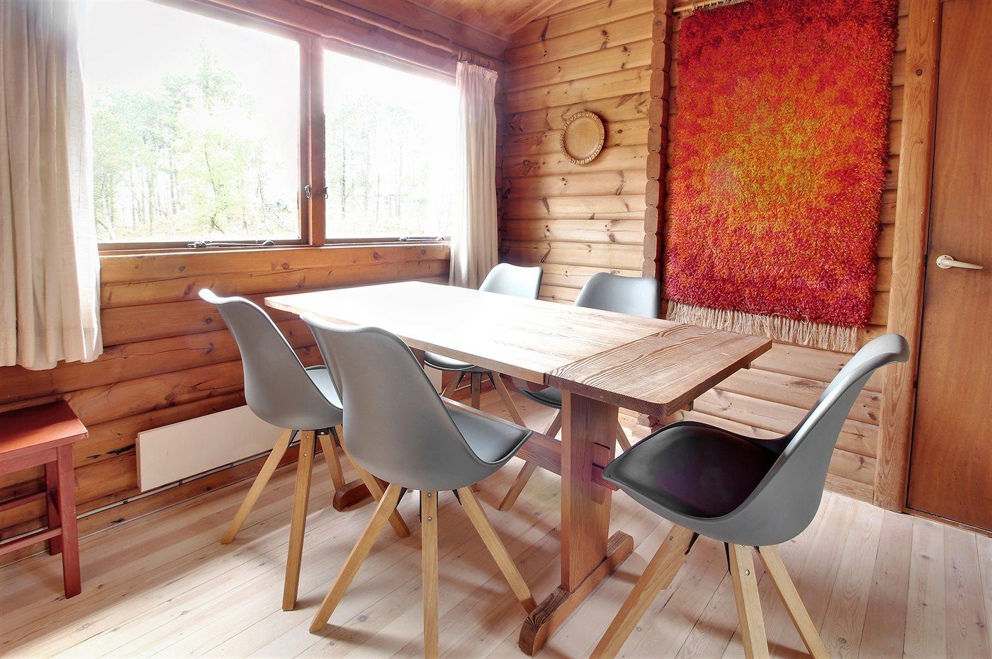 Pænt bjælkesommerhus beliggende på en meget stor grund omgivet af træer.