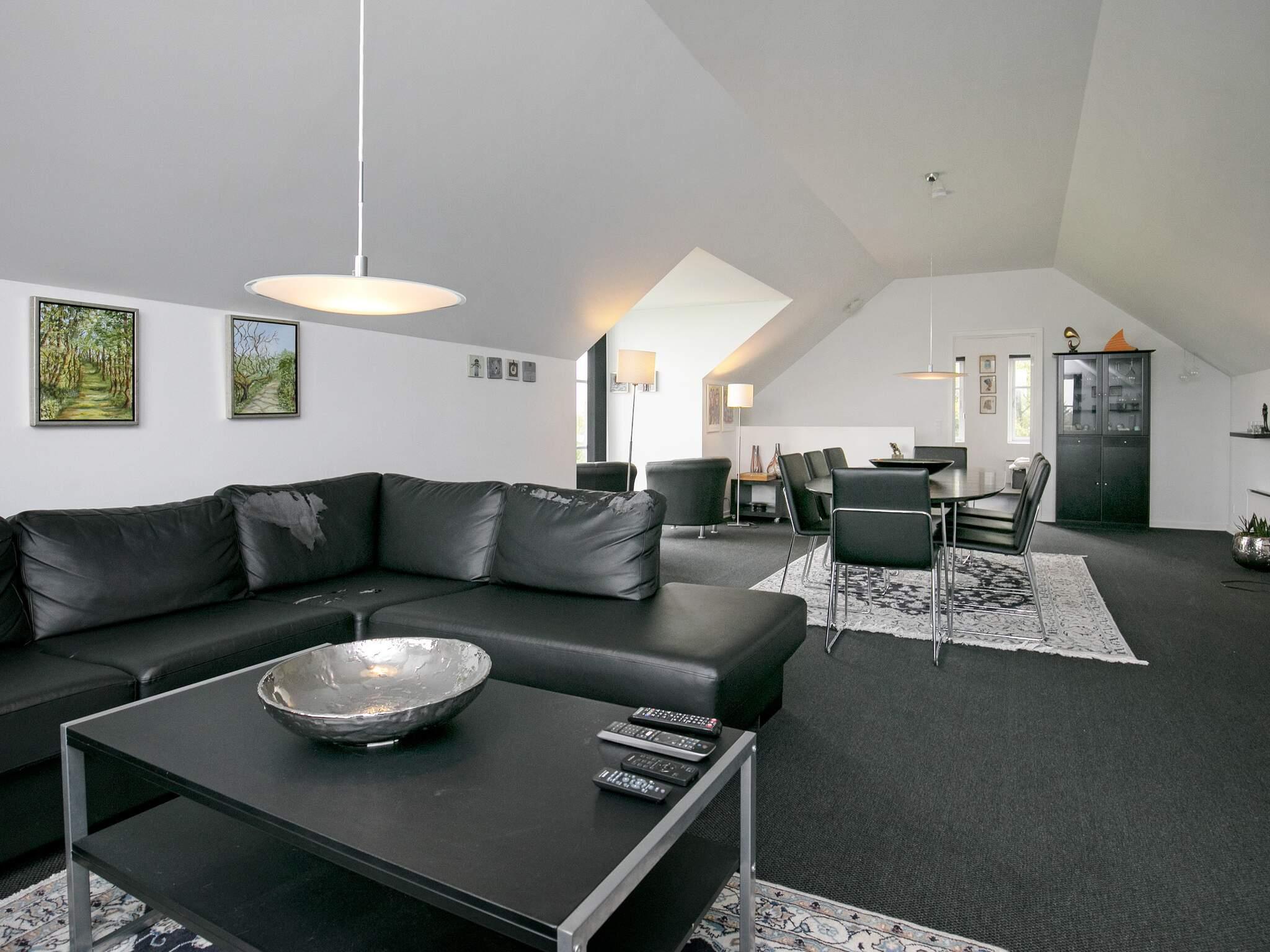 På 1. sal findes den store stue og det store soveværelse med en dobbeltseng og to køjesenge. Fra opholdsstuen er der udgang til den store altan. Både ude og inde er der komfortable møbler. Udlejes ikke til ungdomsgrupper.