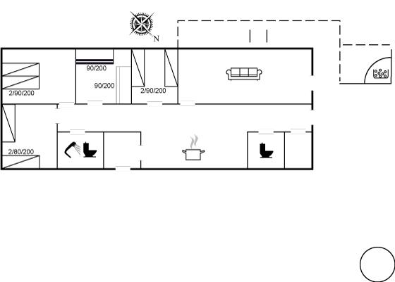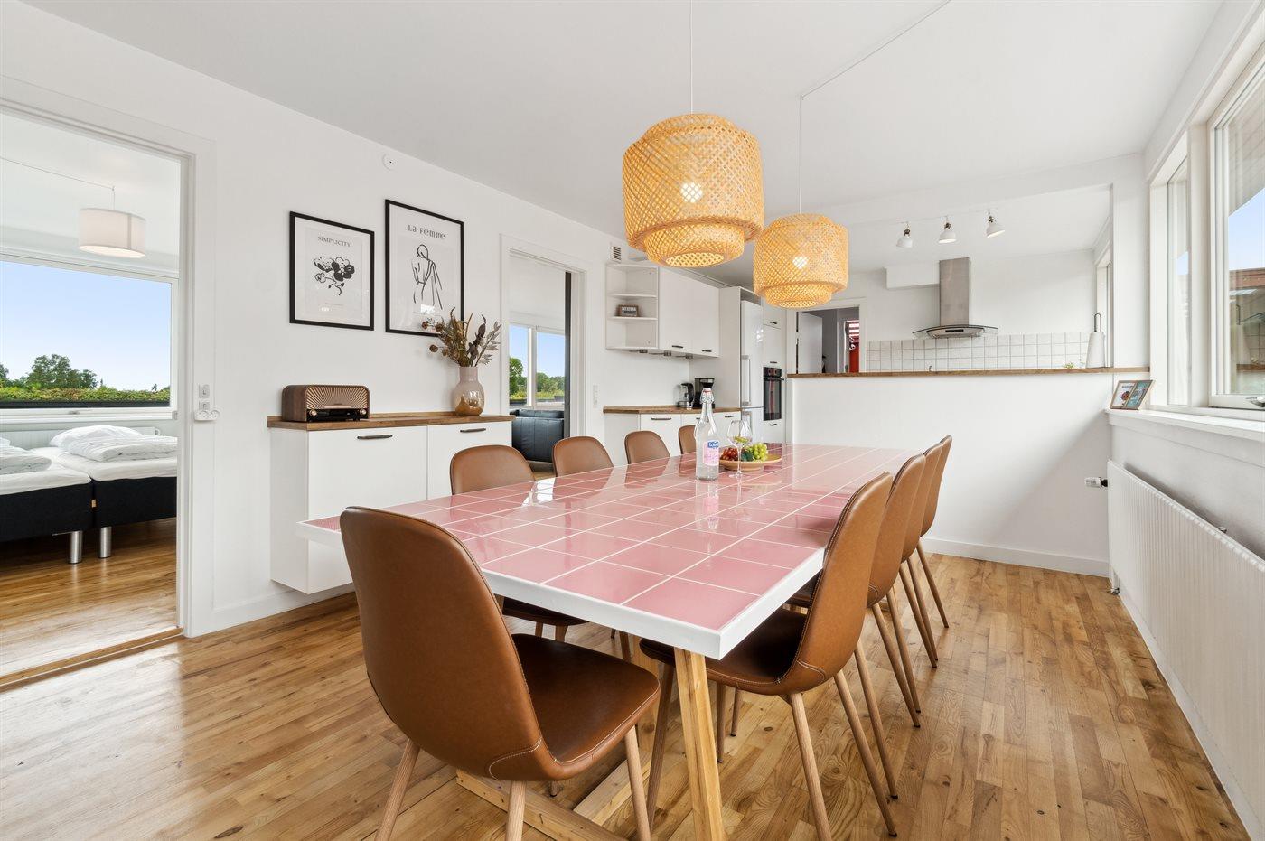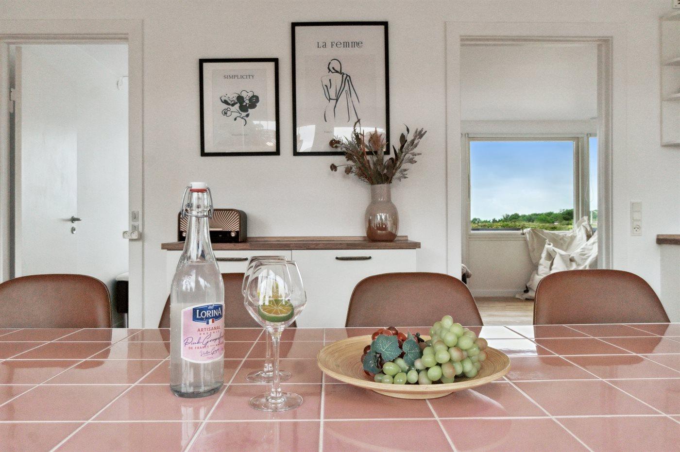 Ferieboligen er rummeligt og velindrettet med en pæn moderne møblering. I det store køkkenalrum er der spiseafdeling, så selve stueafdeling kan nydes til hyggeligt ophold med TV-kiggeri, læsning og småsnak uden at blive forstyrret af arbejdet i køkkenregionerne.