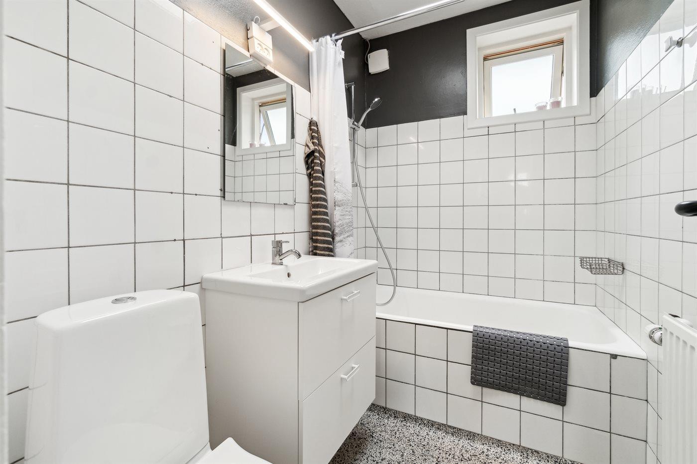Der er 1 badeværelse med bruser og 2 toiletter, heraf 1 gæstetoilet. Der er gulvvarme på 1 badeværelse.. Badekar.