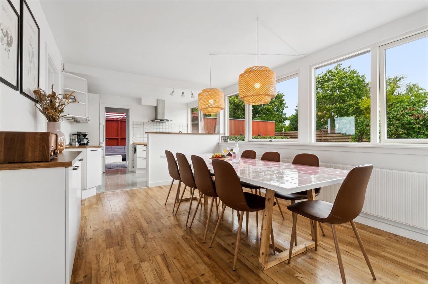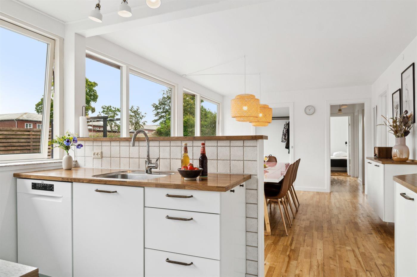 Køkkenet er udstyret med 1 køleskab. Der er 4 keramiske kogeplader, varmluftovn, mikrobølgeovn samt opvaskemaskine.
