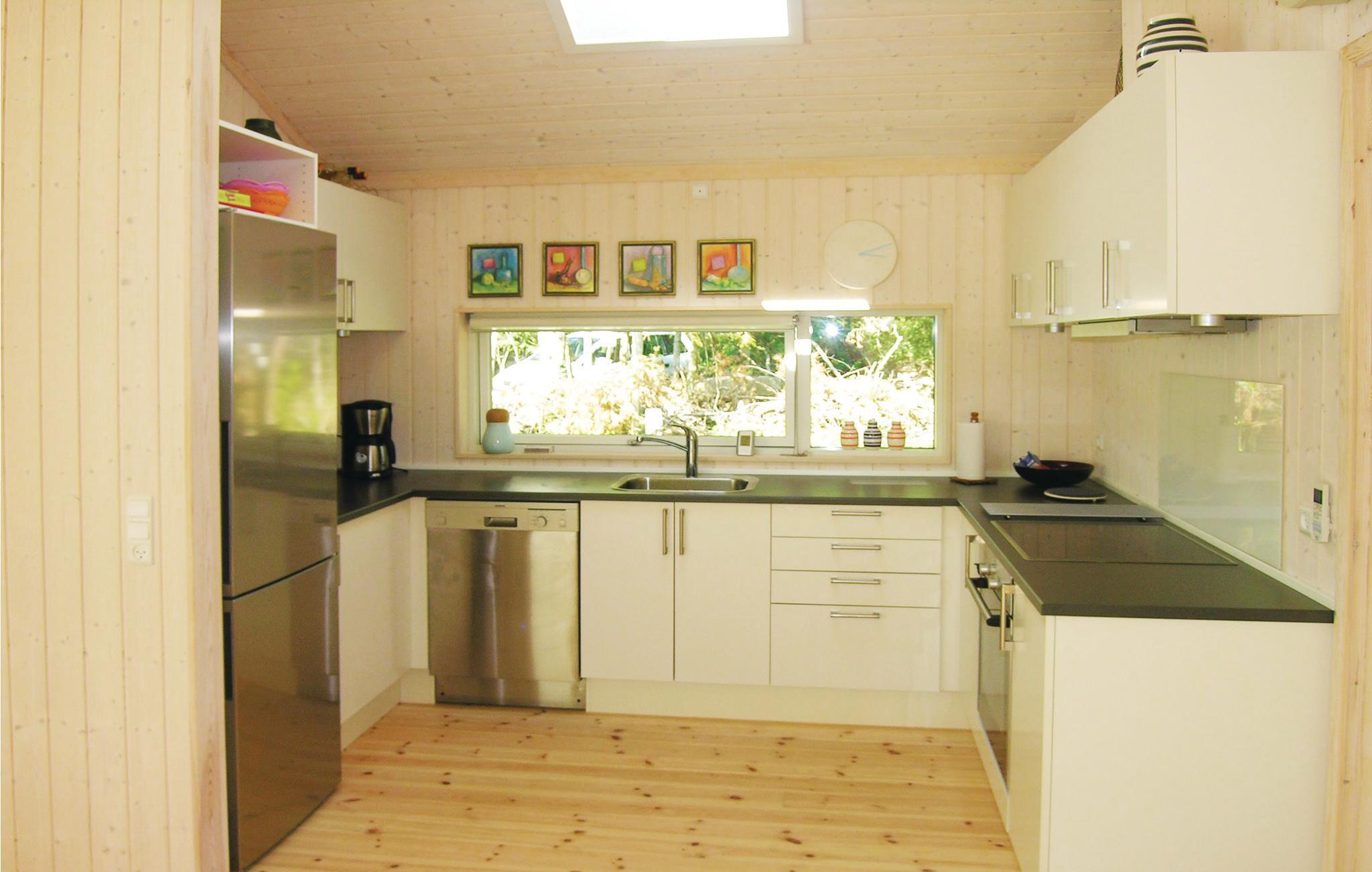 Huset består af et åbent køkken, kombineret spise- og opholdsstue med udgang til træterrasse, hvor man kan sidde og grille og hygge sig med et glas vin på lune sommeraftener. Boligen er velegnet til en ferie uanset årstid, og skulle I komme til at fryse, kan I tænde op i brændeovnen og nyde den hyggelige stemning. Stilen er lys og klassisk, så I får gode rammer til at slappe af efter en lang dag på farten.