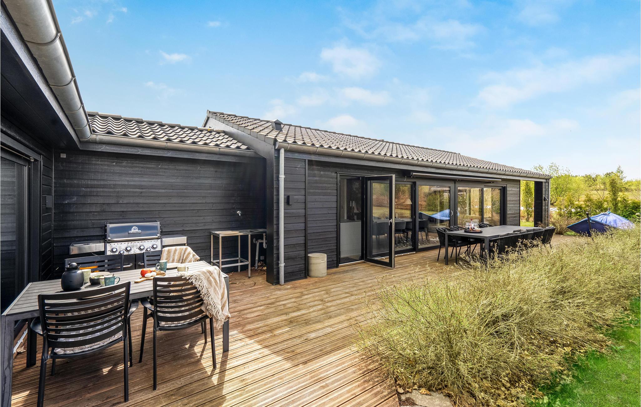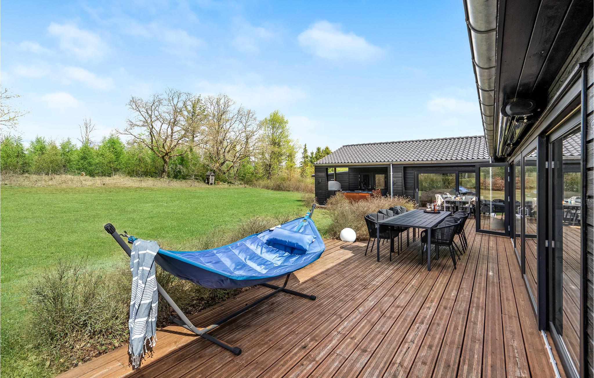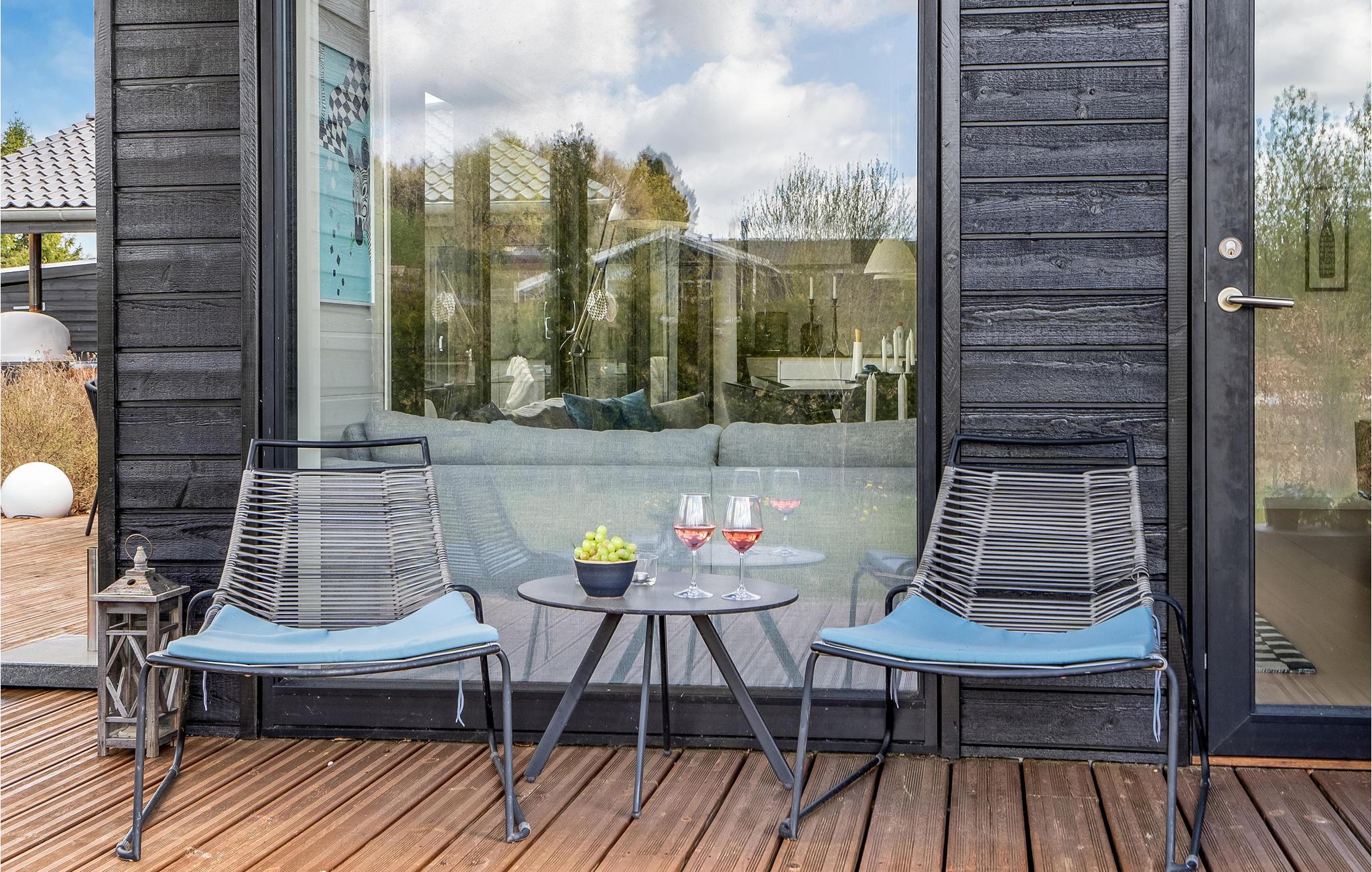 Rundt om huset er der terrasser med gode havemøbler. Den store vestvendte terrasse vil helt sikkert blive samlingssted til hygge, afslapning og skønne feriemiddage med et godt glas vin eller en frisklavet pizza fra den udendørs pizzaovn. Udendørs spaen står klar til jer, når I ankommer, så ferien kan allerede fra første øjeblik begynde med afslapning i tusindvis af bobler - måske afsluttet med en tur i sauna, med indgang fra terrassen.