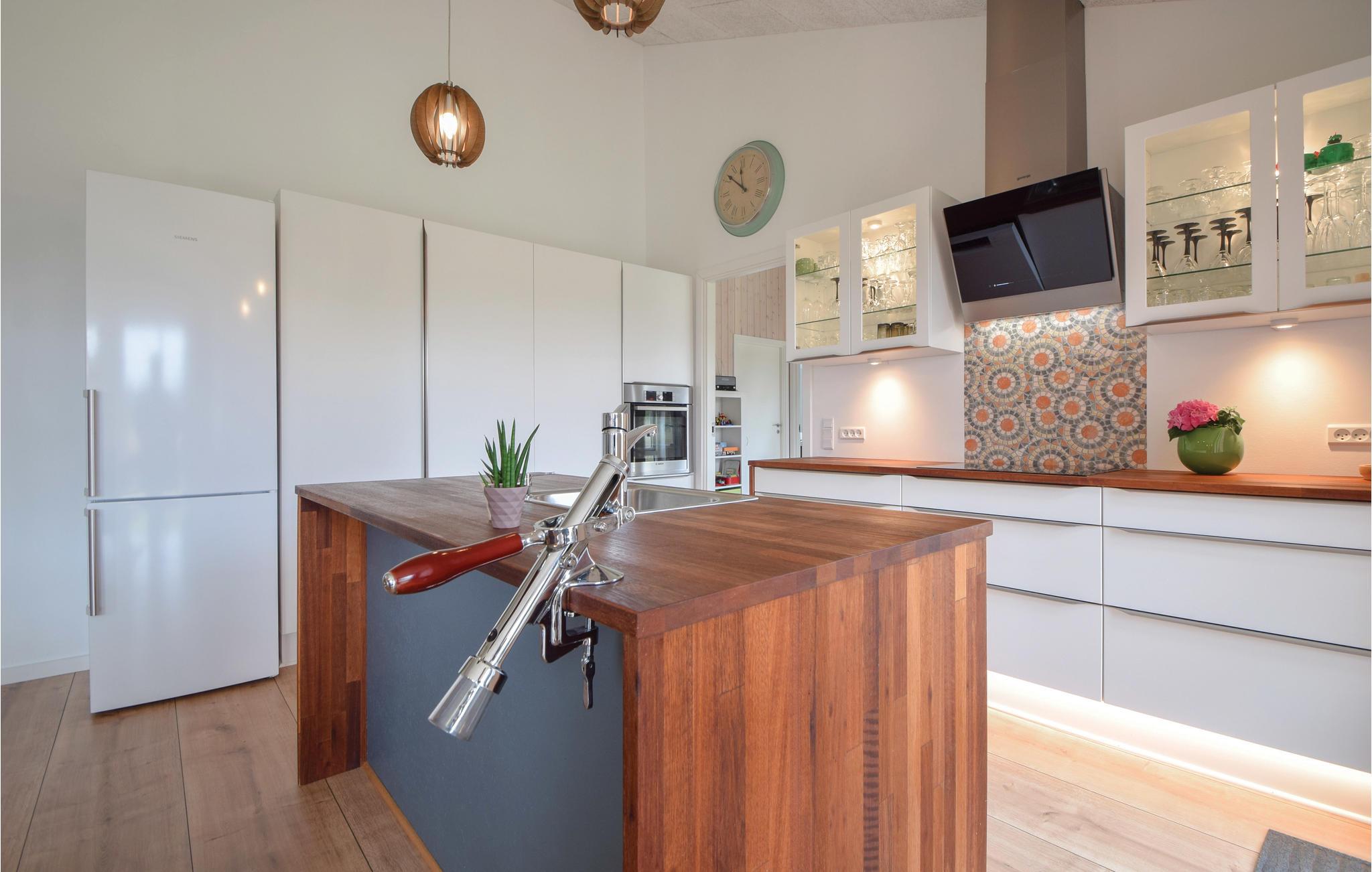 Flot, velindrettet og rummeligt feriehus med plads til en stor familie eller to familier, som gerne vil holde ferie sammen. Der er stort aktivitetsrum med airhockey. Huset indeholder en stor stue med spiseplads til alle samt sofagruppe. Der er trådløst internet med høj hastighed samt apple-tv, der er ikke kabel eller satellit-tv i huset. Stuen ligger i åben forbindelse med det lækkert indrettede køkken. Der findes tre badeværelser i huset, så der behøver ikke at være kø, når I skal afsted på udflugt fra morgenstunden - det største af badeværelserne er ren wellness, her findes både spabad og sauna, og loftslyset er lavet så det er specielt beroligende og kan skifte farve. Endvidere er her fire gode soveværelser; tre med dobbeltsenge og et med to køjesenge, så her kan hele fire personer overnatte. Køjesengene har et stort liggemål, så selv en teenager kan få en god nattesøvn her.