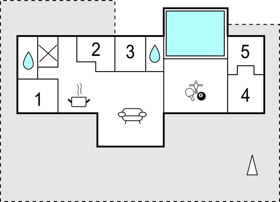 Der er 5 soveværelser med senge til op til 13 personer og en hems med mulighed for ekstra sovepladser. Der er også to badeværelser. Til underholdning er der et aktivitetsrum med bordtennis og airhockey. Husets højdepunkt er den private indendørspool.