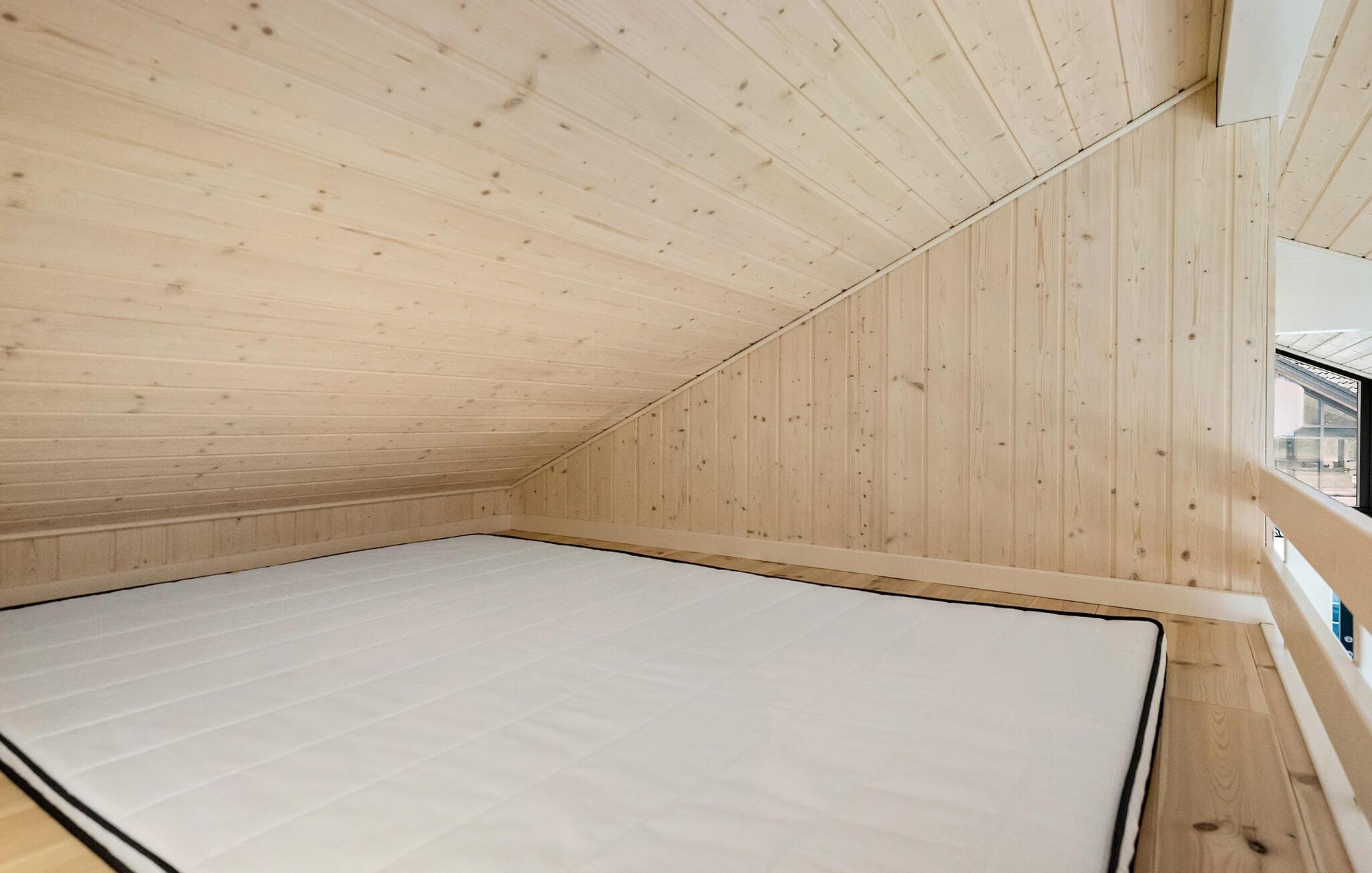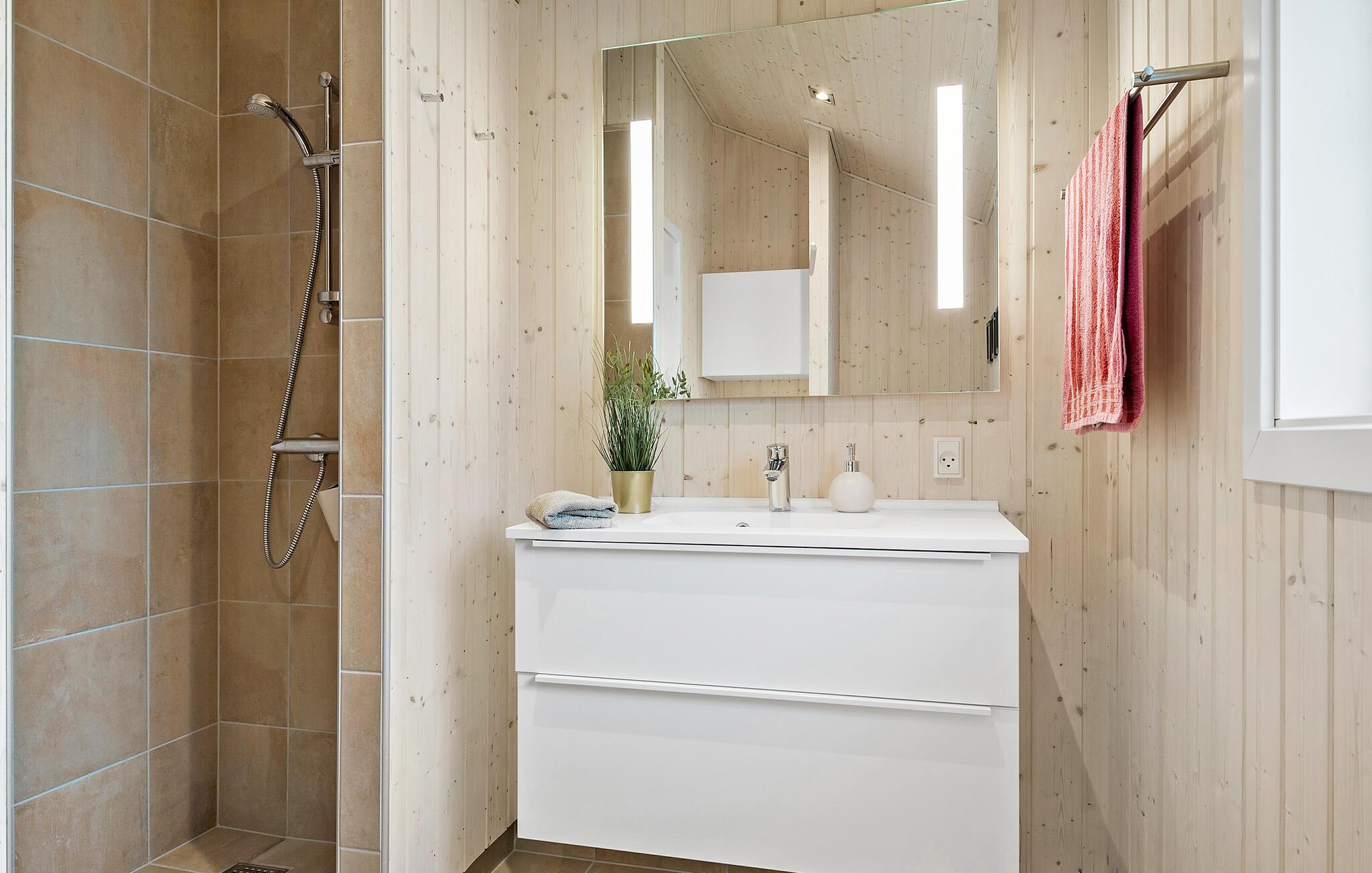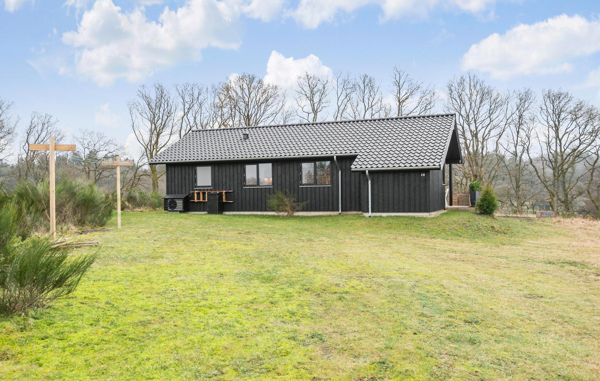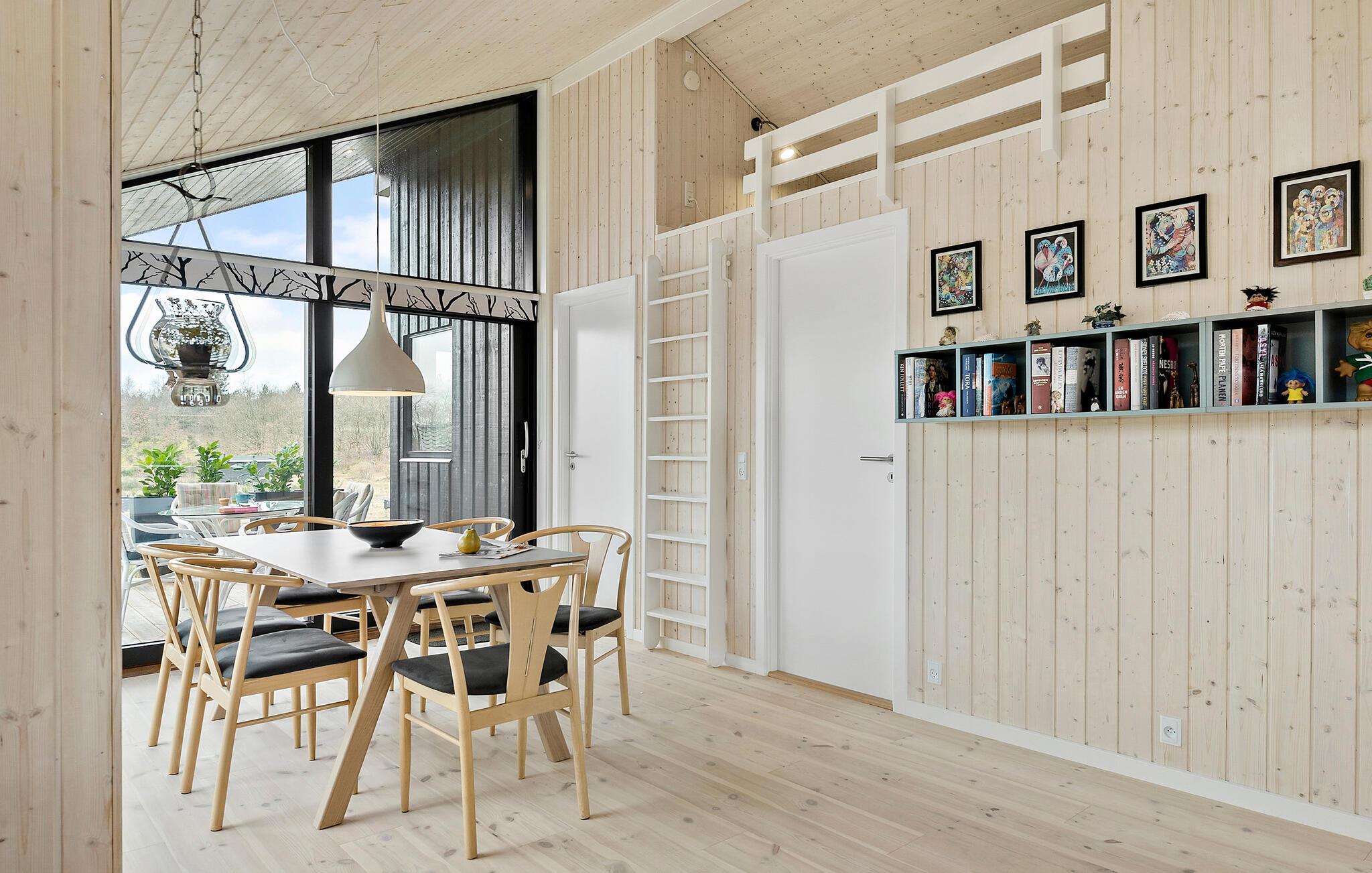 I dette smukke feriehus inviteres I til en afslappende ferie midt i naturen. Indendørs byder det rummelige køkkenalrum med loft til kip og store vinduespartier på lys og skøn natur, ideelt til familiemåltider og hyggestunder. De lyse farver og den moderne indretning skaber en behagelig atmosfære, hvor I kan trække jer tilbage og nyde ferien i komplet ro.