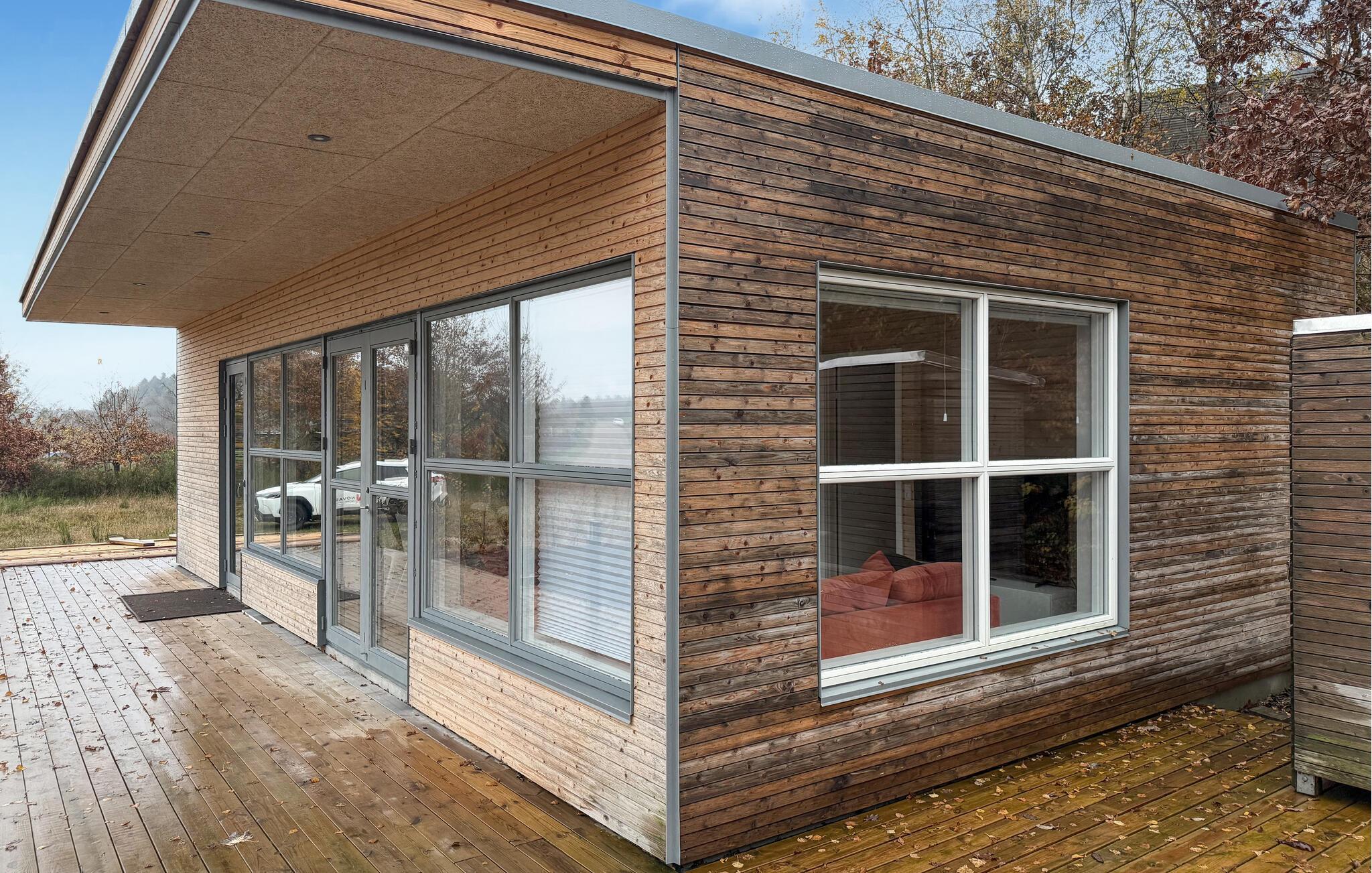Huset falder harmonisk i ét med landskabet. Gå udenfor og nyd den rolige atmosfære på træterrassen. Slå jer ned med en kop kaffe og lad blikket vandre over den store grund. Brug det overdækkede område som et beskyttet sted i al slags vejr eller slap af i solen.