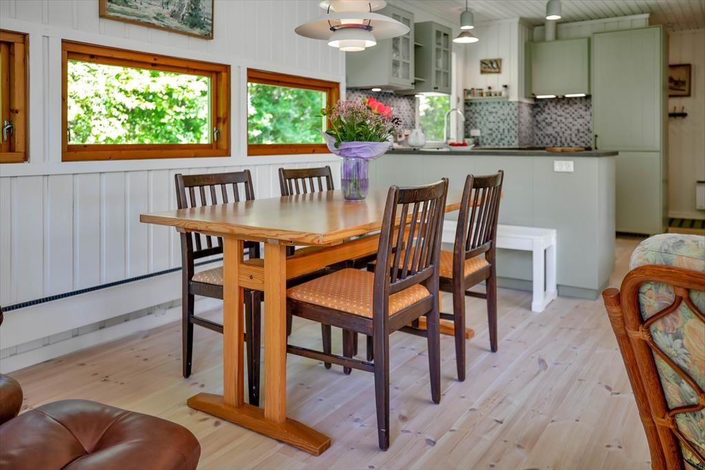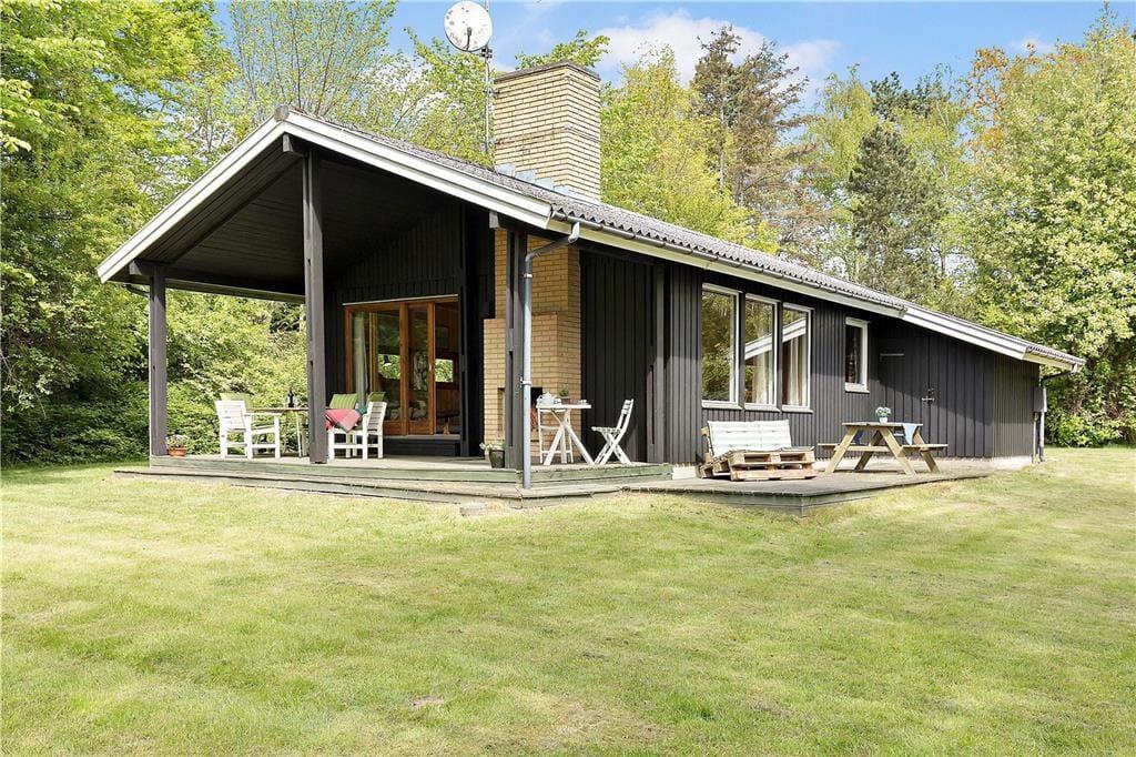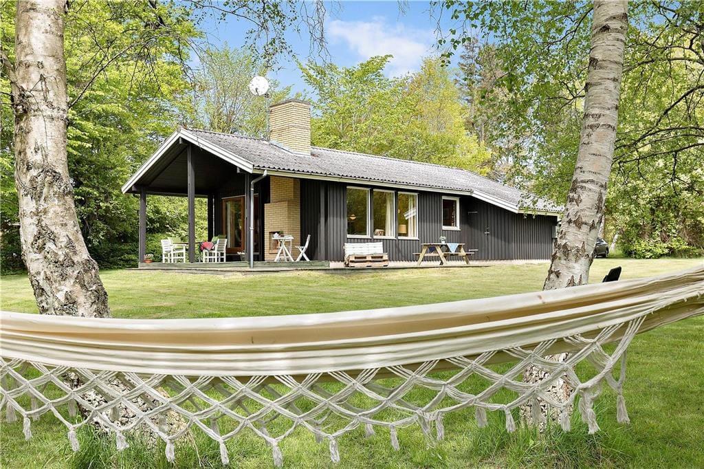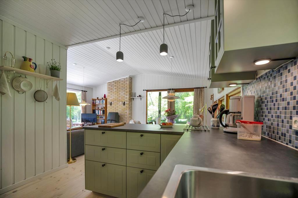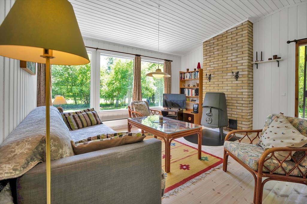 Huset indeholder hyggelig stue med sovesofa brændeovn samt spiseplads. Derudover er der åbent køkken og 2 soveværelser med henholdsvis dobbeltseng og køjeseng. Badeværelse med brus. Fra stuen er der udgang til den overdækkede terrasse med åben pejs hvor du kan nyde din grillede fisk og et glas koldt hvidvin samt udsigten til haven hvor rådyrene krydser jævnligt.