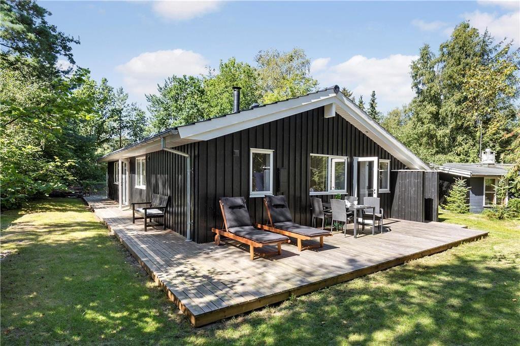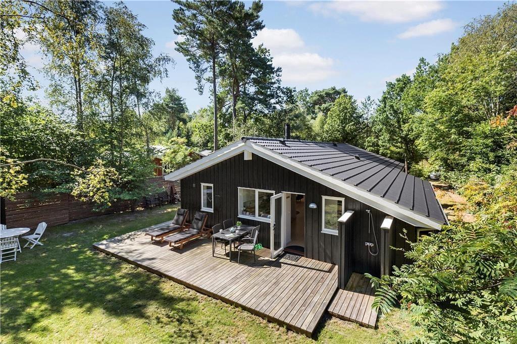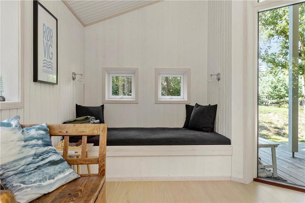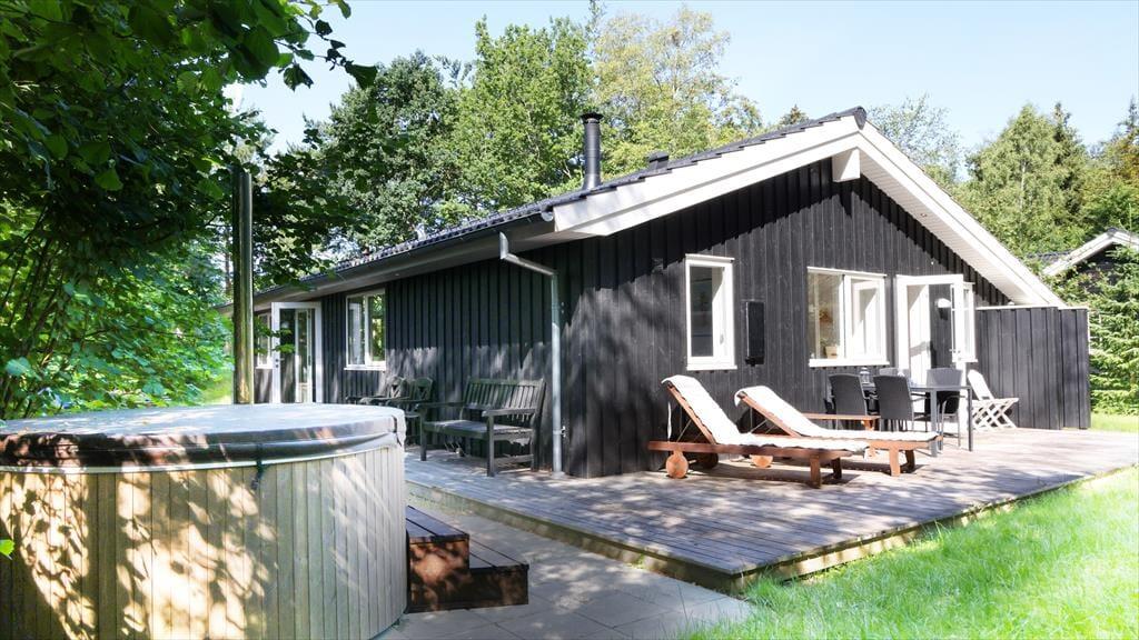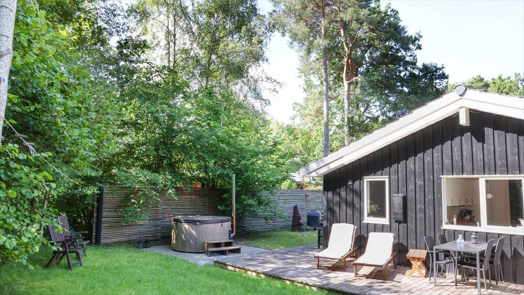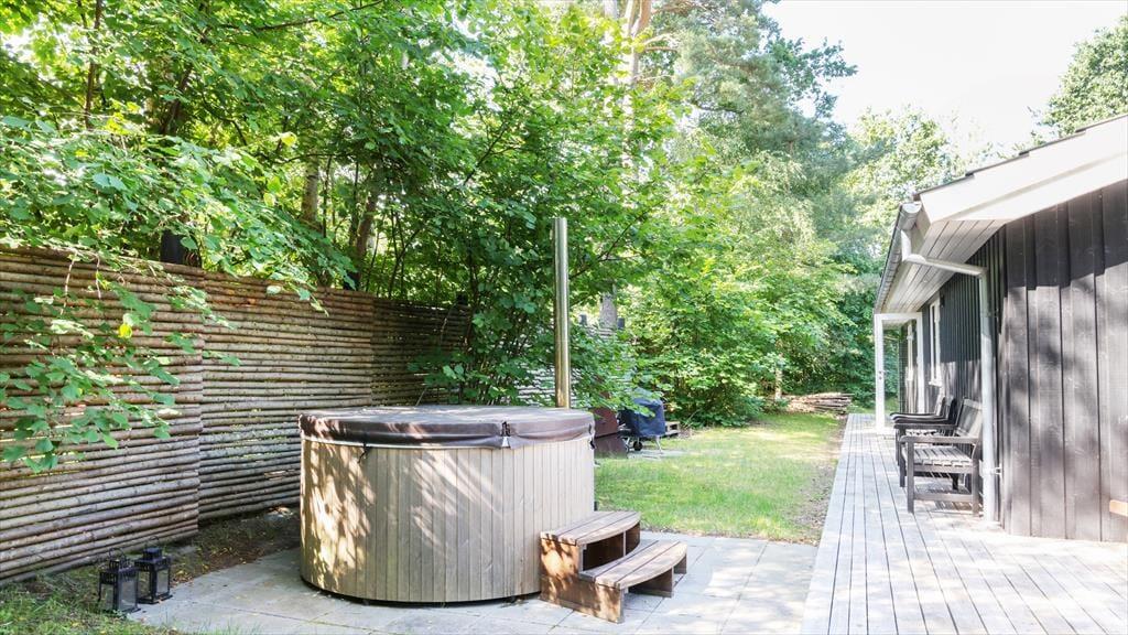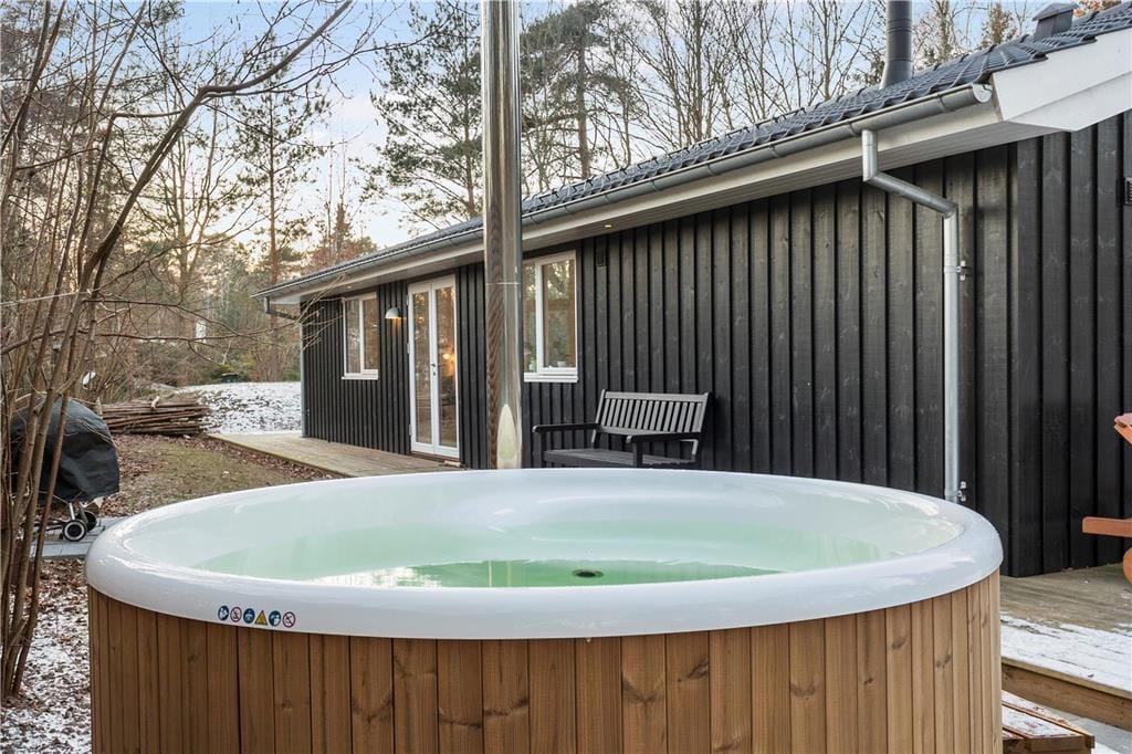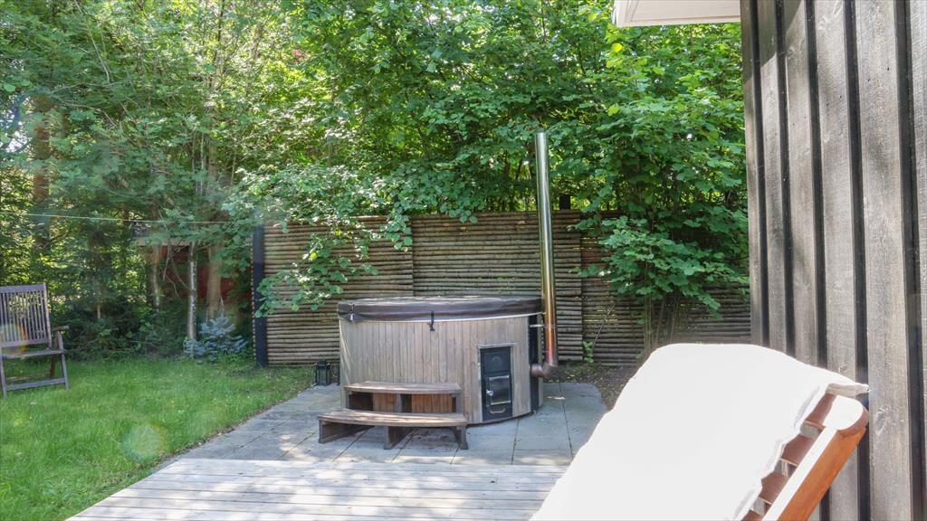 Moderne hus med 4 gode soveværelser, hvoraf de 3 har dobbeltsenge og det ene en enkeltseng. Huset er smagfuldt indrettet. Stuen indeholder brændeovn, varmepumpe, TV samt alkove med seng og har udsigt og udgang til den forreste terrasse. Det åbne og lyse køkken har opvaskemaskine og udgang til bagvendt terrasse. Der er badeværelse med brus samt lækker sauna, hvorfor også de kolde vinteraftener kan nydes i dette pragtfulde hus. Udendørsbruseren er med varmt vand og kun åben i sommerperioden fra maj-oktober. På den omgivende træterrasse kan I nyde solen dagen lang og i den ugenerte have krydser rådyrene jævnligt. Det dejlige vildmarksbad med plads til 5-7 personer, gør huset oplagt til ferier året rundt. Forestil dig at sidde midt i naturen en vinteraften og nyde det varme vand og et glas vin.