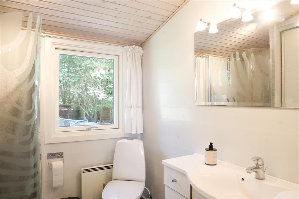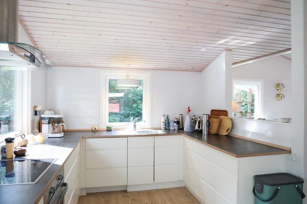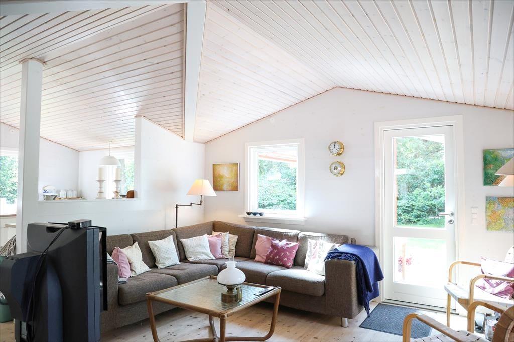 Udendørs kan sommerhusets store træterrasse nydes, her kan du ligge og slikke sol eller fordybe dig i en god bog imens børnene boltrer sig i haven med medbragte havespil. Der er også plads til, at alle kan samles til en god frokost, eller middag om aftenen på den overdækkede afdeling. Sommerhusets store have er godt afskærmet så du og familien kan nyde jeres ferie i fredelige omgivelser. Når du har været nede at bade på den gode sandstrand, er det skønt bare at slænge dig på terrassen og lytte til fuglenes sang eller se på et rådyr der passerer forbi.