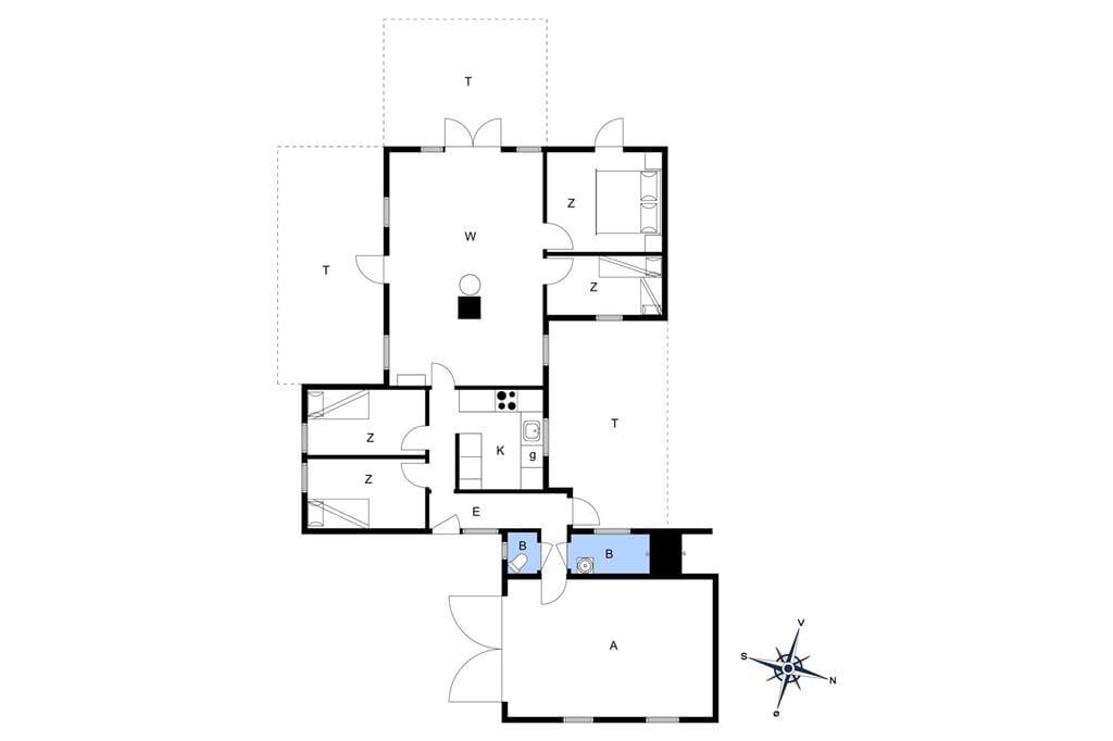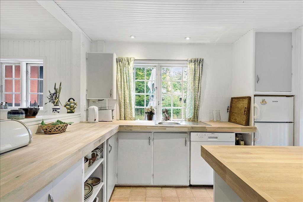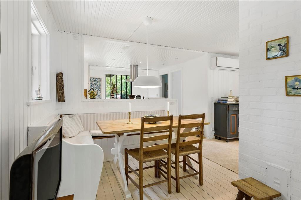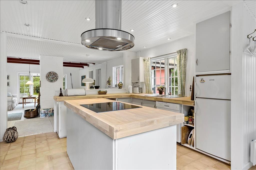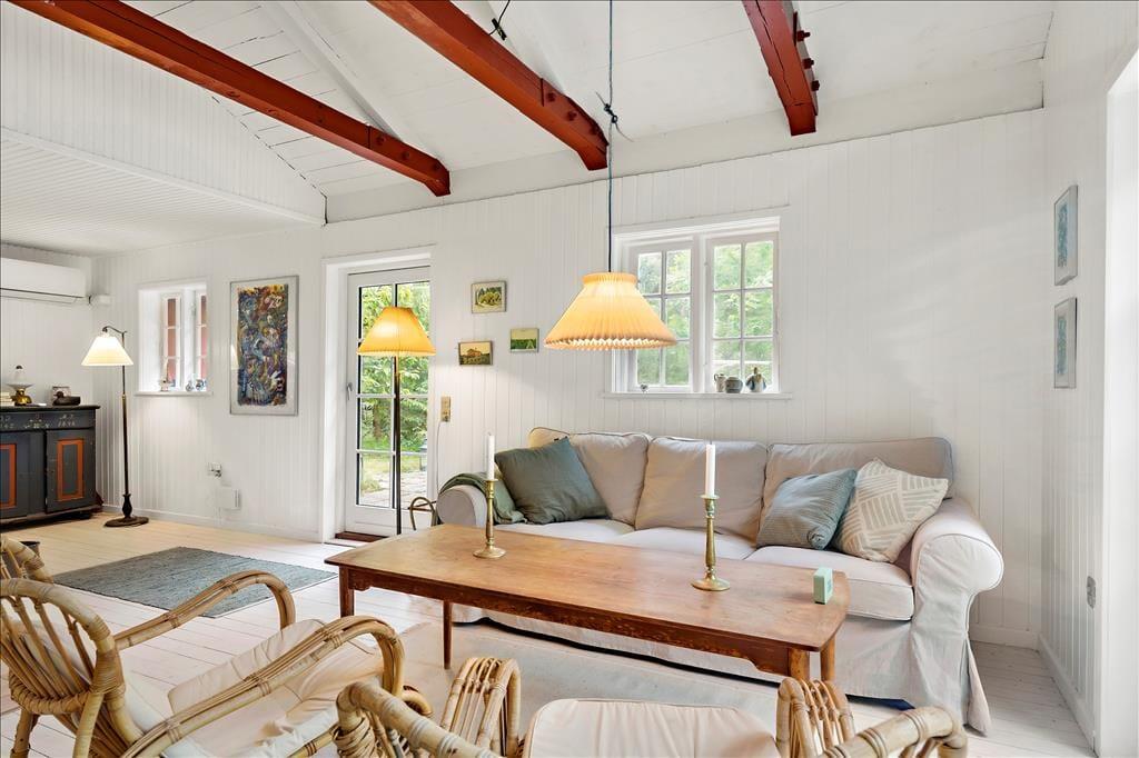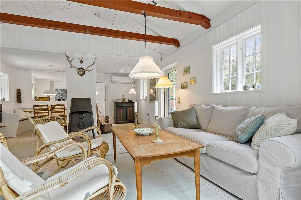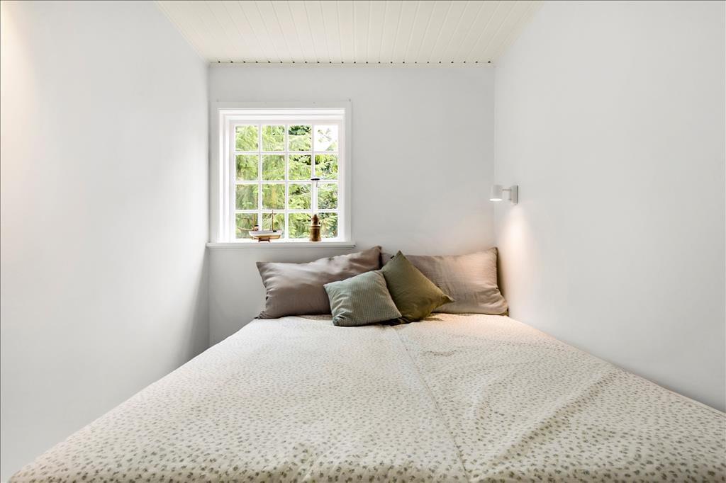Huset indeholder stor stue, køkken/alrum på 55 m2, med direkte adgang til den overdækkede terrasse. Fra stuen er der også udsigt til den charmerende have, hvor rådyrene jævnligt krydser. Der er 4 gode soveværelser de to med køjesenge og de to andre med dobbeltsenge samt god skabsplads. Køkkenet er åbent og indeholder opvaskemaskine. Fra køkkenvinduet, kan du servere eftermiddagskaffen direkte ud på den hyggelige gårdterrasse. Huset indeholder desuden badeværelse med brus, separat toilet og udendørs bruser.