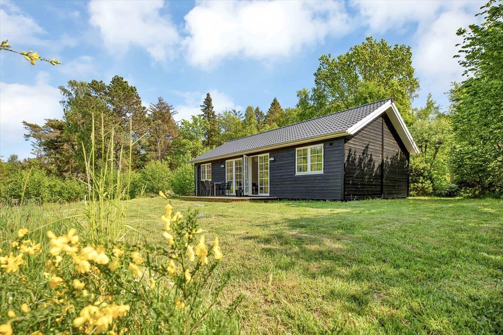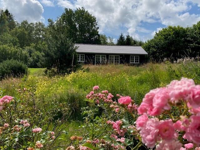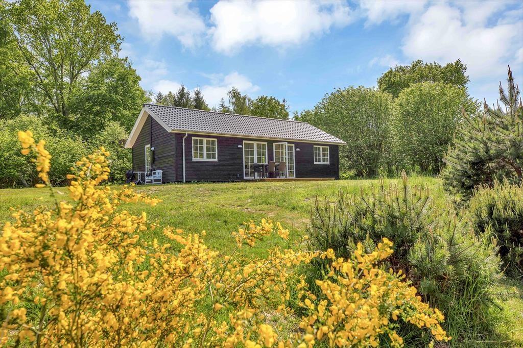 Sommerhuset er smukt beliggende på en lille skovhøj, omgivet af flotte træer, hvilket giver et storslået udsyn fra huset. På grunden løber en lille bæk, hvor en charmerende havebro smukt forbinder de naturlige omgivelser.