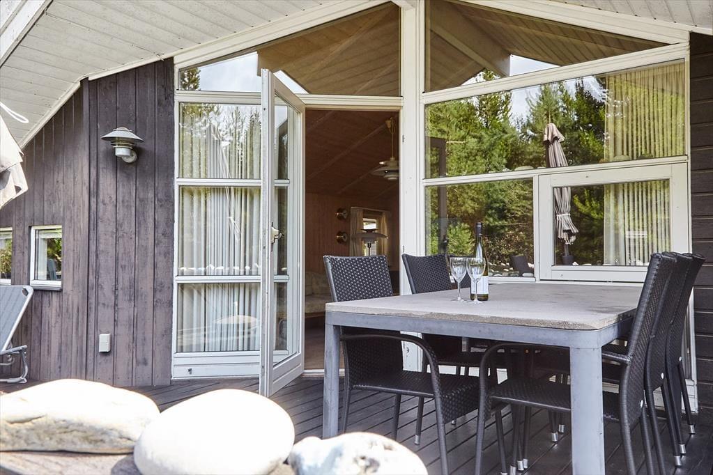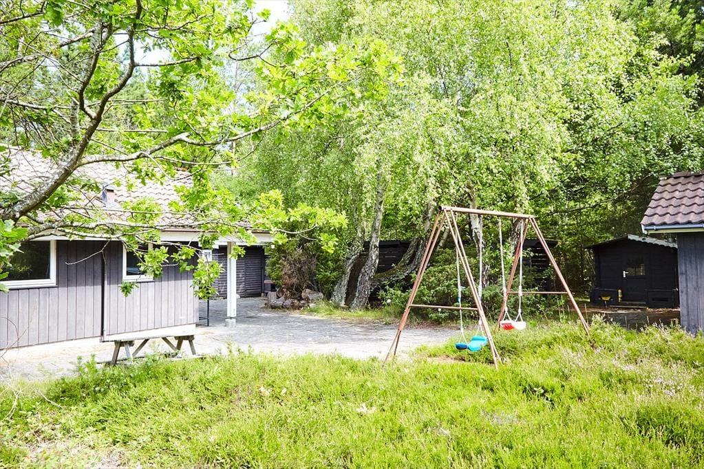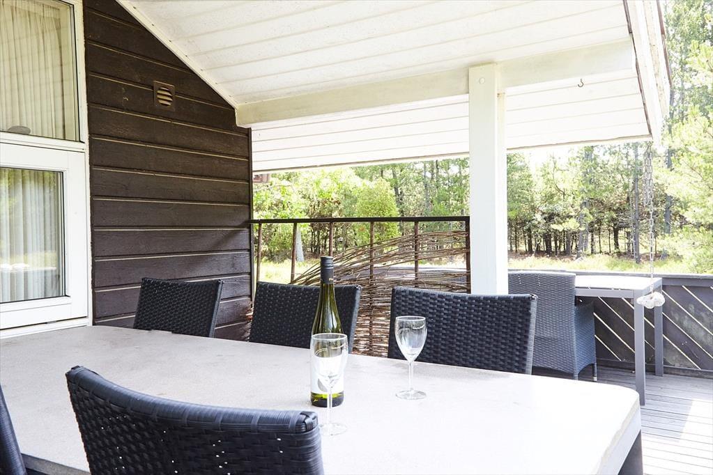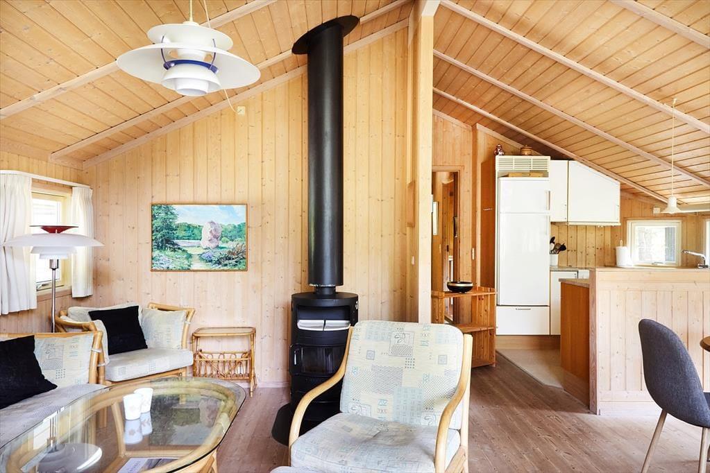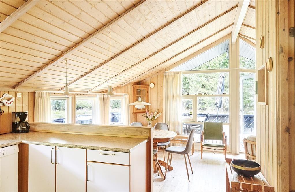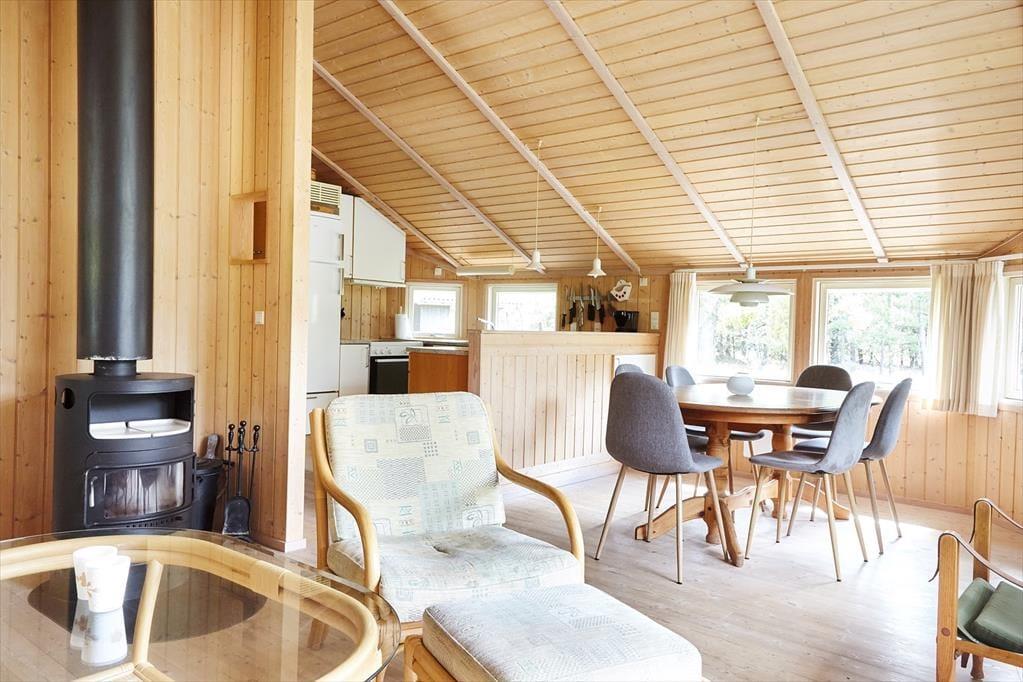 Huset har en dejlig rummelig opholds- og spisestue med åbent køkken og kig ud til terrassen, med den lyngklædte naturgrund. Du kan nemt falde i staver ved bare at sidde eller ligge i sofaen og følge med i vindens susen i træerne, bladenes raslen og dagens vekslende lys og skygge, men hvorfor ikke finde et brætspil, quiz eller kortspil frem og spille nogle timer med hele familien. Når I efter en lang dag med gode oplevelser ude og inde vil finde hvile, falder du hurtigt i søvn i et af de mange soveværelser eller i alkoven.
