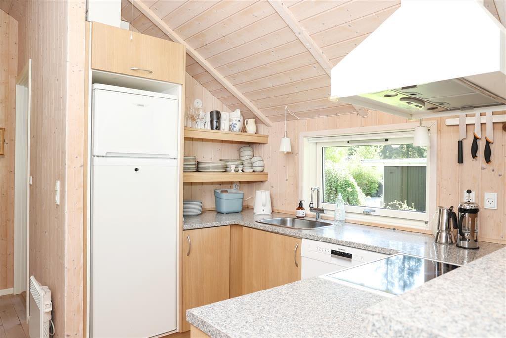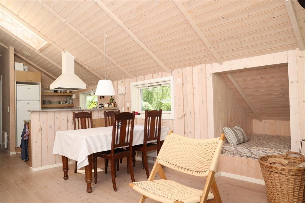 Indendørs mødes du af en hyggelig sommerhusstemning der indbyder til afslapning og hygge. Husets køkken/alrum med loft til kip er samlingspunktet til de hyggelige stunder, her kan I samles om spisebordet og planlægge dagens aktiviteter. I køkken/alrummet er der også en dejlig alkove hvor der kan slappes af med en god bog. Sommerhusets værelser ligger begge lige op til badeværelset der er lyst og indbydende, har gulvvarme og vaskemaskine.