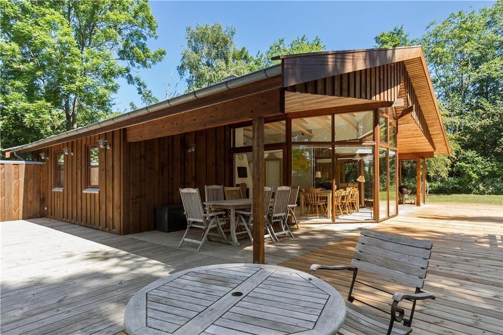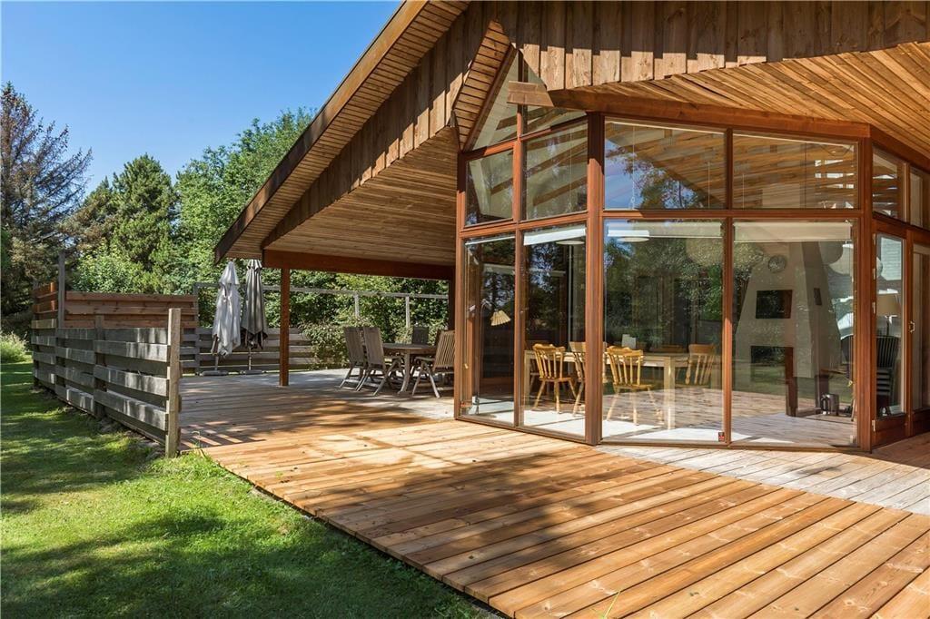 Med afskærmning af den store terrasse hele tre steder, finder du altid et godt sted i læ for vinden at indtage formiddagskaffen eller frokosten, samt forberede grillmaden fra den udendørs grill til aftensmåltidet. Den store grund er omkranset af træer og ligger ud til en åben mark med grantræer, og selvom huset ligger på en hjørnegrund ud til offentlig vej – Bystedvej - er det begrænset, hvad du oplever af trafik herfra.