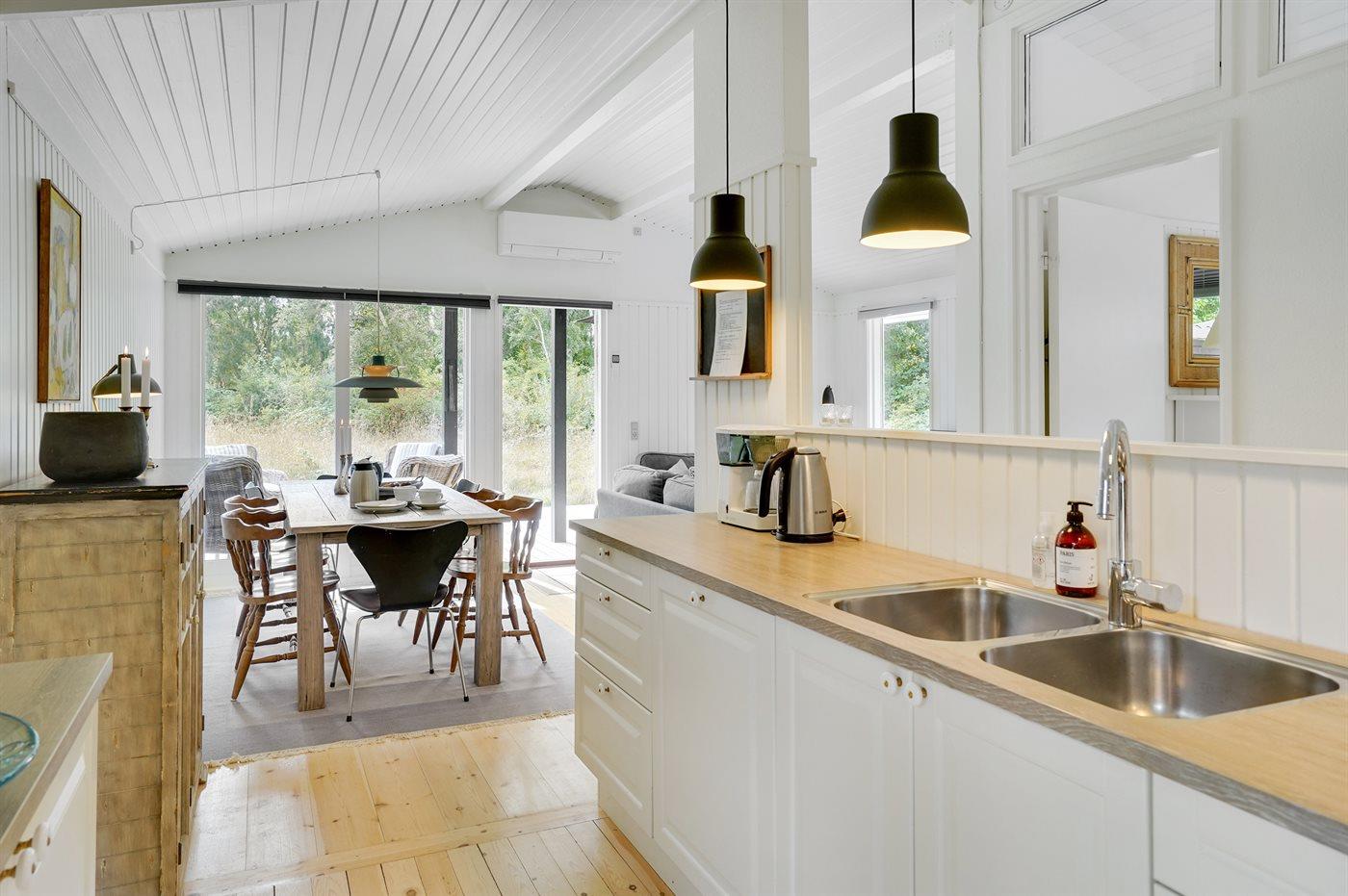 Køkkenet er udstyret med 1 køleskab. Der er 4 induktionskogeplader, varmluftovn, mikrobølgeovn samt opvaskemaskine.