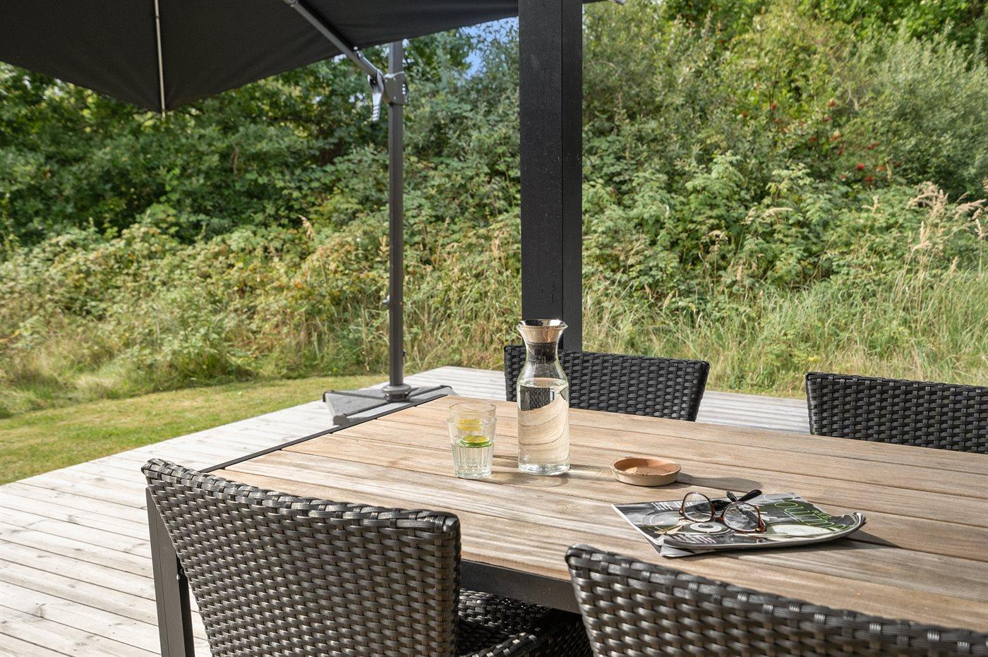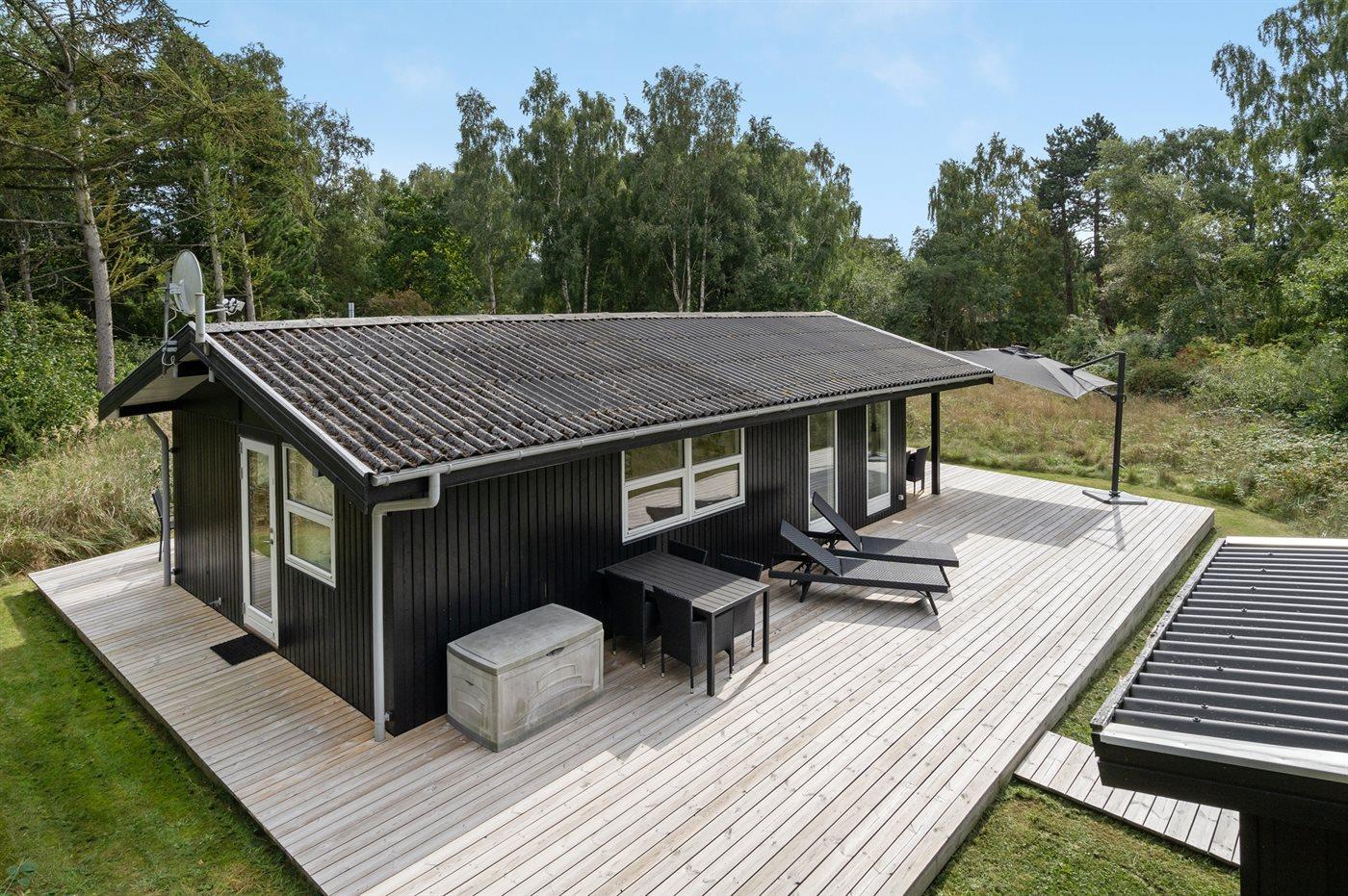 Ferieboligen er beliggende på en 2008 m² stor naturgrund. Der er 275 m til havet. Nærmeste forretning er beliggende i en afstand af 2900 m. Der er en golfbane i en afstand af 12300 m. Til ferieboligen hører 80 m² terrasseareal. Desuden er der 10 m² overdækket terrasse. Der er redskabsrum. Bålsted. Grill til rådighed. Der er installeret stik til opladning af elbil. Type 2 stik. Med 11 kW ladeeffekt. Parkering ved ferieboligen.
