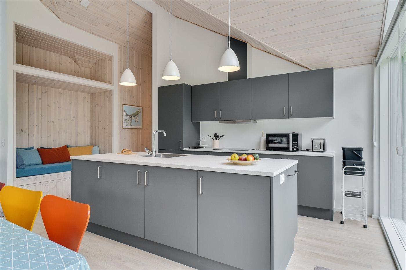 Køkkenet er udstyret med 1 køleskab. Der er 4 induktionskogeplader, varmluftovn, mikrobølgeovn samt opvaskemaskine.