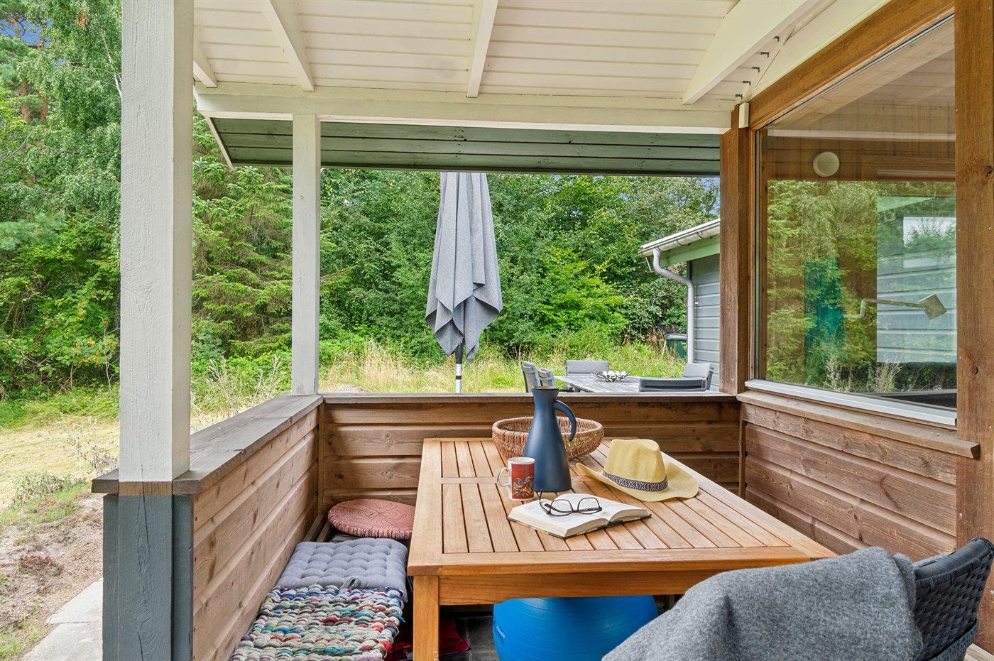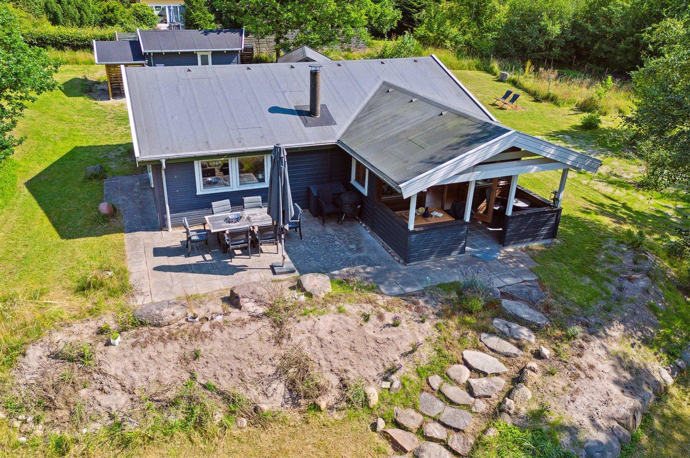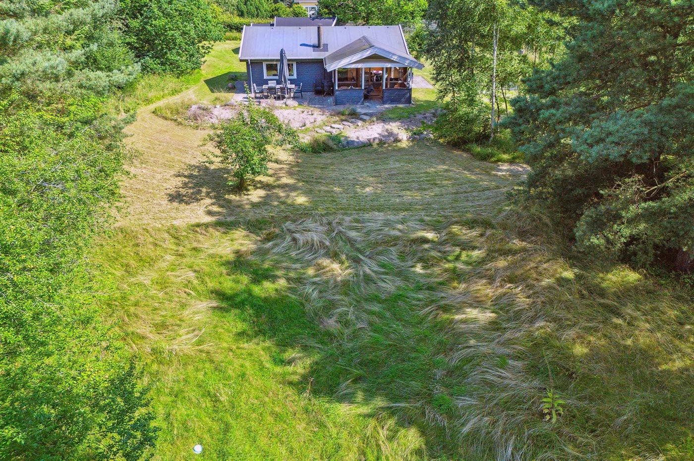 Ferieboligen er beliggende på en 3600 m² stor havegrund. Der er 1200 m til havet. Der er 1250 m til fjorden. Der er en sø i en afstand af 650 m. Nærmeste forretning er beliggende i en afstand af 1750 m. Der er en golfbane i en afstand af 10600 m. Til ferieboligen hører 70 m² terrasseareal. Desuden er der 10 m² overdækket terrasse. Der er mulighed for at tilberede maden udendørs i udekøkkenet. Grill til rådighed. Parkering ved ferieboligen.