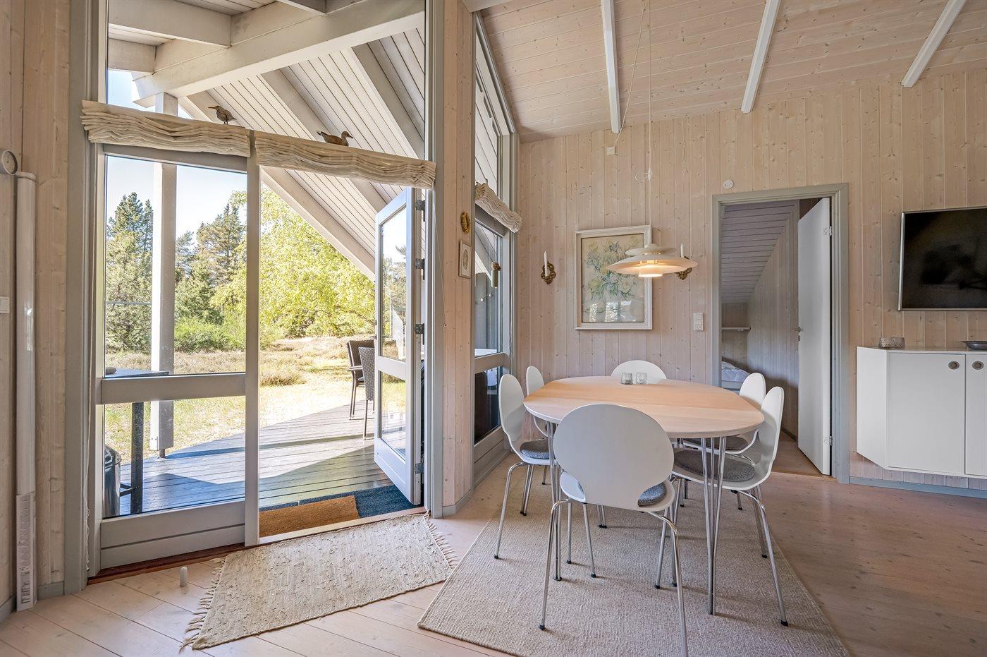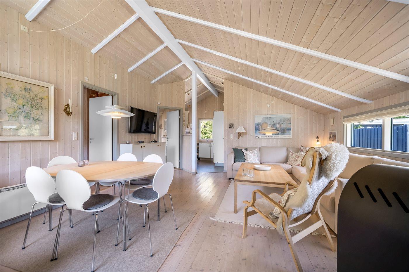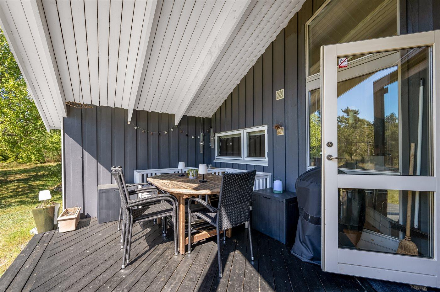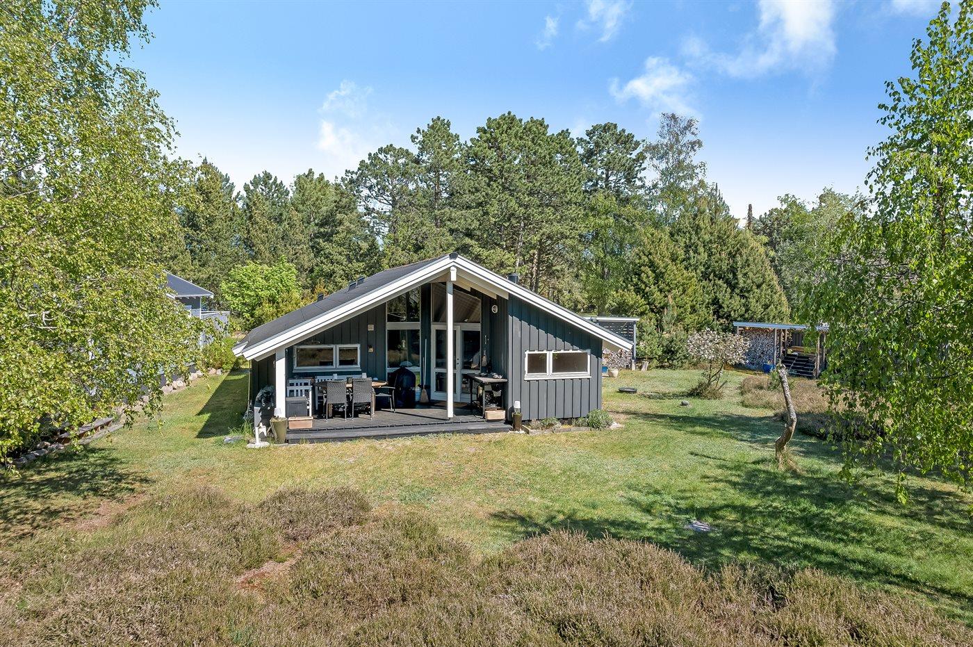 Stue, spiseplads og køkken er ud i ét og herfra er der udgang til en dejlig overdækket terrasse og til den 1722 kvadratmeter store naturgrund med lyng og græs. Der findes 3 soveværelser med hver 2 sovepladser. Badeværelset er med bruseniche og gulvvarme og der findes desuden spa og vaskemaskine.